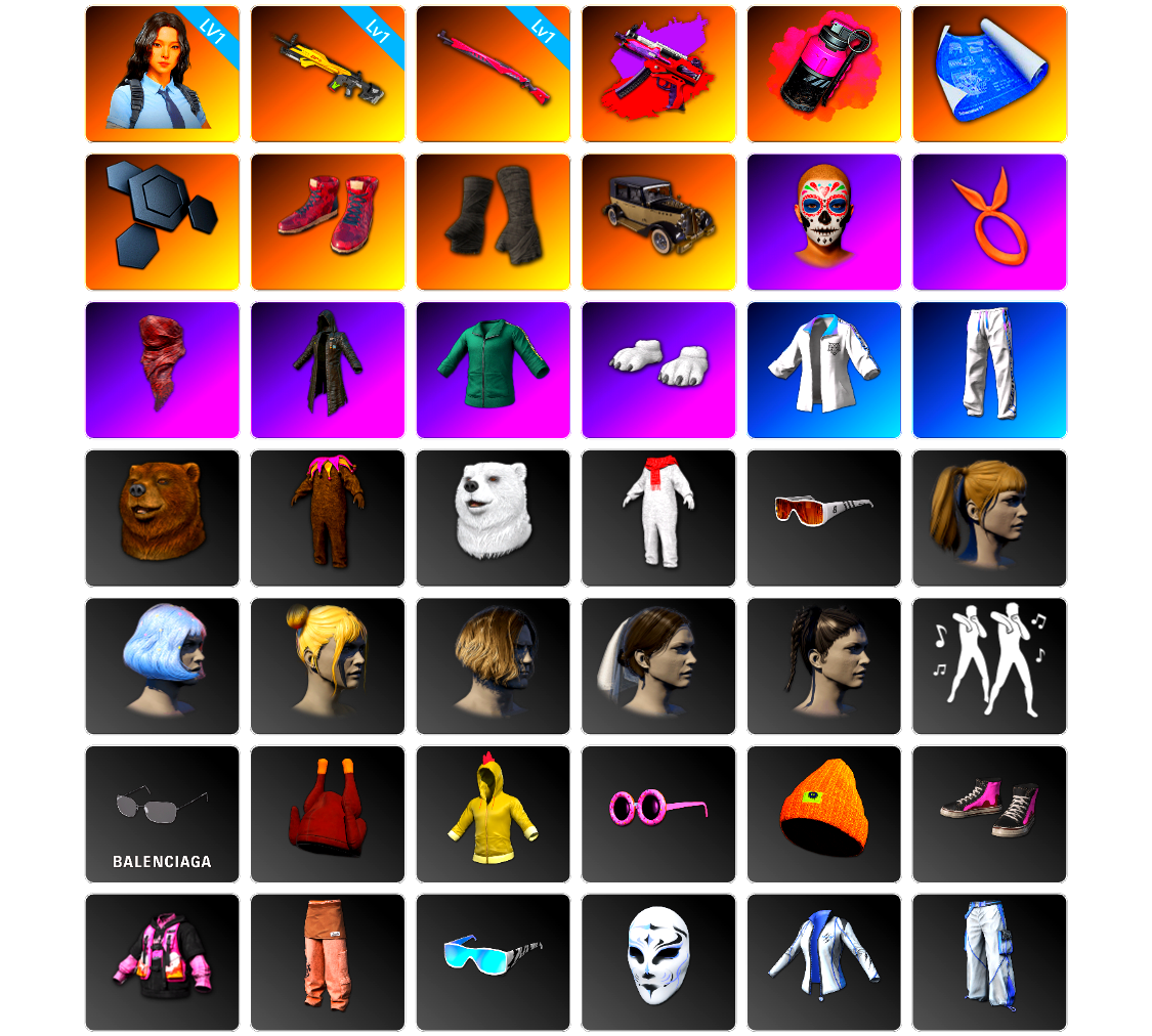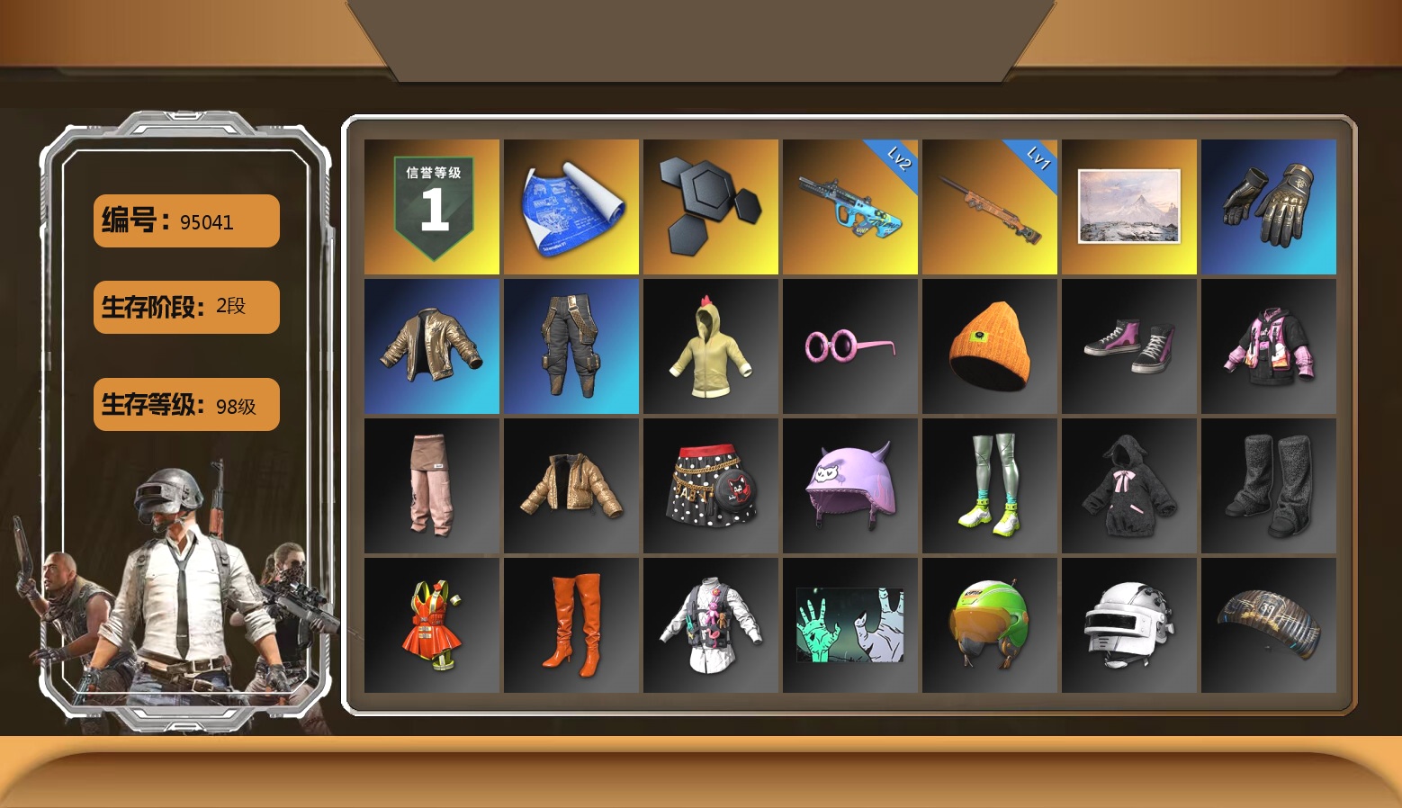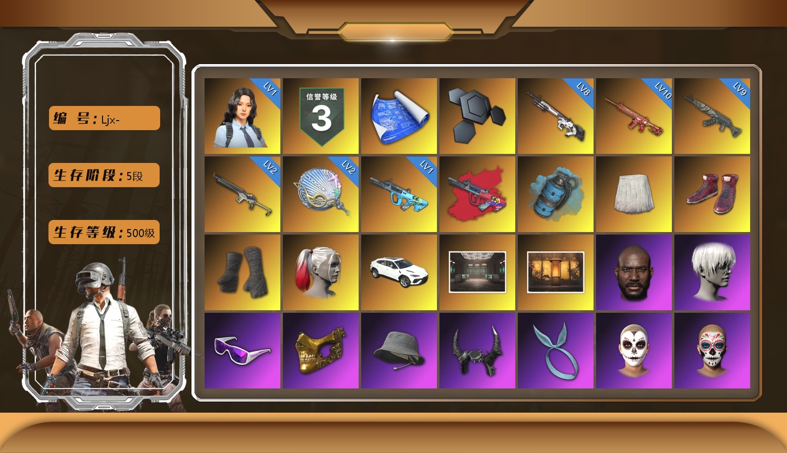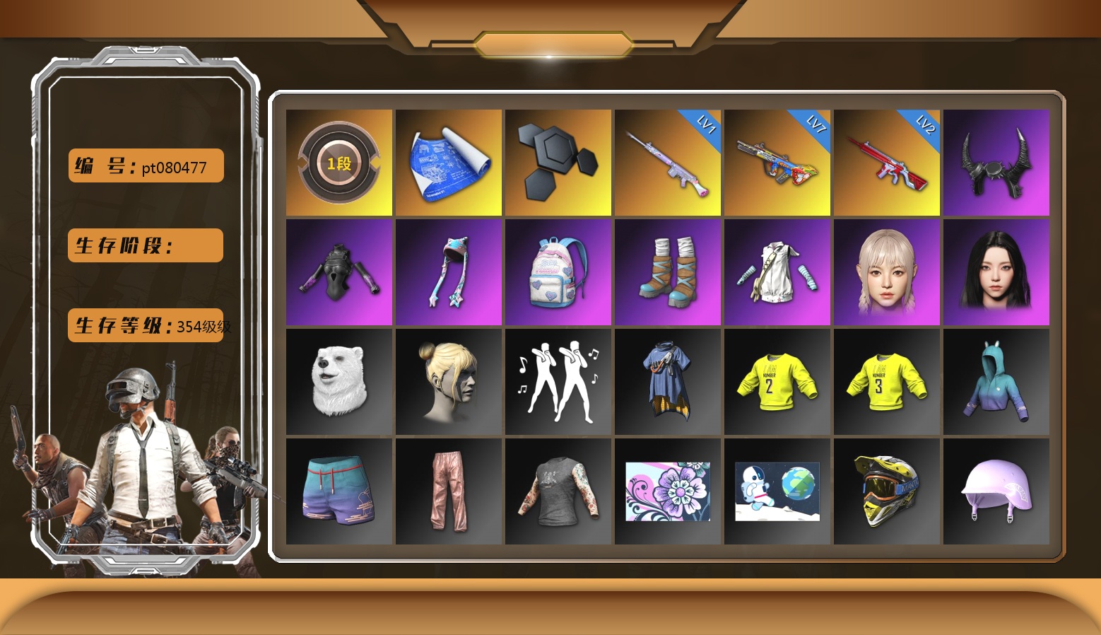爆裂AUG 满级 圣诞AK 满级 午夜惊魂98K 满级 德拉贡 满级 恶魔ACE 满级 美杜莎762 满级 彩虹M24 满级 无信号M4 满级 无重力MP5K 满级 赛博MK12 满级 弥诺陶洛斯AUG 3 猪八戒M4 2 塞壬平底锅 2 时光加农 2 玩偶炮 1 妖魔之触 1 烈日灼烧 1 刻耳柏洛斯M249 1 兰博基尼 阿斯顿马丁DBX 恶魔ACE(异色) 水麒麟(异色) 赛博MK12(异色) 彩虹M24(异色) 午夜惊魂98K(异色) 无重力MP5K(异色) 无信号M4(异色) 德拉贡(异色) 爆裂AUG(异色) 魔咒之力Mk12 阿狸 拉风龙 危险玩偶屋 小叮当 带改名卡 烟雾弹 小兔学院 武器神龛 烟雾枪 胜利密室 兰博大厅 小马尾 黑鬼 金面 9s发型 牛角 尼尔 发光手臂