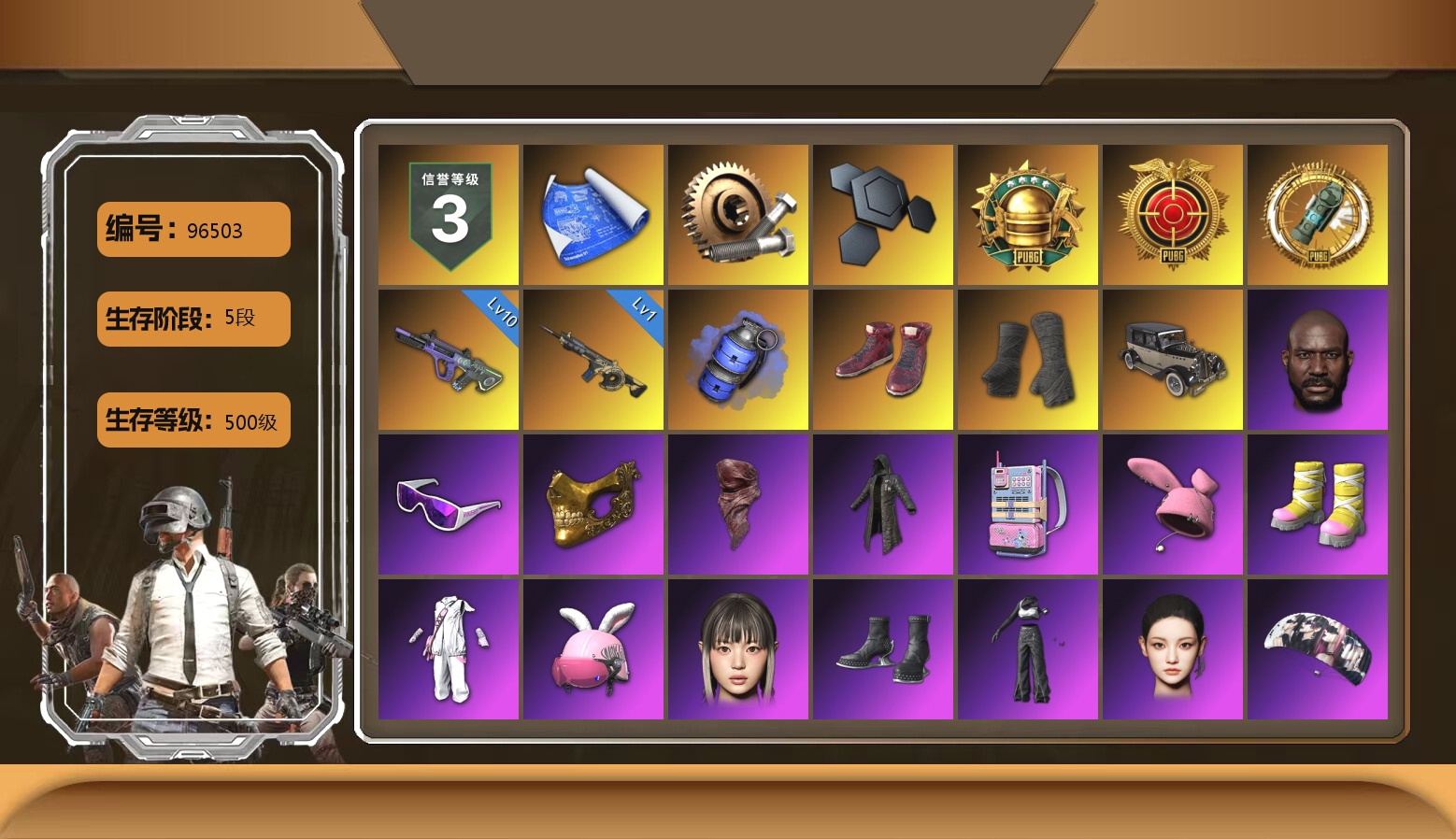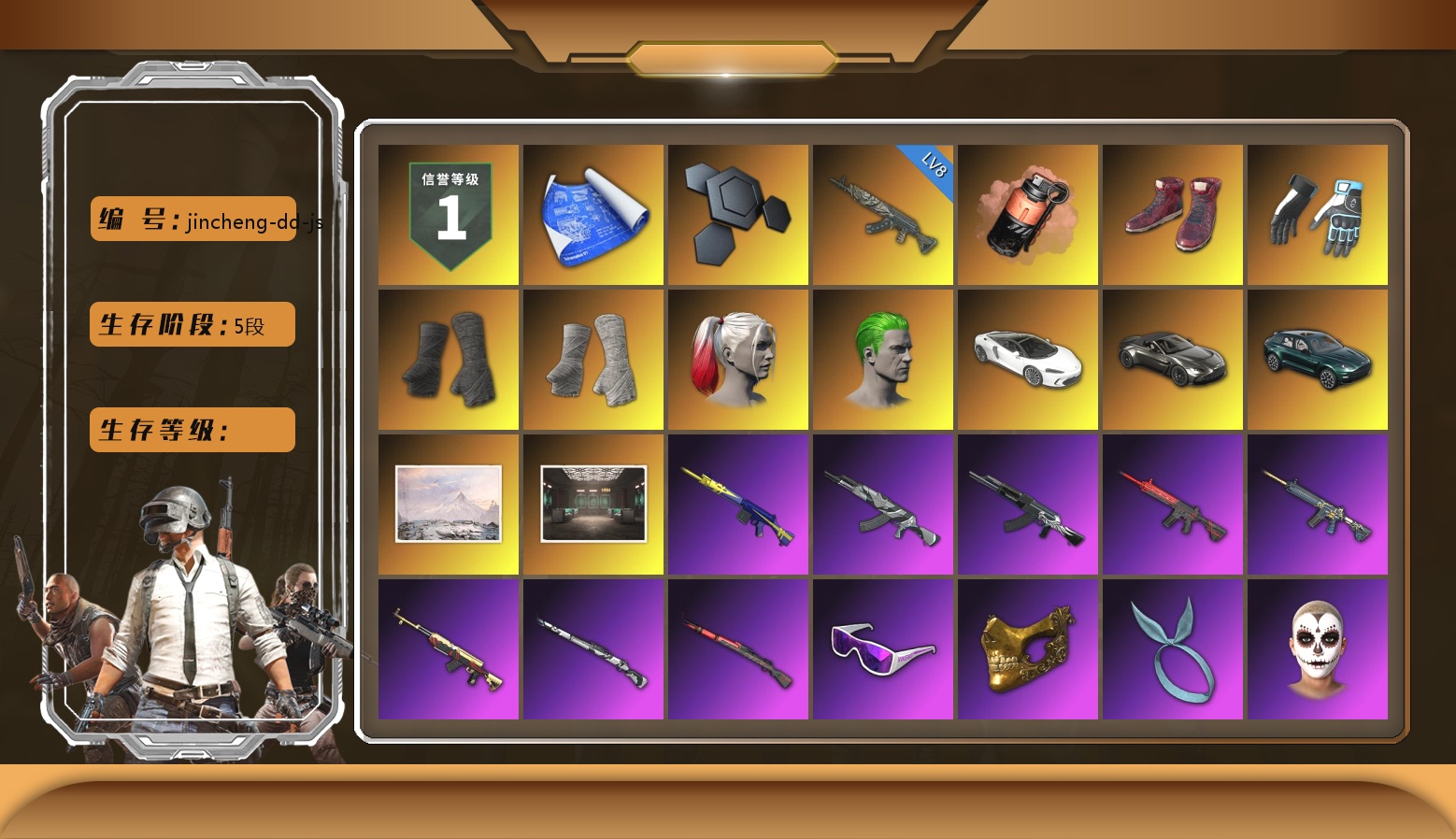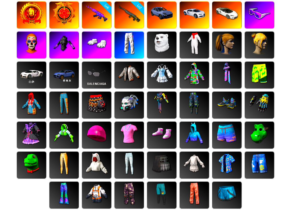 8级青龙762 珊瑚色烟雾弹 柏林鞋 大魔王 黑绷带 白绷带 小丑女 小丑男 迈凯伦硅质白版 马丁跑车 马丁SUV 冬季藏匿处 交易所接待室 1张图纸 1304聚合物 滑雪镜 金面 康萨斯 卡崔娜 丑男妆容 橙色发带 红面巾 黑大衣 白战神 发光手臂 竞猜裤 萨芬裤 橙运动 监狱服 渐变装 滑雪帽 小马尾 小绿头 粉头 丸子头 脏辫 小兔学院 悲喜 绷带AK 枪炮洗礼