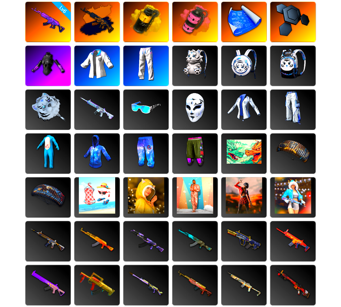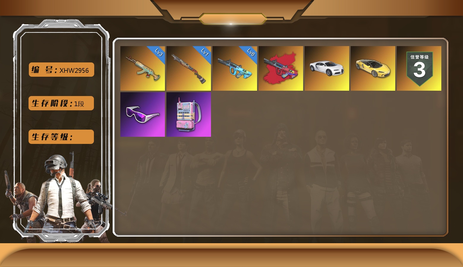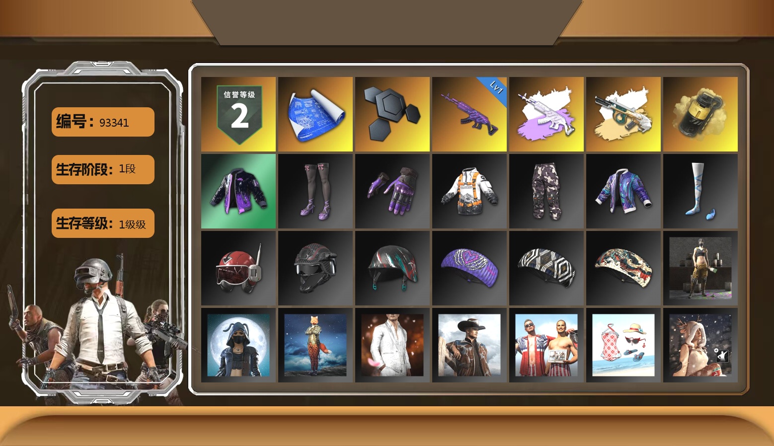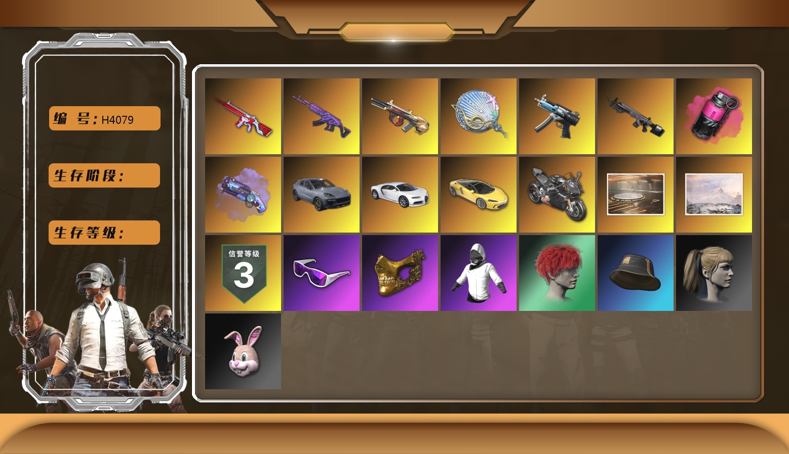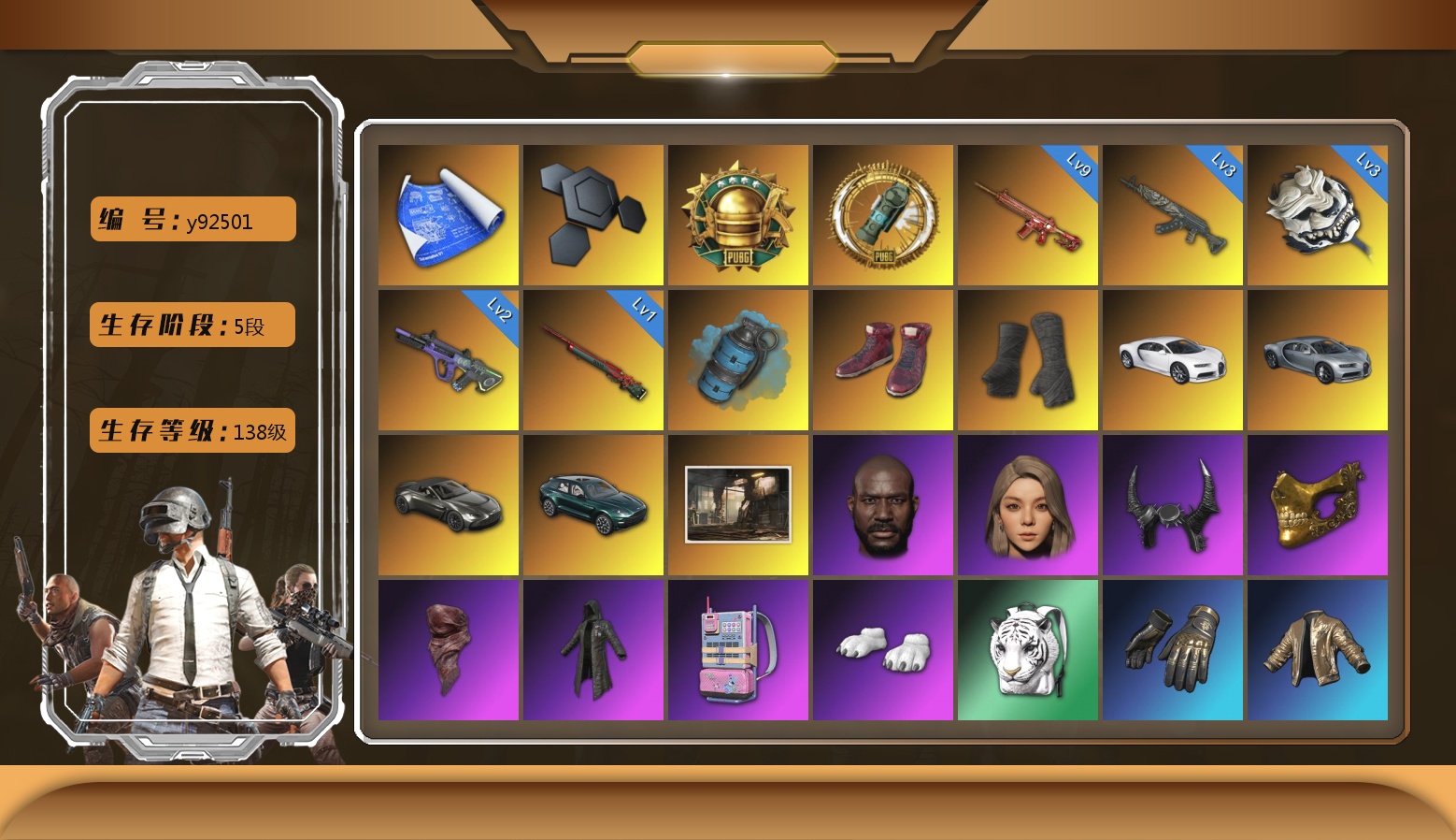4张图纸 7038聚合物 9级朱雀M4 3级青龙762 3级白虎锅 2级霓虹AUG 1级孙悟空M24 天蓝色烟雾弹 柏林鞋 黑绷带 布加迪跑车 布加迪奢华版跑车 马丁跑车 马丁SUV 黑鬼 牛角 金面 红面巾 黑大衣 电磁背包 白熊鞋 拉风龙 小马尾 丸子头 脏辫 青海摇 小兔学院 西游记 绷带AK