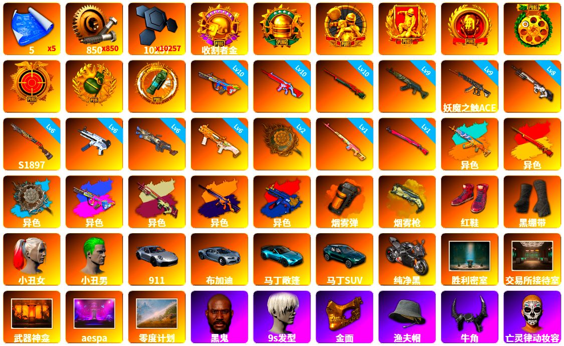 5张图纸 蜗牛币 10257聚合物 收割者金标 10级爆裂AUG 10级无信号M4 10级孙悟空M24 9级青龙762 9级妖魔之触ACE 8级赛博MK12 6级烈日灼烧-S1897 6级无重力MP5K 6级刻耳柏洛斯M249 6级DBS 2级唐三藏平底锅 1级德拉贡 1级午夜惊魂98K 青龙762(异色) 孙悟空M24(异色) 唐三藏(异色) 爆裂AUG(异色) 赛博MK12(异色) 无信号(异色) MP5K(异色) 橘色烟雾弹 乳白狂怒之雾-M79 柏林鞋 黑绷带 小丑女 小丑男 保时捷911 布加迪奢华版跑车 马丁敞篷跑车 马丁SUV 杜卡迪纯净黑 胜利密室 交易所接待室 武器神龛 aespa 黑鬼 9s发型 金面 渔夫帽 牛角 丑男妆容 红面巾 黑大衣 白战神 小战神 活动绿东 发光手臂 电磁背包 白熊鞋 小叮当 粉战神 aespa女团 尼尔 拉风龙 (奢华版)科米特绿 车漆 小马尾 丸子头 西游记 脏辫 青海摇 小兔学院 悲喜 PGC 2021套装