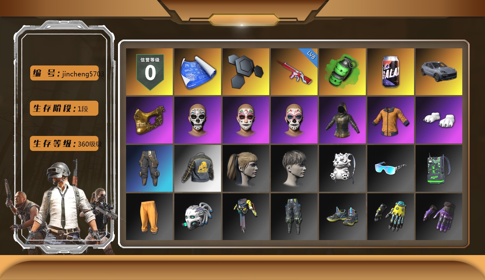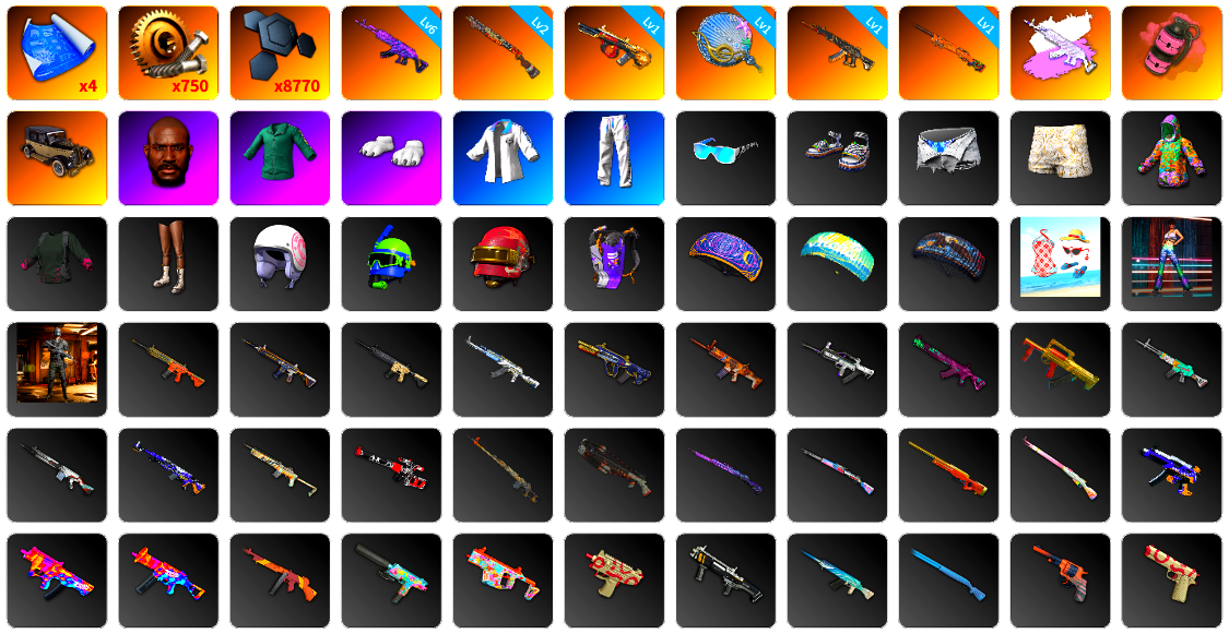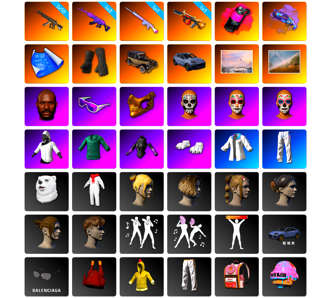 5级瀚娜 收割者金标 捕食者金标 10张图纸 蜗牛币 12718聚合物 10级青龙762 10级孙悟空M24 10级爆裂AUG 10级南瓜M4 10级小兔MK12 10级齿轮炮 8级猛虎98k 6级沙悟净MINI 6级圣诞AK 6级DBS 2级刻耳柏洛斯M249 2级唐三藏平底锅 1级恶魔ACE 1级玄武SKS 1级德拉贡 1级无重力MP5K 1级美杜莎762 1级烈日灼烧-S1897 青龙762(异色) 孙悟空M24(异色) 小兔MK12(异色) 圣诞AK(异色) 唐三藏(异色) 紫色烟雾弹 蓝色烟雾弹 品红色烟雾弹 湛蓝狂怒之雾-M79 柏林鞋 黑绷带 小丑女 小丑男 保时捷911 保时捷卡宴 兰博基尼跑车 兰博基尼SUV 兰博基尼奢华版 马丁跑车 马丁敞篷跑车 马丁SUV 女团大厅 陈列室 兰博大厅 冬季藏匿处 交易所接待室 武器神龛 黑鬼 MINJI 9s发型 金面 渔夫帽 牛角 康萨斯 卡崔娜 丑男妆容 橙色发带 红面巾 黑大衣 白战神 黄东 活动绿东 发光手臂 竞猜裤 电磁背包 萨芬裤 白熊鞋 粉战神 2024女团 aespa女团 阿狸 小黄鸭 可可 尼尔 布朗熊 拉风龙 车漆 (奢华版)科米特绿 小马尾 小绿头 粉头 丸子头 西游记 脏辫 爱的主打歌 青海摇 小兔学院 悲喜 绷带AK 滑雪帽 PGC 2021套装 胜利之舞39