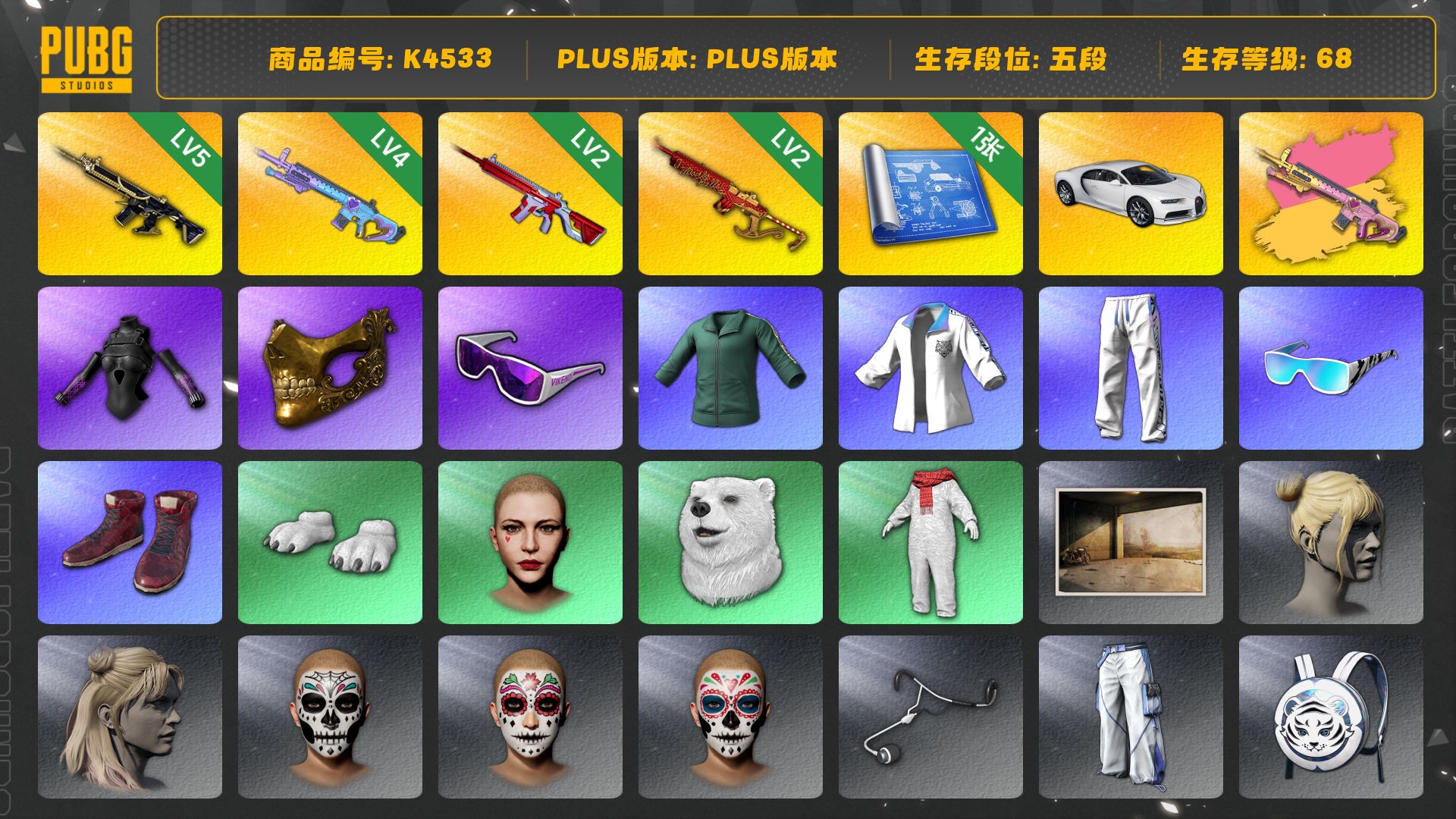 [K4533]5段68级 信誉3 5级八戒 4级魔咒+异色 2级无信号 2级圣诞mini 布加迪 发光手 小绿东 白熊脚 丸子头 金面 滑雪镜