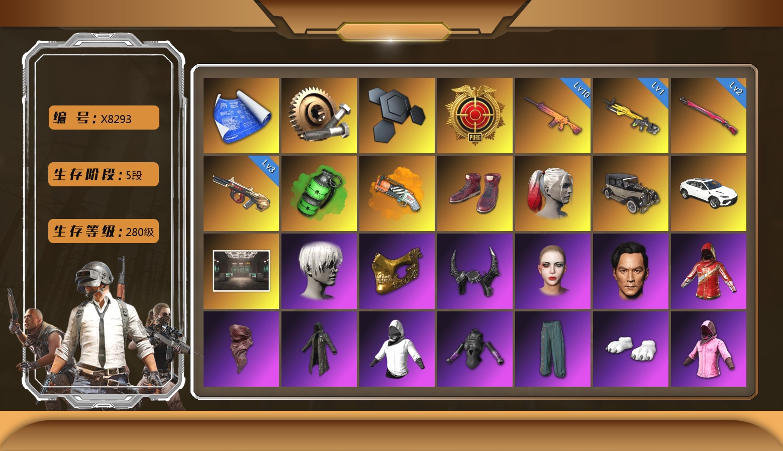 ❤找回包赔❤编号X8293皮肤:神枪手金 2张图纸 蜗牛币 10000聚合物 10级南瓜M4 3级弥诺陶洛斯AUG 2级午夜惊魂98K 1级小兔MK12 翡翠色烟雾弹 橙色狂怒之雾-M79 柏林鞋 小丑女 逃亡SUV 兰博基尼SUV 交易所接待室 9s发型 金面 牛角 丑女妆容 吴彦祖 17战队夹克 红面巾 黑大衣 白战神 发光手臂 萨芬裤 白熊鞋 粉战神 星魂猛虎下山运动夹克 星魂猛虎下山运动裤 阿狸 尼尔 拉风龙 PJS夹克 Aixleft 杂技熊头套 杂技熊玩偶服 发型43 丸子头 发型21 发型61 脏辫 发型24 爱的主打歌 青海摇 人型看板 唯一甜甜圈背包(3级) 果酱甜甜圈 - 头盔(3级) 暴躁花生墨镜 釉彩甜甜圈面具 暴躁花生针织帽 甜甜圈遮阳帽 釉彩甜甜圈衬衫 釉彩甜甜圈手套 甜甜圈手套 釉彩甜甜圈运动鞋 暴躁花生运动鞋 甜甜圈运动鞋 甜甜圈短裤 暴躁花生连帽卫衣 暴躁花生长裤 甜甜圈上衣