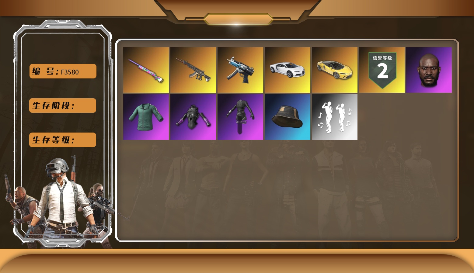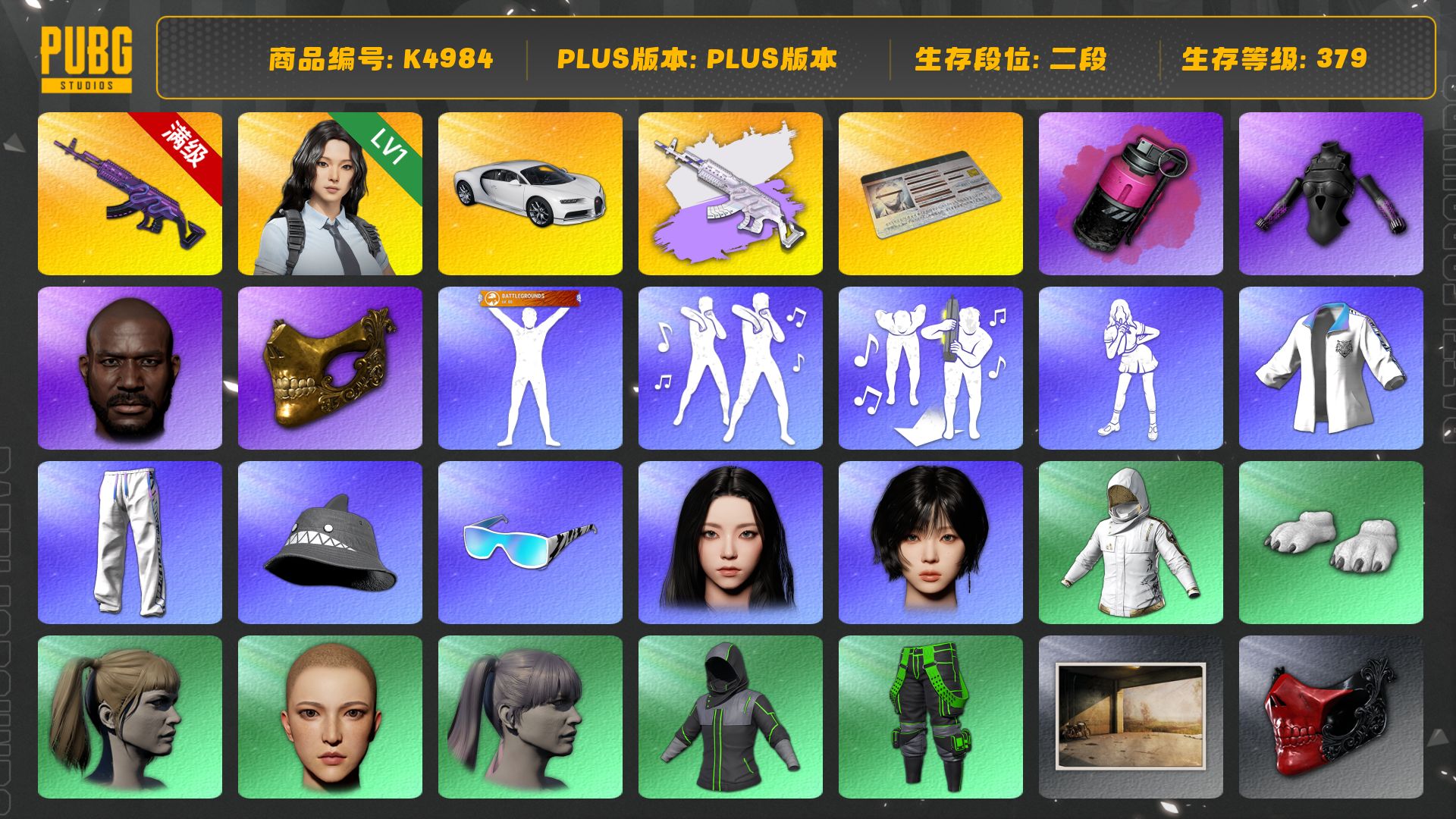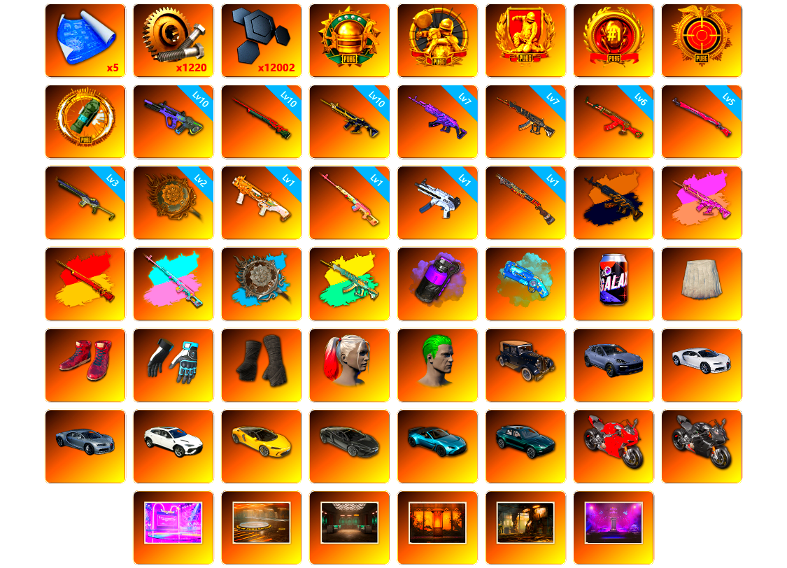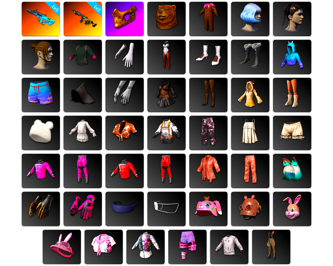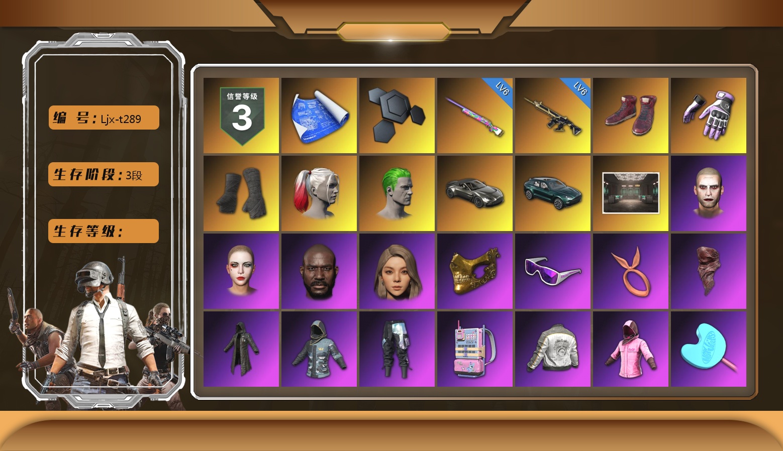 6级彩虹M24 6级猪八戒M4 柏林鞋 小黑盒 黑绷带 小丑女 小丑男 马丁跑车 马丁SUV 交易所接待室 1张图纸 4008聚合物 丑男妆容 黑鬼 金面 滑雪镜 橙色发带 红面巾 黑大衣 小战神 竞猜裤 电磁背包 粉战神 尼尔 拉风龙 小马尾 小绿头 丸子头 脏辫 小兔学院 悲喜 绷带AK