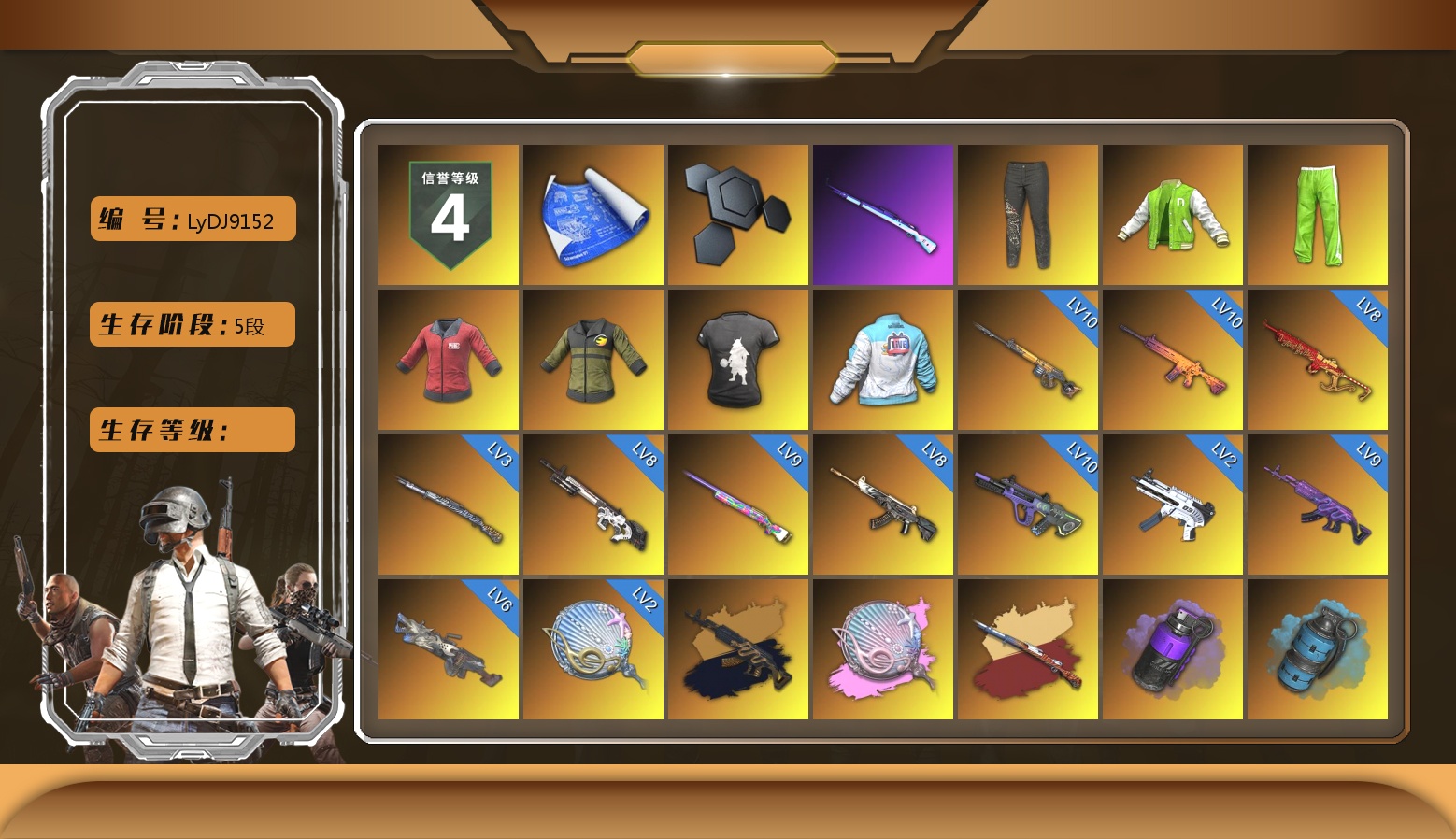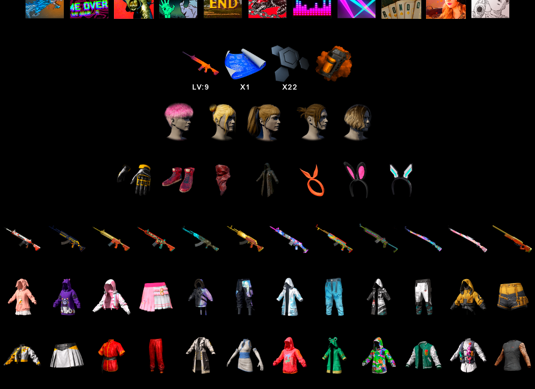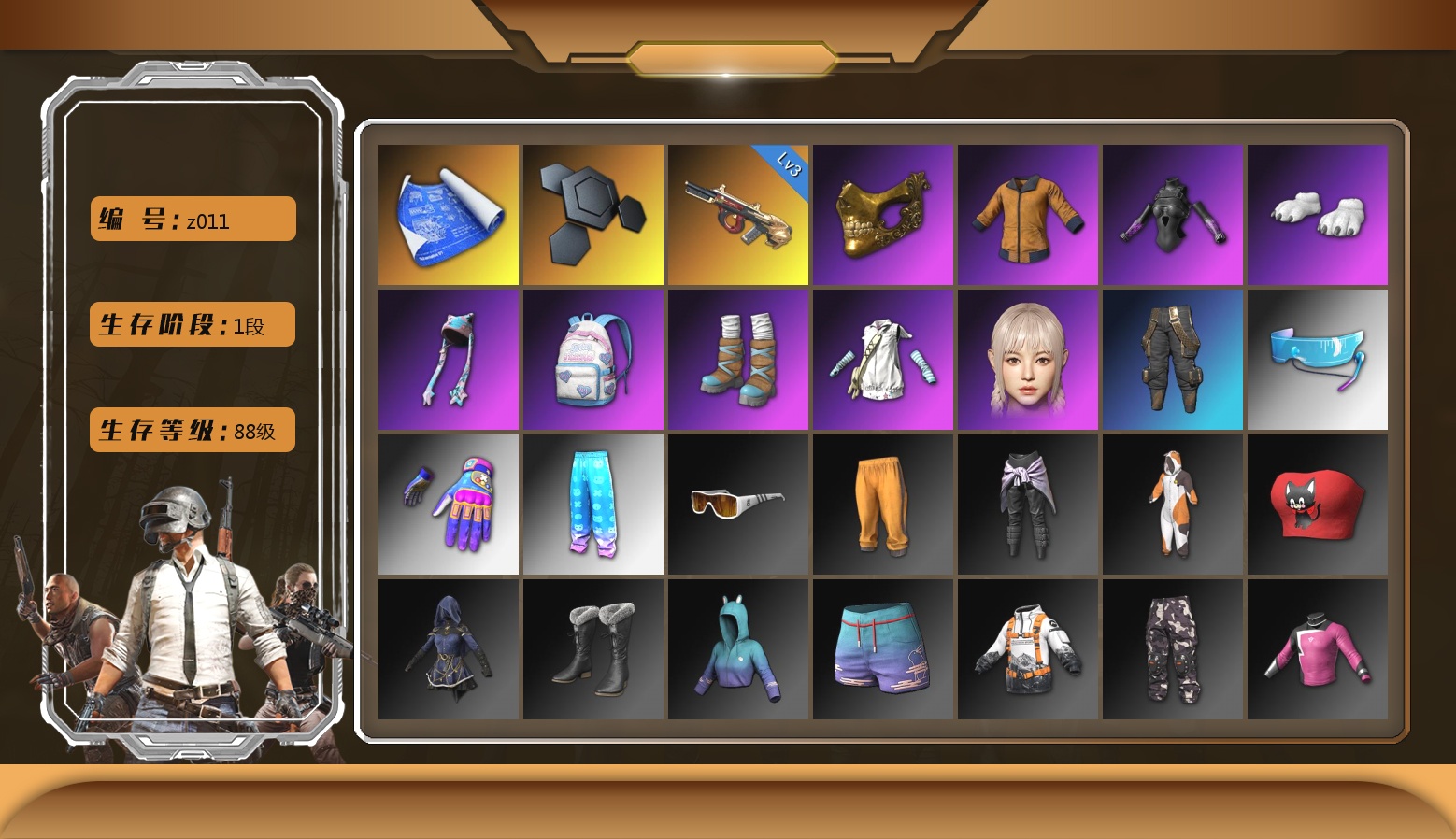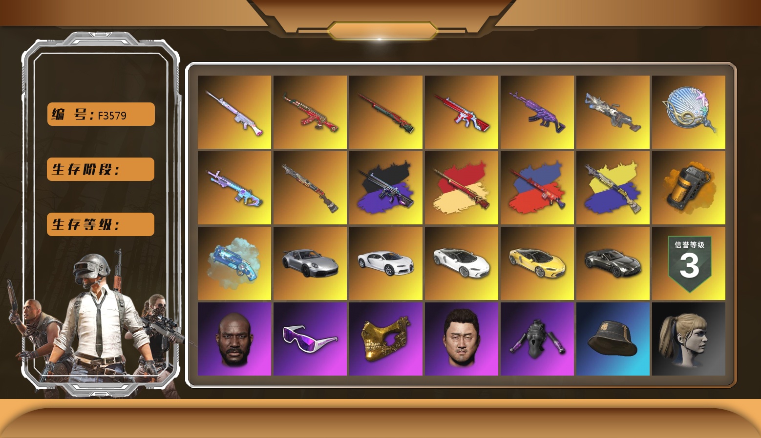 无信号M4 满级 烈日灼烧 满级 圣诞AK 满级 孙悟空M24 满级 美杜莎762 满级 塞壬平底锅 2 玩偶炮 1 刻耳柏洛斯M249 1 阿斯顿马丁V12 迈凯伦 布加迪 保时捷911跑车 无信号异色 烈日灼烧异色 无信号M4(异色) 玩偶屋异色 孙悟空M24(异色) 魔咒之力Mk12 烟雾弹 带改名卡 拉风龙 小兔学院 小马尾 危险玩偶屋 金面 滑雪镜 黑鬼 发光手臂 马东锡 小兔手套