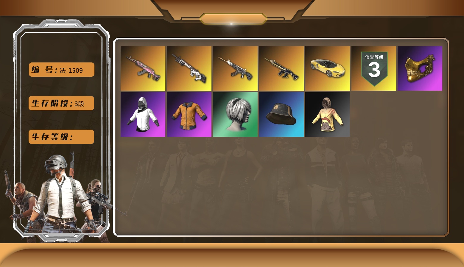 法-1509 1102级 信誉等级3 齿轮762 10级 赛博朋克mk12 4级 猪八戒m4 2级 独角兽m24 猎手ace 时光sks 兰博基尼suv 悲喜套 尼尔套 悲喜战神套 2021pgc黄金面具 拉风龙套 黄东南亚 白战神
