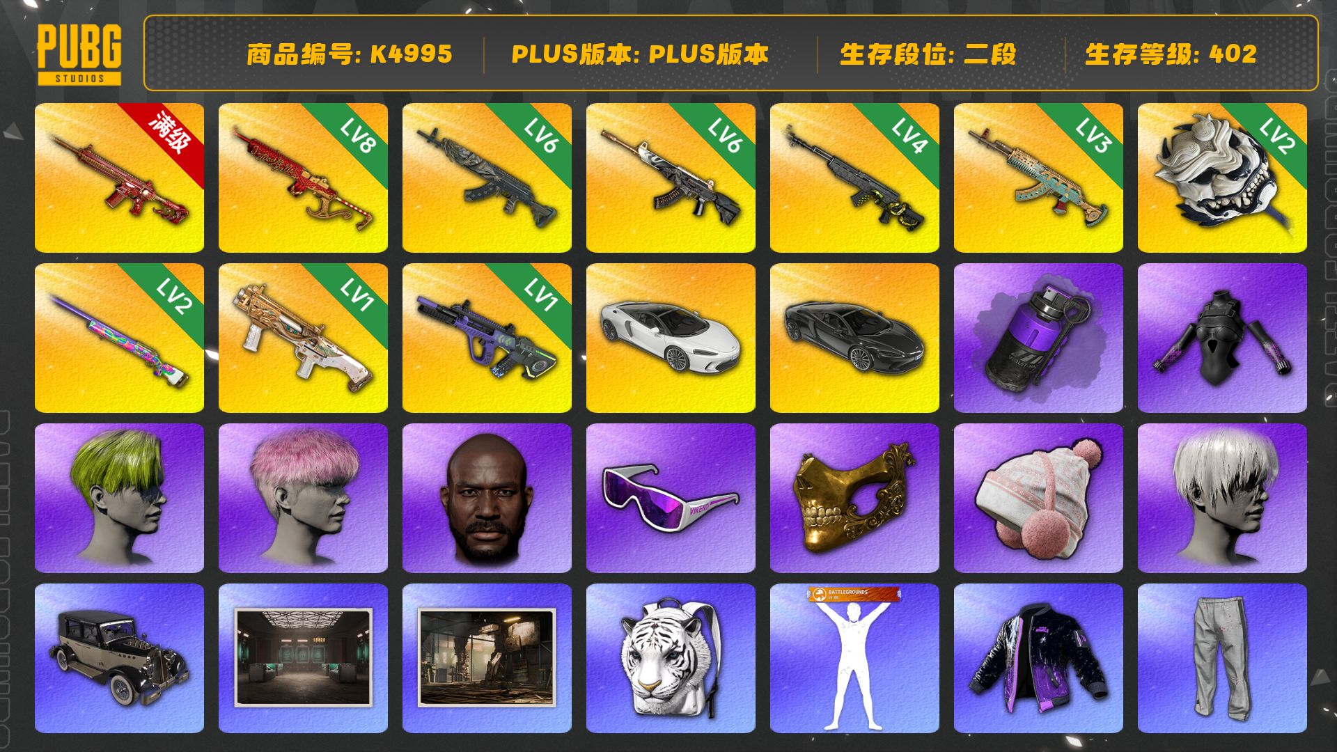 [K4995]2段402级 信誉3 10级朱雀 8级圣诞mini 6级青龙 6级恶魔 4级玄武 3级水麒麟 2级白虎 2级彩虹 1级dbs 1级霓虹 烟弹 双迈凯伦