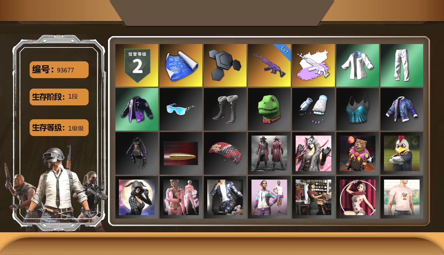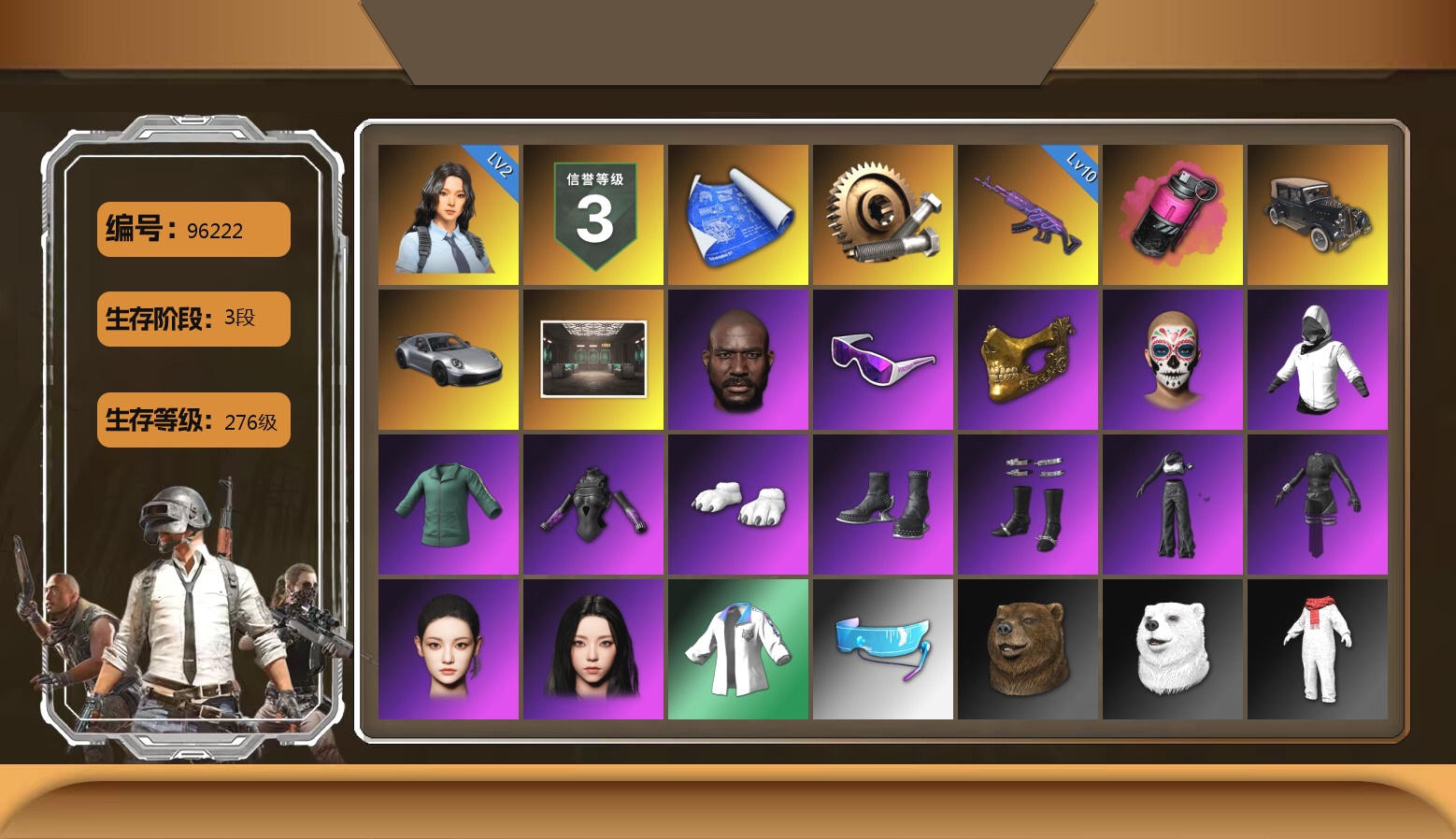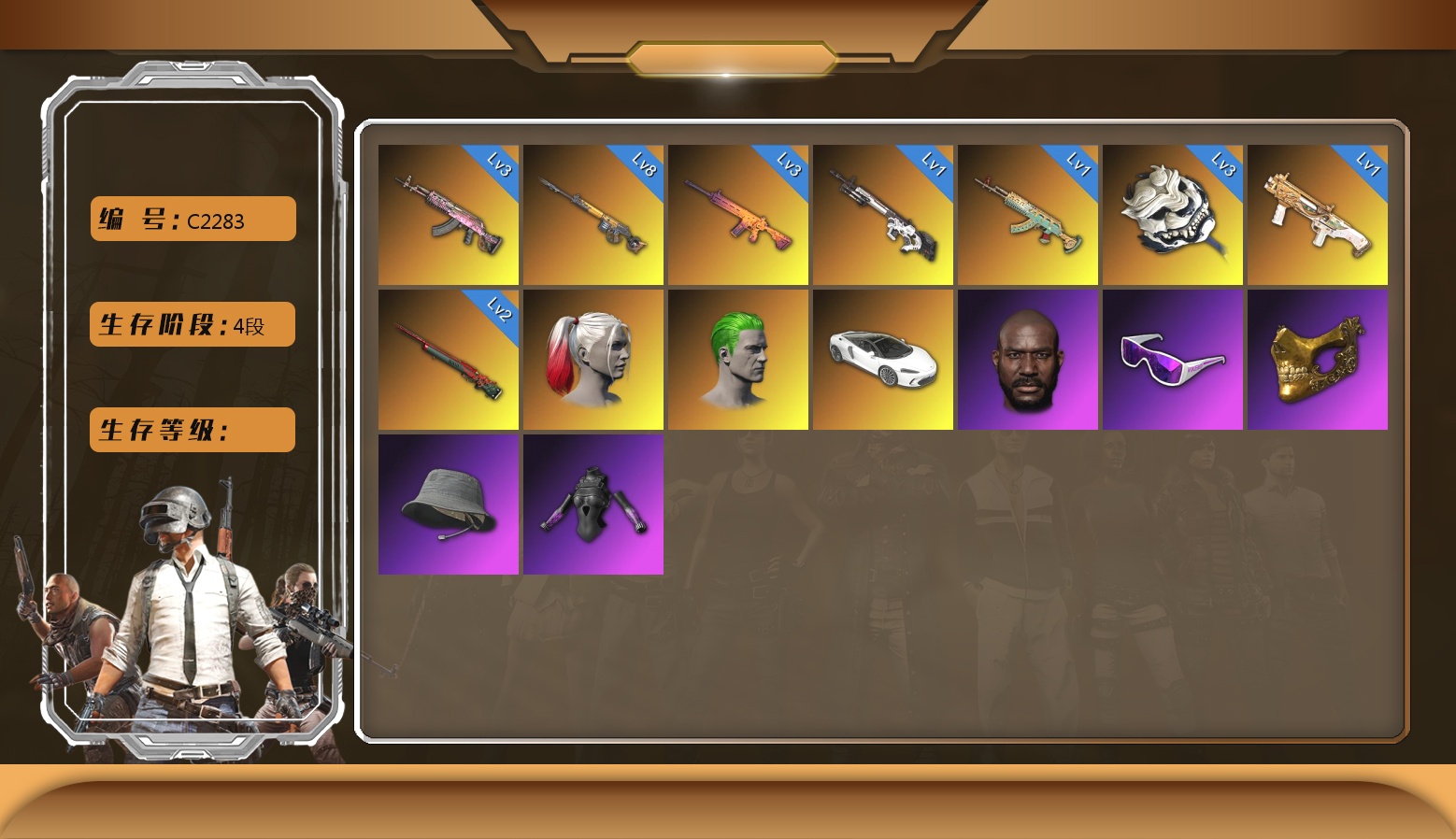 4阶段 8级齿轮炮 3级火麒麟 3级南瓜M4 2级孙悟空M24 1级水麒麟 1级DBS 1级赛博MK12 3级白虎锅 迈凯伦白色 双头小丑男 小丑女 黑鬼 金面 小绿头 小马尾 烟雾弹 滑雪镜 渔夫帽