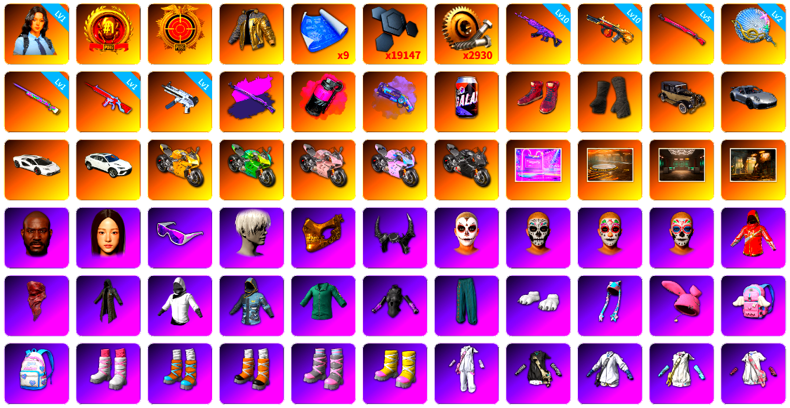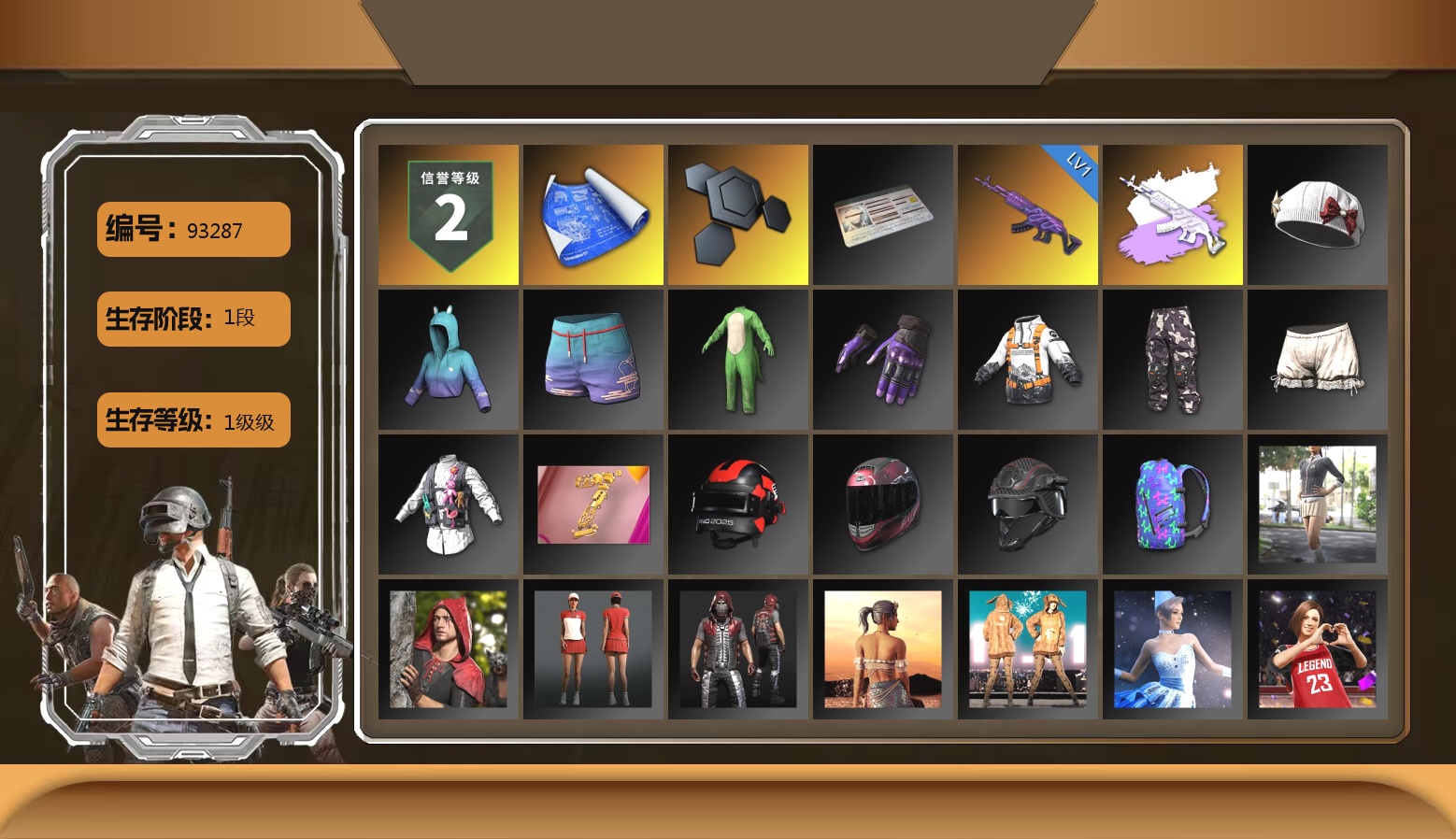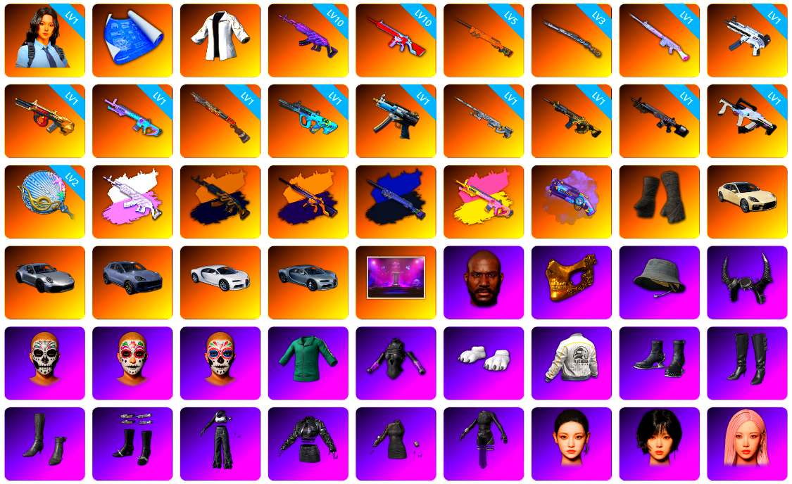 1级瀚娜 1张图纸 10级美杜莎762 10级无信号M4 5级夜曲M24 3级猛虎98k 1级玩偶炮 1级无重力MP5K 1级弥诺陶洛斯AUG 1级魔咒之力Mk12 1级烈日灼烧-S1897 1级GD-AUG 1级寒蚀MP5K 1级幽影残魂AWM 1级时空使者M4 1级暗影之主Mk12 1级冰域Groza 2级塞壬平底锅 美杜莎(白异色) 美杜莎(黑异色) 无信号(黄异色) 夜曲M24(异色) 魔咒Mk12(异色) 紫色魔法迷雾-M79 黑绷带 帕拉梅拉 保时捷911 保时捷卡宴 布加迪跑车 布加迪奢华版跑车 aespa 黑鬼 金面 渔夫帽 牛角 活动绿东 发光手臂 白熊鞋 aespa女团 小马尾 脏辫 小兔学院 西游记 滑雪帽 胜利之舞39