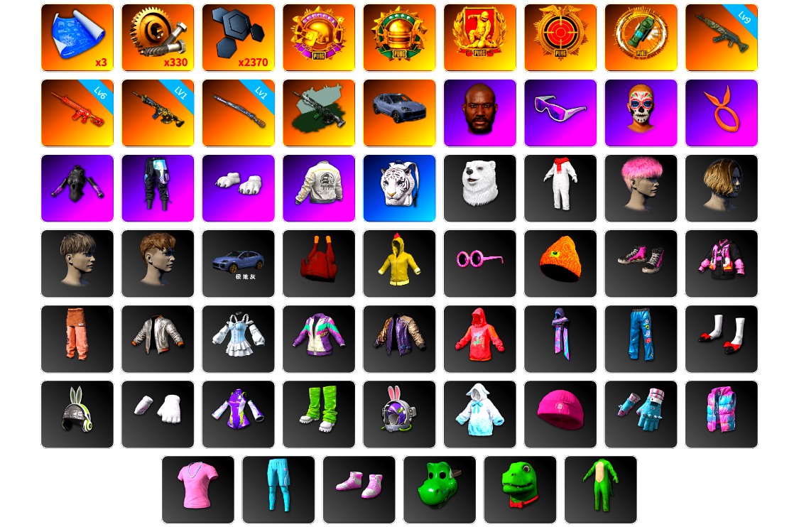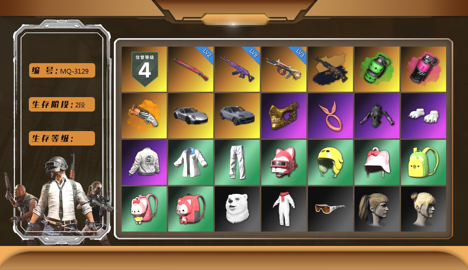 3张图纸 蜗牛币 2370聚合物 收割者金标 9级青龙762 6级朱雀M4 1级时空使者M4 1级猛虎98k 时空使者M4(异色) 保时捷卡宴 黑鬼 滑雪镜 橙色发带 发光手臂 竞猜裤 白熊鞋 粉头 绷带AK 西游记 滑雪帽