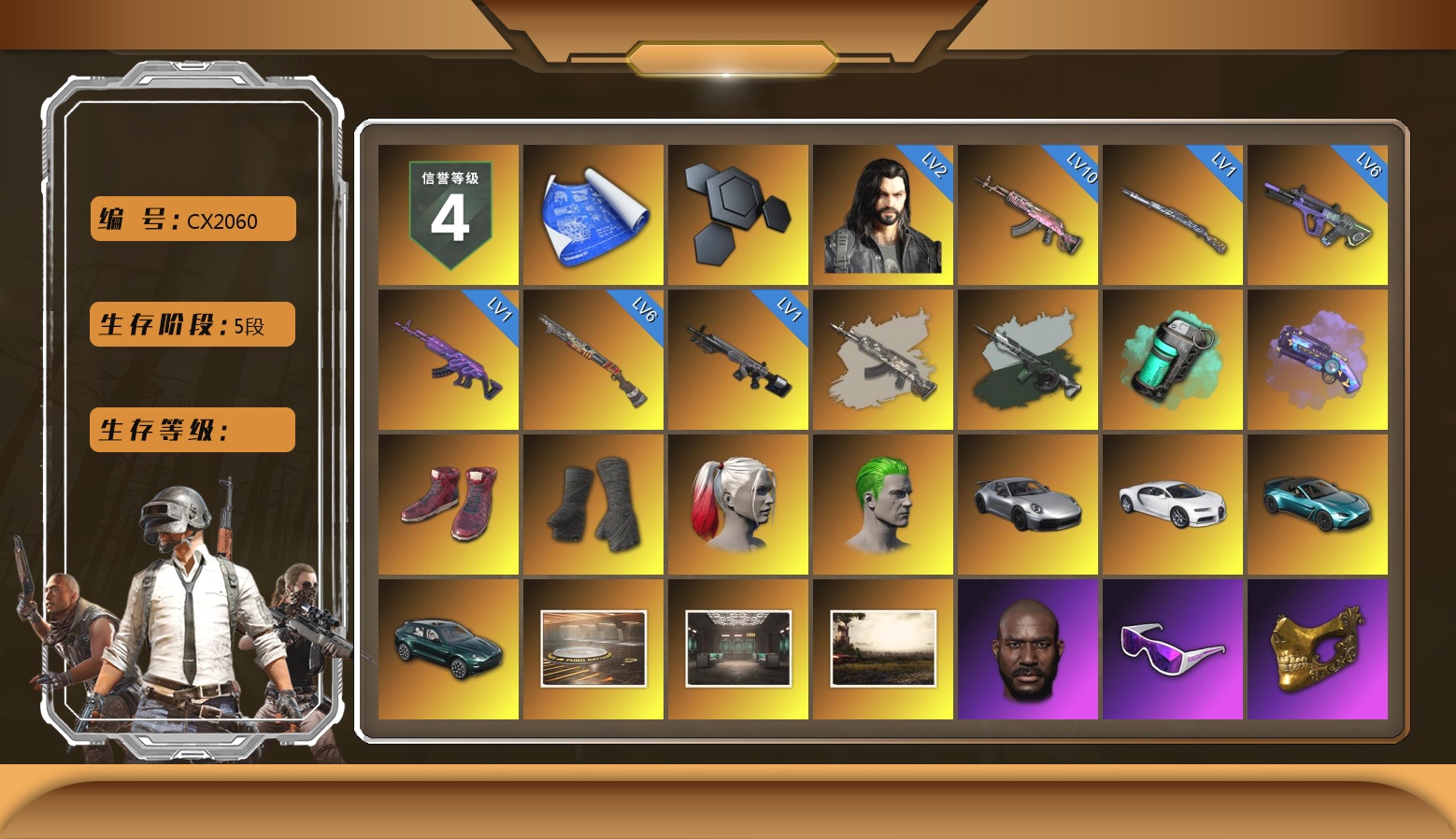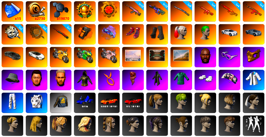 10级火麒麟 6级霓虹AUG 6级烈日灼烧-S1897 2级多利安 1级猛虎98k 1级美杜莎762 1级暗影之主Mk12 火麒麟(异色) 时空使者M4(异色) 青色烟雾弹 紫色魔法迷雾-M79 柏林鞋 黑绷带 小丑女 小丑男 保时捷911 布加迪跑车 马丁敞篷跑车 马丁SUV 陈列室 交易所接待室 7张图纸 14370聚合物 黑鬼 滑雪镜 金面 丑男妆容 马东锡 内马尔 红面巾 黑大衣 白战神 黄东 活动绿东 发光手臂 电磁背包 粉战神 aespa女团 滑雪帽 小马尾 丸子头 脏辫 青海摇 小兔学院 悲喜 PGC 2021套装
