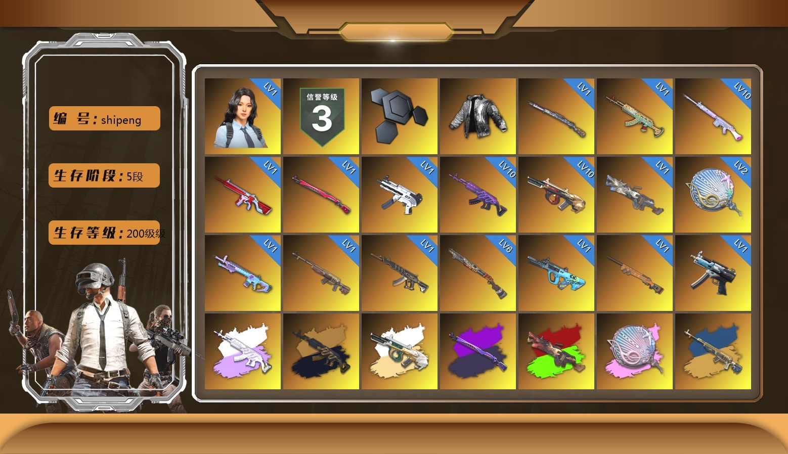 网鱼 10级玩偶炮 10级美杜莎762 10级弥诺陶洛斯AUG 6级烈日灼烧-S1897 2级塞壬平底锅 1级瀚娜 1级猛虎98k 1级水麒麟 1级无信号M4 1级午夜惊魂98K 1级无重力MP5K 1级刻耳柏洛斯M249 1级魔咒之力Mk12 1级时光加农SKS 1级妖魔之触ACE 1级GD-AUG 1级夜曲M24 1级寒蚀MP5K 美杜莎(白异色) 美杜莎(黑异色) 弥诺陶洛斯AUG(异色) 午夜惊魂98K(异色) M249(异色) 塞壬 - 平底锅(异色) 妖魔之触(异色) S1897(异色) 寒蚀MP5K(异色) 翡翠色烟雾弹 黄色狂怒之雾-M79 小黑盒 黑绷带 帕拉梅拉 保时捷卡宴 布加迪跑车 布加迪奢华版跑车 胜利密室 16090聚合物 黑鬼 滑雪镜 金面 渔夫帽 牛角 白战神 活动绿东 发光手臂 电磁背包 白熊鞋 小叮当 aespa女团 滑雪帽 阿狸 小黄鸭 小马尾 丸子头 青海摇 小兔学院 悲喜 绷带AK 西游记