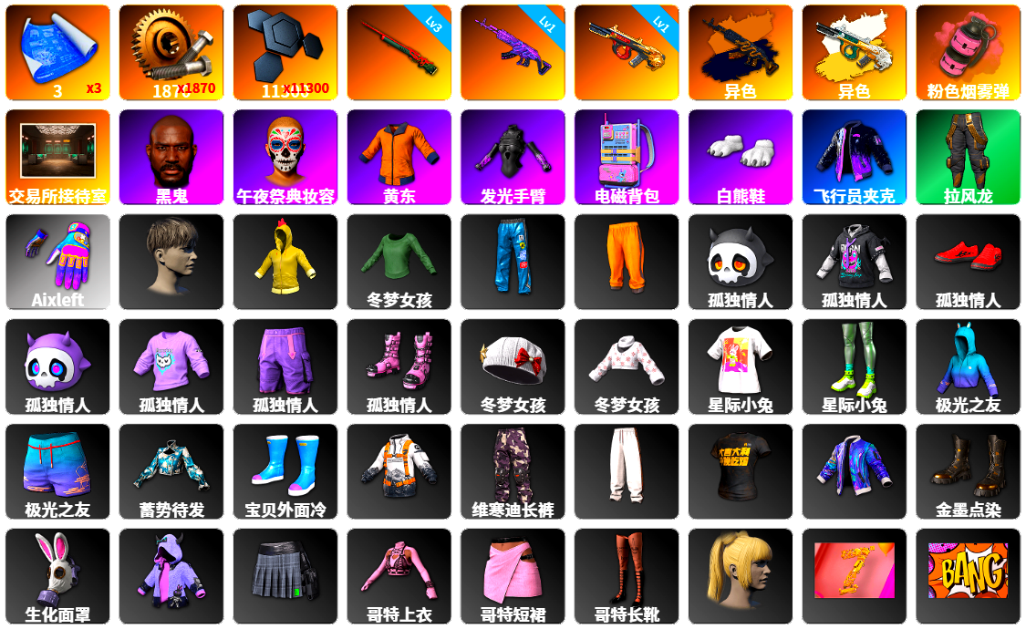 2张图纸 蜗牛币 4842聚合物 10级妖魔之触ACE 3级魔咒之力Mk12 妖魔之触(异色) 翡翠色烟雾弹 黄色狂怒之雾-M79 紫色魔法迷雾-M79 柏林鞋 帕拉梅拉 保时捷911 保时捷卡宴 兰博基尼SUV 陈列室 交易所接待室 黑鬼 滑雪镜 金面 牛角 红面巾 黑大衣 白战神 活动绿东 发光手臂 电磁背包 萨芬裤 白熊鞋 拉风龙 后街车库 小马尾 丸子头 脏辫 爱的主打歌 青海摇 小兔学院 绷带AK 胜利之舞39