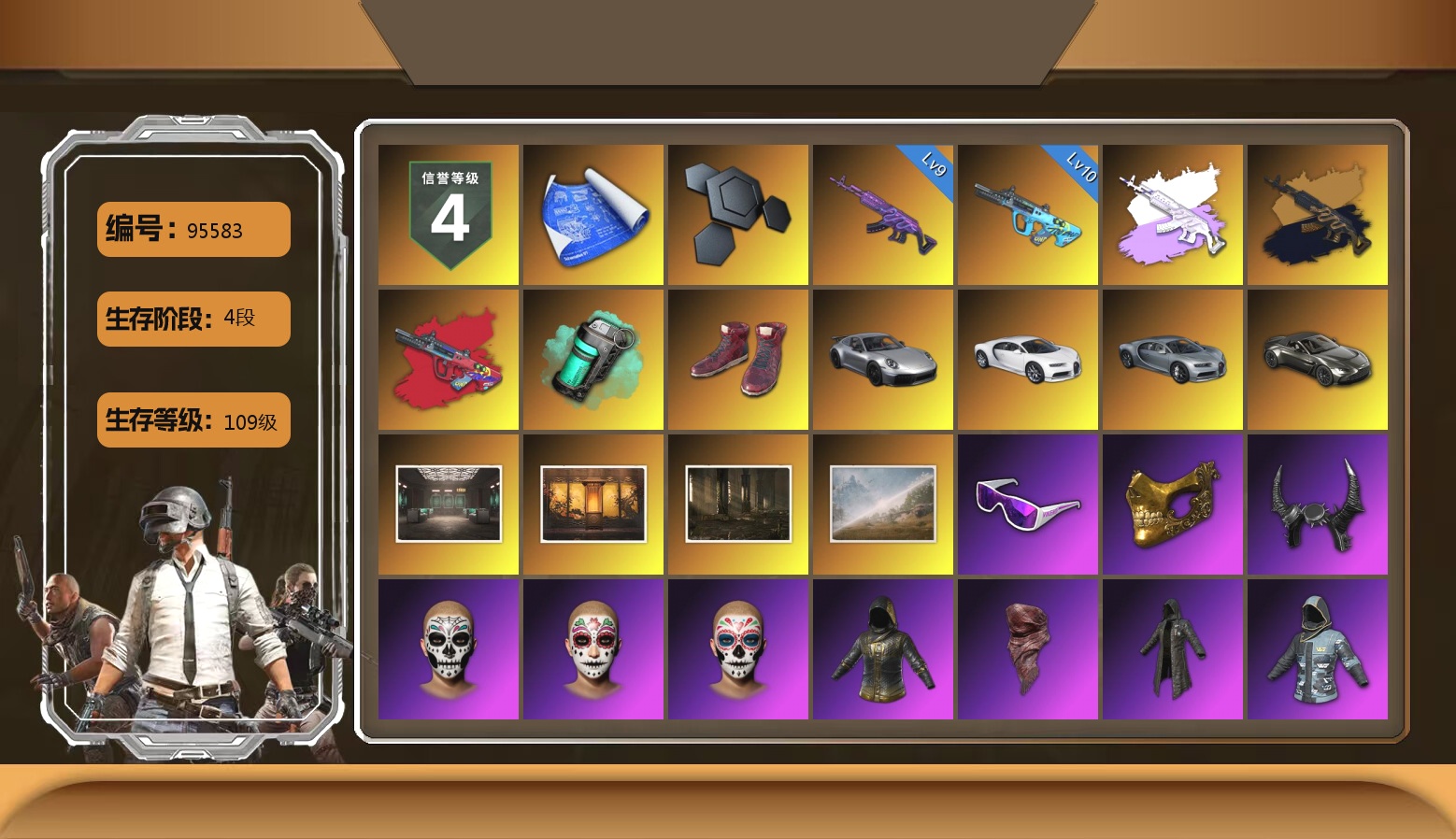 10级南瓜M4 9级青龙762 2级夜曲M24 翡翠色烟雾弹 湛蓝狂怒之雾-M79 柏林鞋 小丑男 马丁敞篷跑车 交易所接待室 武器神龛 黑鬼 9s发型 金面 牛角 丑男妆容 红面巾 黑大衣 白战神 发光手臂 电磁背包 白熊鞋 粉战神 阿狸 尼尔 拉风龙 车漆 小马尾 丸子头 西游记 脏辫 青海摇 小兔学院 悲喜 绷带AK