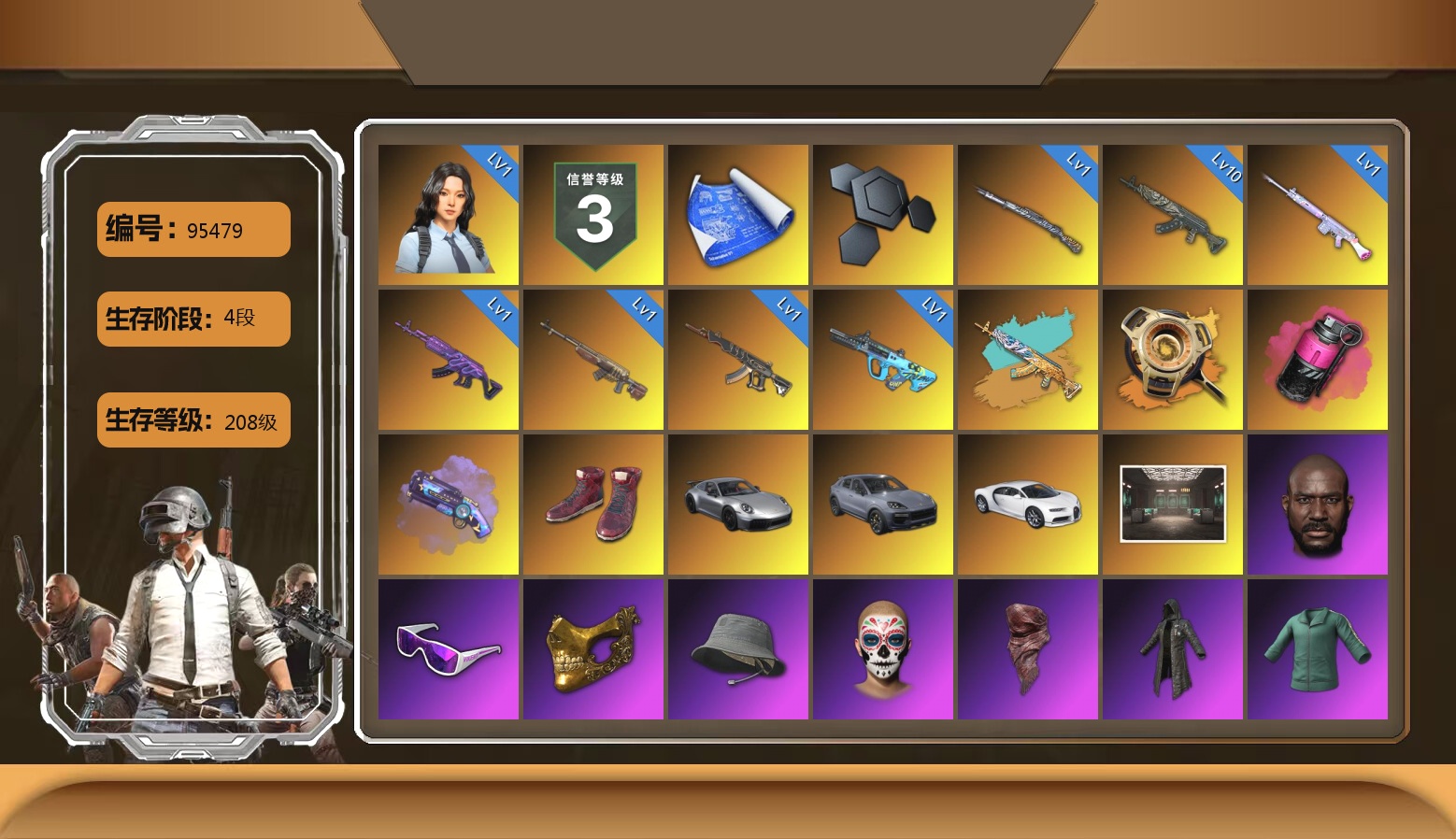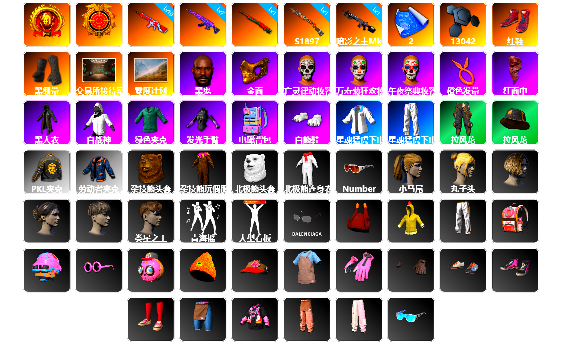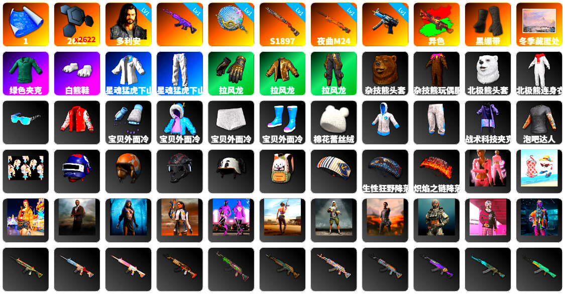 1级瀚娜 10级青龙762 1级美杜莎762 1级GD-AUG 1级妖魔之触ACE 1级时光加农SKS 1级玩偶炮 1级猛虎98k 青龙762(异色) 虚空使者(异色) 品红色烟雾弹 紫色魔法迷雾-M79 9张图纸 16893聚合物 柏林鞋 保时捷911 保时捷卡宴 布加迪跑车 交易所接待室 黑鬼 滑雪镜 金面 渔夫帽 红面巾 黑大衣 活动绿东 萨芬裤 白熊鞋 粉战神 拉风龙 小马尾 丸子头 青海摇 车漆 小兔学院 悲喜 绷带AK 滑雪帽 枪炮洗礼