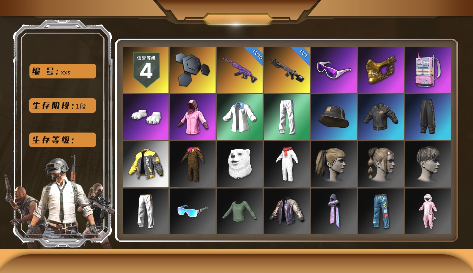 ID[269899][LZW1803]10级无信号M4 7级美杜莎762 1级孙悟空M24 1级烈日灼烧-S1897 1级暗影之主Mk12 张图纸 聚合物 柏林鞋 黑绷带 交易所接待室 黑鬼 金面 橙色发带 红面巾 黑大衣 白战神 活动绿东 发光手臂 电磁背包 白熊鞋 拉风龙 小马尾 丸子头 青海摇 小兔学院 西游记 PGC 2021套装 枪炮洗礼