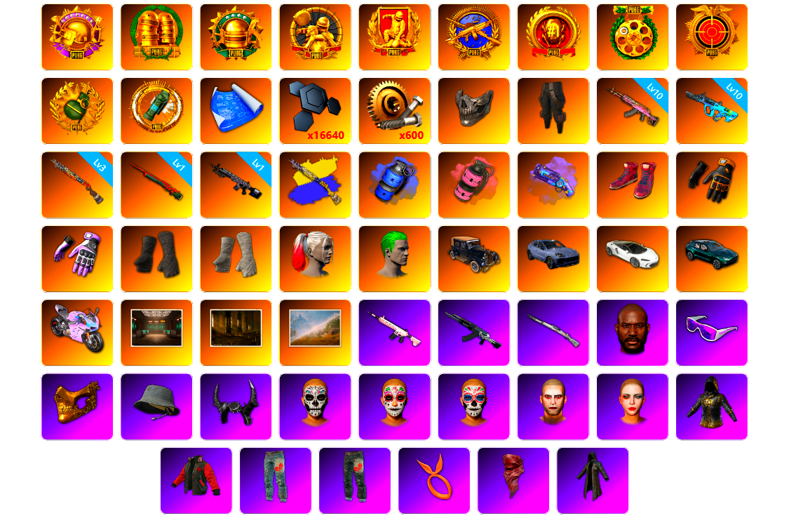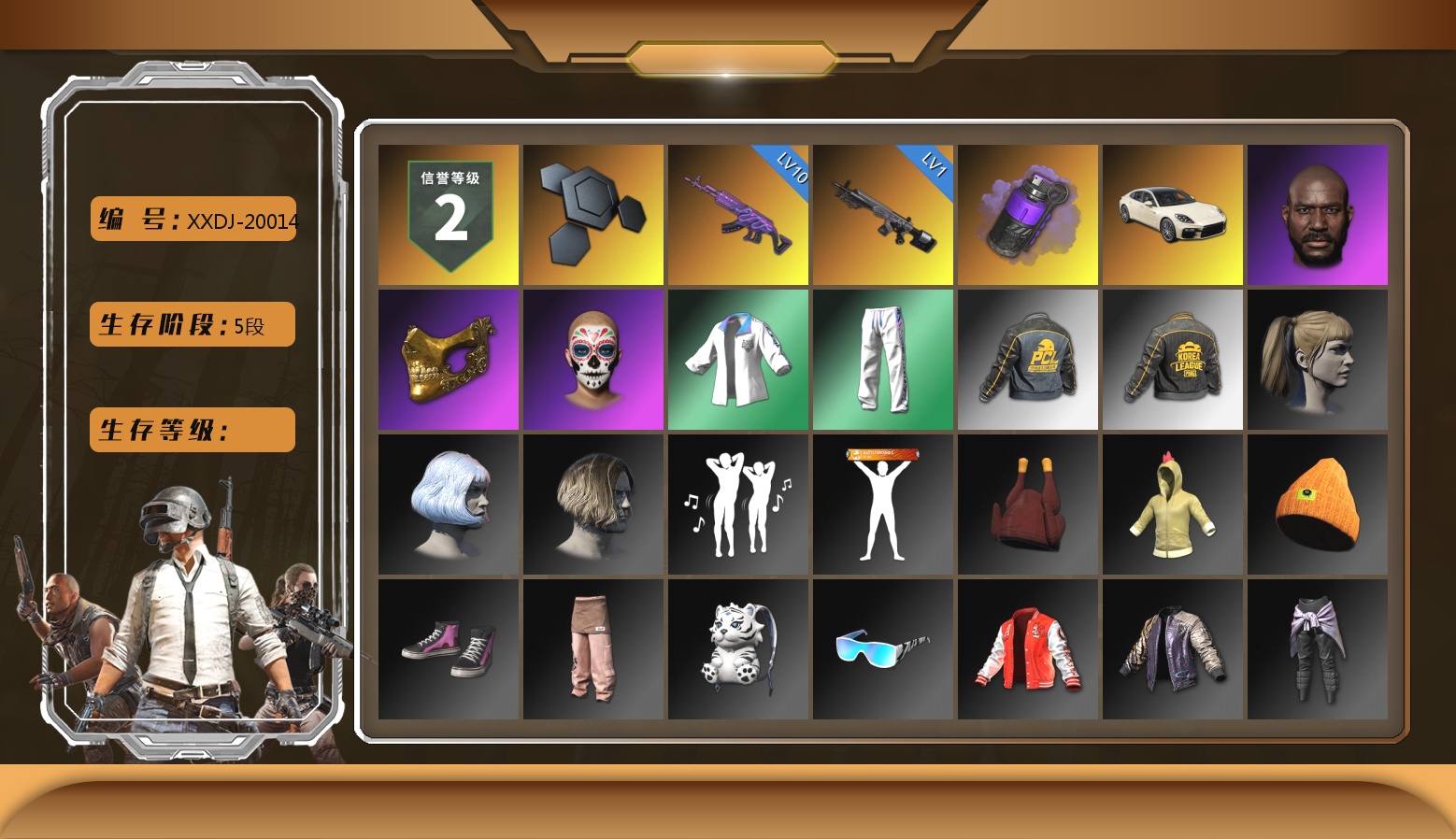 收割者金标 捕食者金标 1张图纸 16640聚合物 蜗牛币 柏林面具 柏林裤 10级火麒麟 10级GD-AUG 3级烈日灼烧-S1897 1级孙悟空M24 1级暗影之主Mk12 S1897(异色) 蓝色烟雾弹 粉色烟雾弹 紫色魔法迷雾-M79 柏林鞋 蛋黄手套 小黑盒 黑绷带 白绷带 小丑女 小丑男 保时捷卡宴 迈凯伦硅质白版 马丁SUV 杜卡迪暮光粉 交易所接待室 粉猪M4 黑鬼 滑雪镜 金面 渔夫帽 牛角 丑男妆容 橙色发带 红面巾 黑大衣 白战神 小战神 活动绿东 发光手臂 竞猜裤 电磁背包 萨芬裤 白熊鞋 青蛙套 橙运动 监狱服 渐变装 粉战神 布朗熊 车漆 小马尾 小绿头 粉头 丸子头 西游记 脏辫 青海摇 悲喜 绷带AK 滑雪帽 胜利之舞39