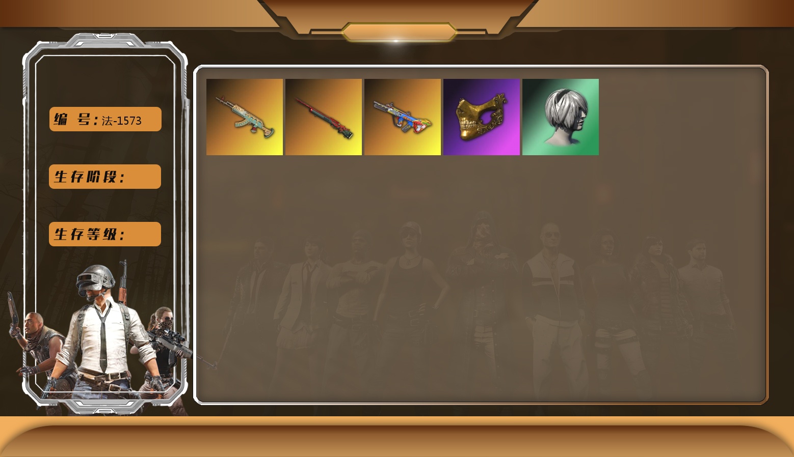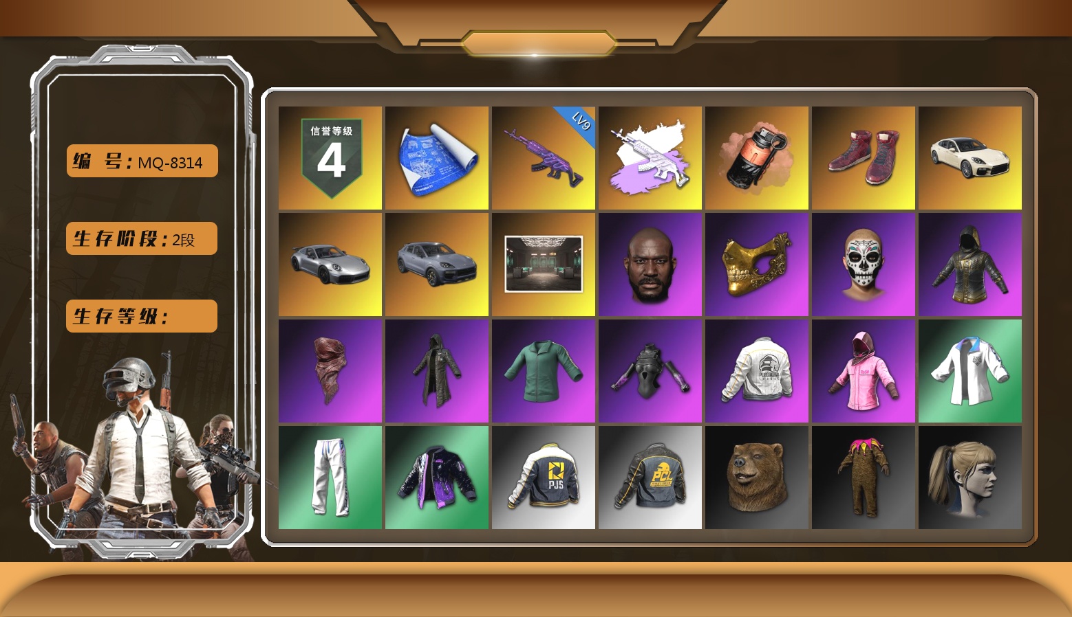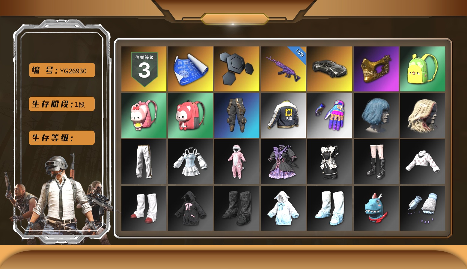 1727级 信誉等级1 金奖牌金猎手 弹珠aug 10级 深渊762 4级 悟空m24 2级 图纸2 烟雾弹粉 烟枪橙 白战神 2021pgc黄金面具 恶魔角套 黄东南亚 北极熊角 尼尔单套