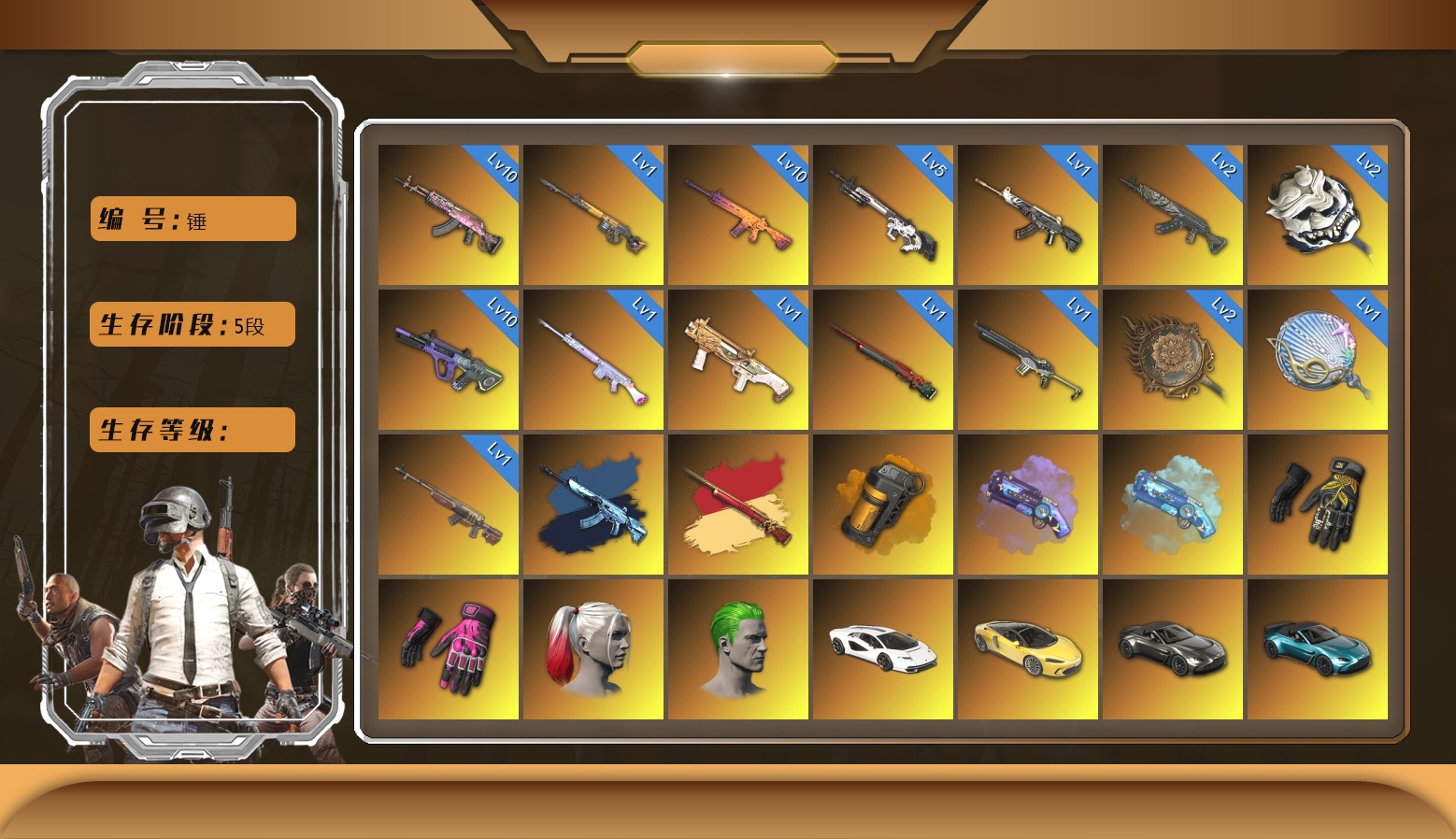 五阶段满级 双头尼尔 迈阿密 金叶子16神器 双异色 满级霓虹aug 满级火麒麟 满级南瓜 5级赛博 异色孙悟空 10+10+10+5+2+2+2+2+1+1+1+1+1+1+1+1 新女团 布朗熊 绿东 白战神 电磁包 拳皇 阿狸套装 黄东南亚 金面滑雪 内马尔烟雾弹 3马丁 杜卡迪 兰博基尼跑车 女团大厅
