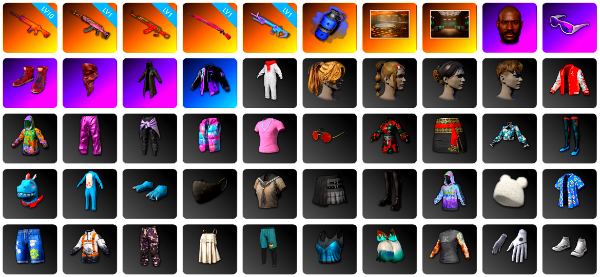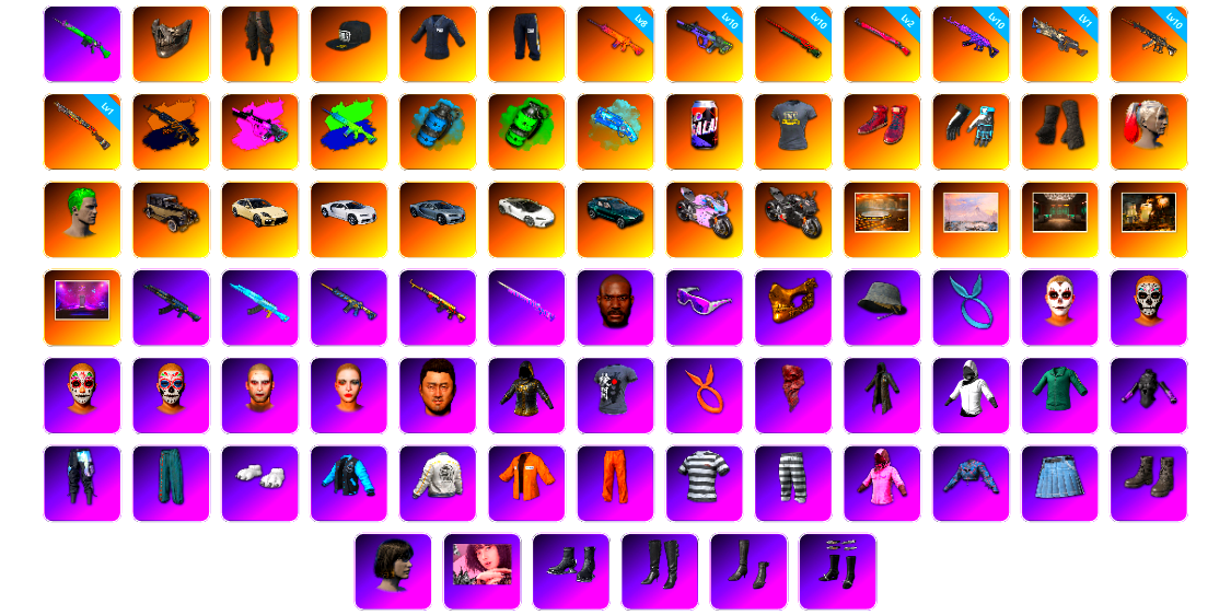 青蛙大炮 柏林面具 柏林裤 黑东 8级南瓜M4 10级霓虹AUG 10级孙悟空M24 2级午夜惊魂98K 10级美杜莎762 1级刻耳柏洛斯M249 10级妖魔之触ACE 1级烈日灼烧-S1897 美杜莎(异色) 霓虹AUG(异色) 南瓜M4(异色) 天蓝色烟雾弹 翡翠色烟雾弹 蓝色魔法迷雾-M79 柏林鞋 大魔王 黑绷带 小丑女 小丑男 帕拉梅拉 布加迪跑车 布加迪奢华版跑车 迈凯伦硅质白版 马丁SUV 杜卡迪暮光粉 杜卡迪纯净黑 陈列室 冬季藏匿处 交易所接待室 aespa 玩具AK 黑鬼 滑雪镜 金面 渔夫帽 康萨斯 卡崔娜 丑男妆容 马东锡 橙色发带 红面巾 黑大衣 白战神 活动绿东 发光手臂 竞猜裤 萨芬裤 白熊鞋 橙运动 监狱服 粉战神 女团 aespa女团 阿狸 小黄鸭 拉风龙 小马尾 小绿头 丸子头 西游记 脏辫 爱的主打歌 青海摇 车漆 小兔学院 悲喜 绷带AK 滑雪帽 PGC 2021套装 胜利之舞39
