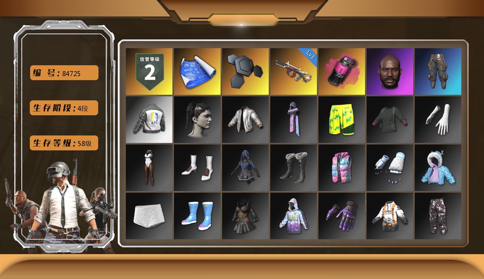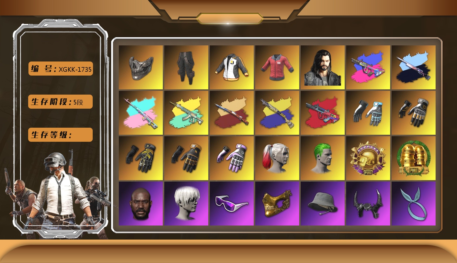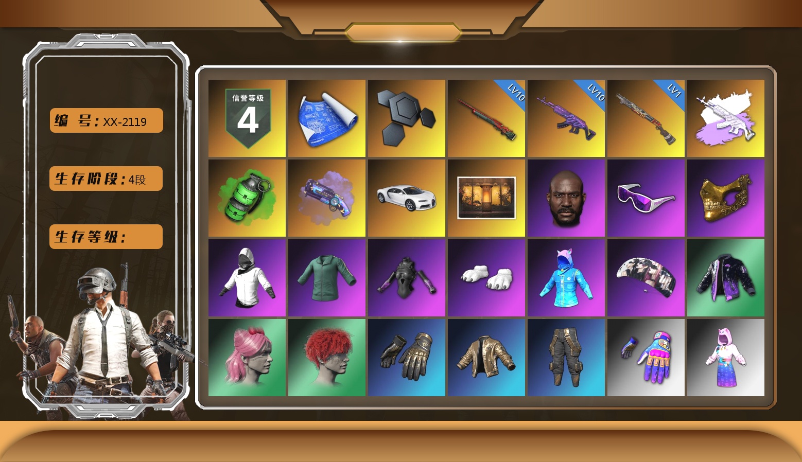 柏林面具 黑东 10级美杜莎762 10级孙悟空M24 10级爆裂AUG 10级无信号M4 10级午夜惊魂98K 10级小兔MK12 6级圣诞AK 6级沙悟净MINI 2级玩偶炮 2级DBS 1级恶魔ACE 1级猪八戒M4 1级弥诺陶洛斯AUG 1级刻耳柏洛斯M249 1级魔咒之力Mk12 1级塞壬平底锅 3级唐三藏平底锅 美杜莎(异色) 孙悟空M24(异色) 爆裂AUG(异色) 无信号M4(异色) 午夜惊魂98K(异色) 小兔MK12(异色) 沙悟净Mini(异色) 猪八戒(异色) 猪八戒M4(异色) 弥诺陶洛斯AUG(异色) 魔咒Mk12(异色) 塞壬 - 平底锅(异色) 唐三藏(异色) 紫色烟雾弹 品红色烟雾弹 黄色狂怒之雾-M79 柏林鞋 金手指 小丑男 兰博基尼SUV 马丁跑车 杜卡迪翡翠绿 胜利密室 陈列室 冬季藏匿处 交易所接待室 甜饼762 黑鬼 滑雪镜 9s发型 金面 渔夫帽 牛角 卡崔娜 丑男妆容 红面巾 黑大衣 白战神 小战神 黄东 发光手臂 竞猜裤 萨芬裤 白熊鞋 橙运动 监狱服 渐变装 粉战神 阿狸 小黄鸭 尼尔 拉风龙 鸡斯卡夹克 车漆 小绿头 西游记 青海摇 小兔学院 悲喜 绷带AK 滑雪帽