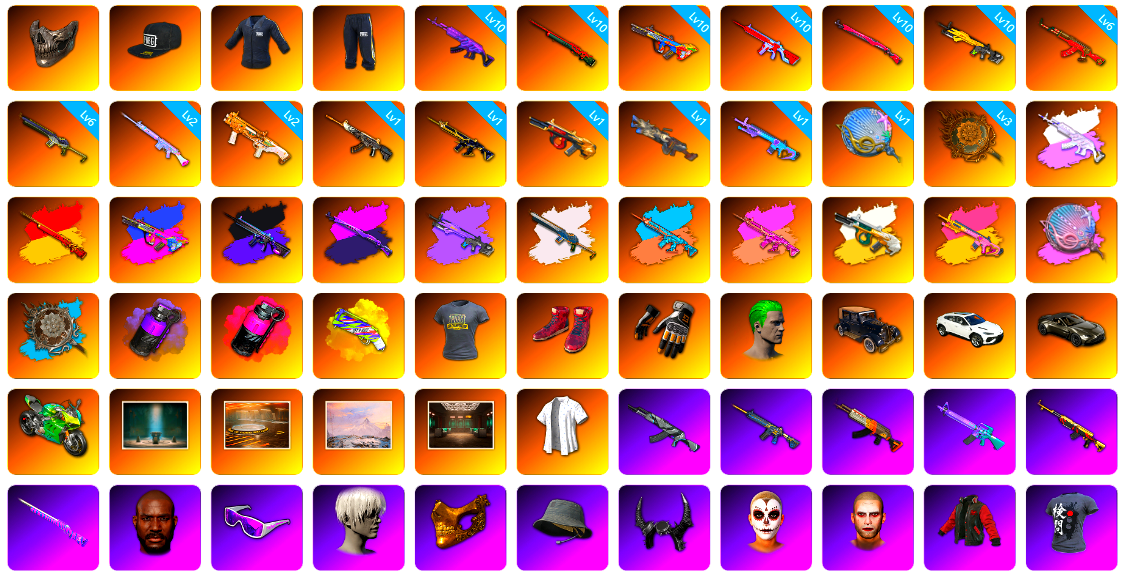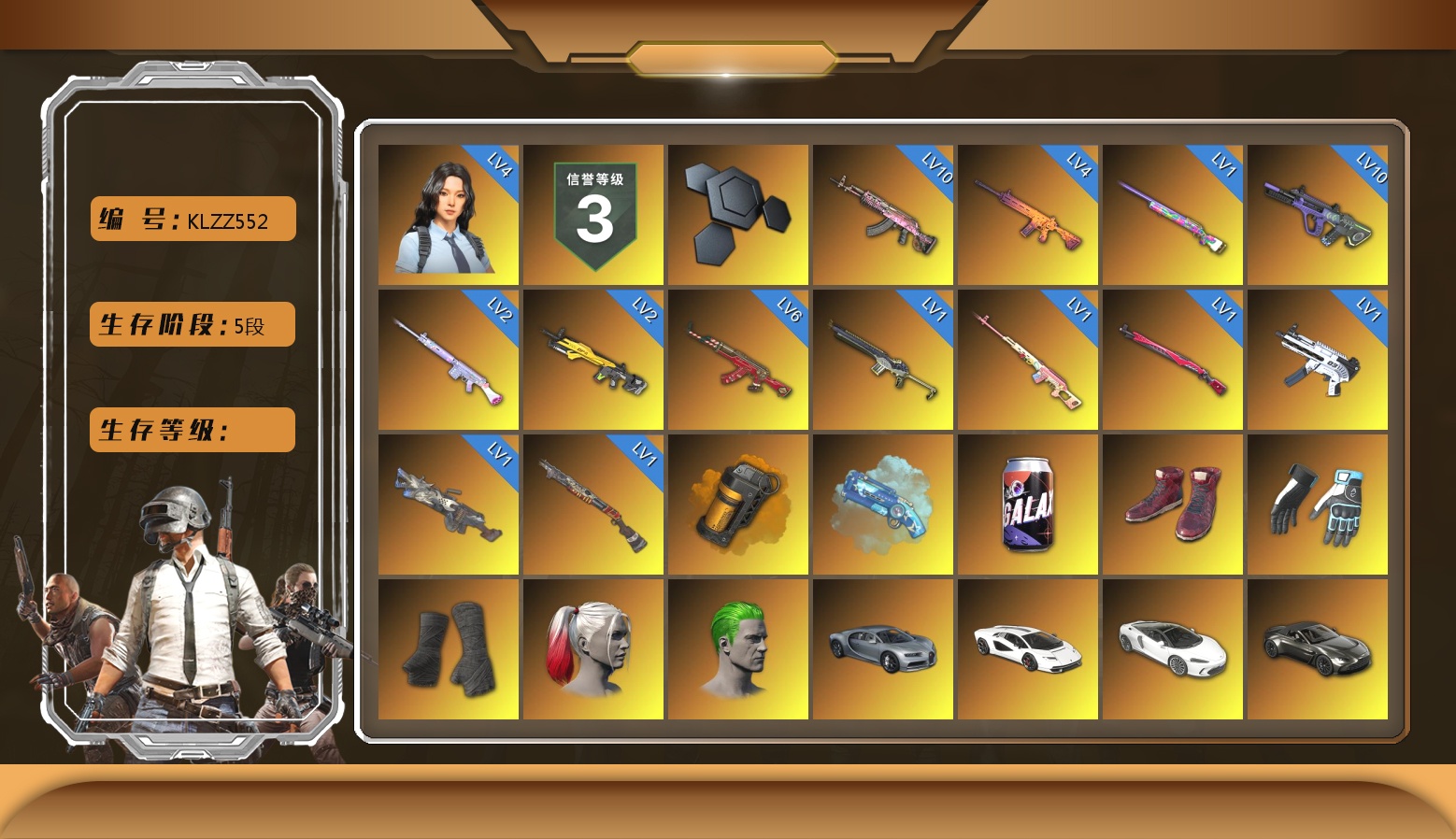 10级火麒麟 10级霓虹AUG 6级圣诞AK 4级瀚娜 4级南瓜M4 2级玩偶炮 2级小兔MK12 1级彩虹M24 1级沙悟净MINI 1级德拉贡 1级午夜惊魂98K 1级无重力MP5K 1级刻耳柏洛斯M249 1级烈日灼烧-S1897 橘色烟雾弹 蓝色魔法迷雾-M79 柏林鞋 大魔王 黑绷带 小丑女 小丑男 布加迪奢华版跑车 兰博基尼跑车 迈凯伦硅质白版 马丁跑车 马丁SUV 杜卡迪翡翠绿 杜卡迪红 杜卡迪纯净黑 交易所接待室 2208聚合物 黑鬼 9s发型 金面 渔夫帽 马东锡 橙色发带 红面巾 黑大衣 白战神 活动绿东 发光手臂 电磁背包 萨芬裤 白熊鞋 青蛙套 橙运动 监狱服 渐变装 阿狸 尼尔 拉风龙 鸡斯卡夹克 小马尾 丸子头 西游记 脏辫 青海摇 小兔学院 悲喜