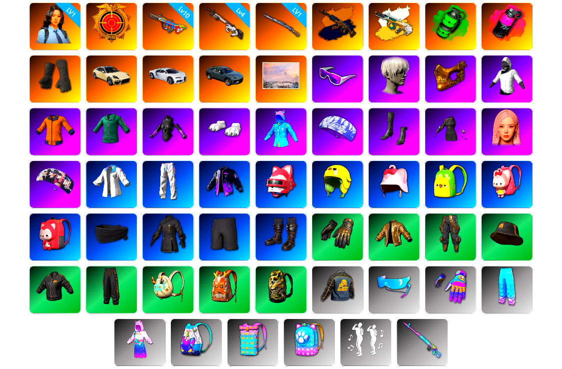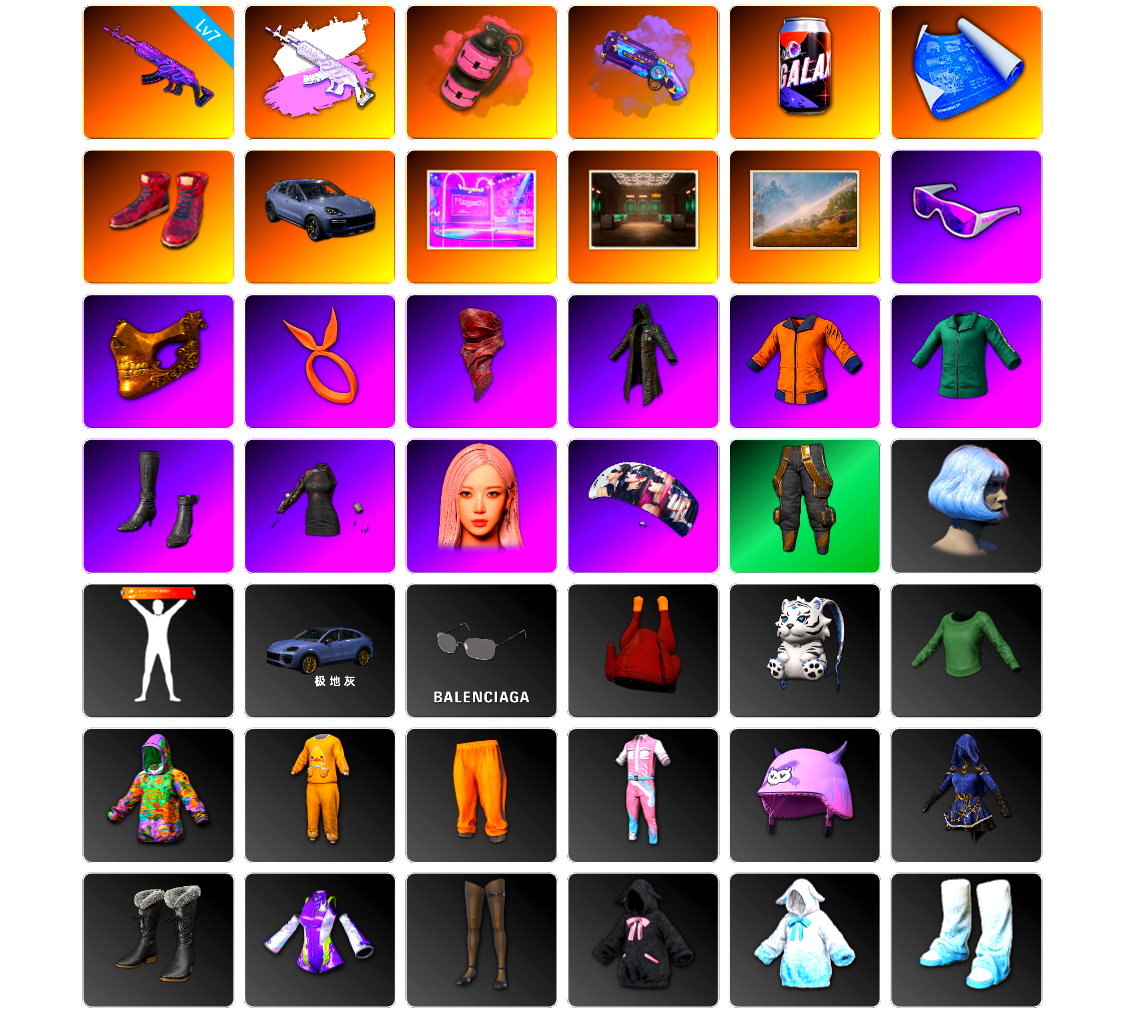 10级美杜莎762 10级弥诺陶洛斯AUG 10级时空使者M4 6级烈日灼烧-S1897 2级塞壬平底锅 1级猛虎98k 1级刻耳柏洛斯M249 1级夜曲M24 1级暗影之主Mk12 1级冰域Groza 美杜莎(异色) 弥诺陶洛斯AUG(异色) M249(异色) 品红色烟雾弹 帕拉梅拉 保时捷911 7张图纸 金面 牛角 发光手臂 白熊鞋 拉风龙 丸子头 小兔学院