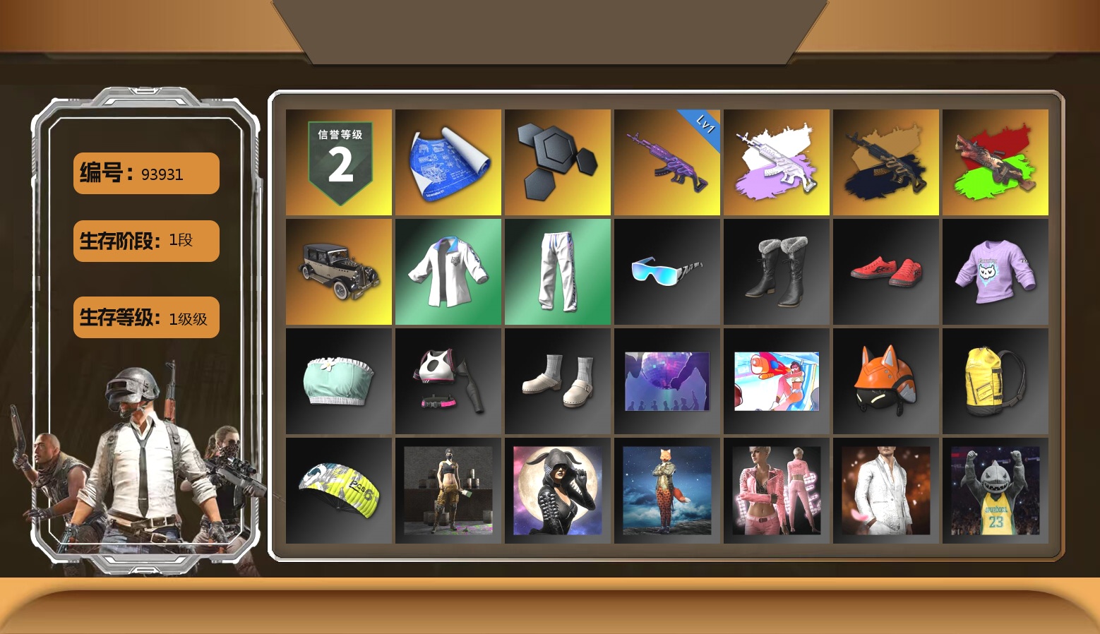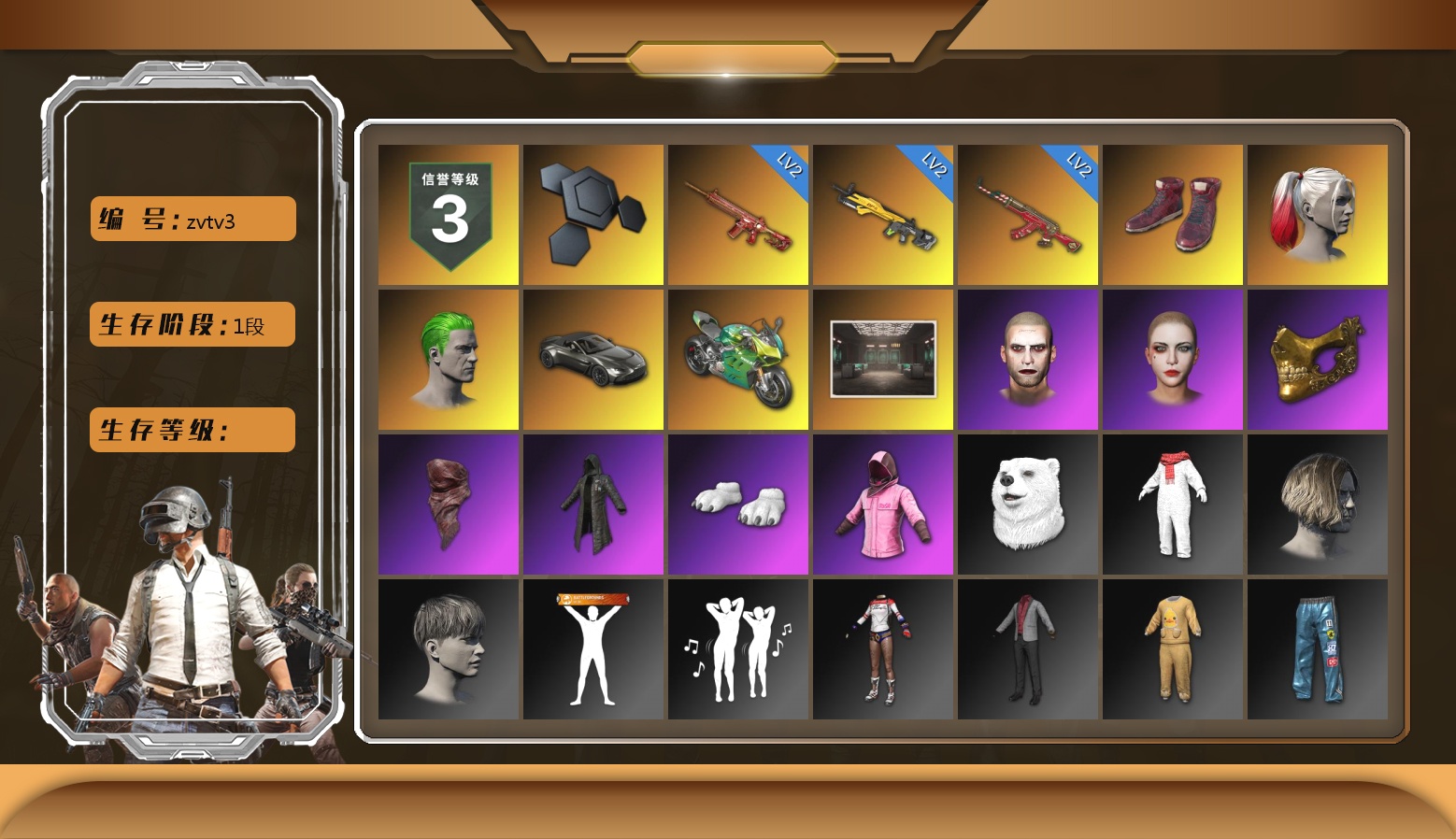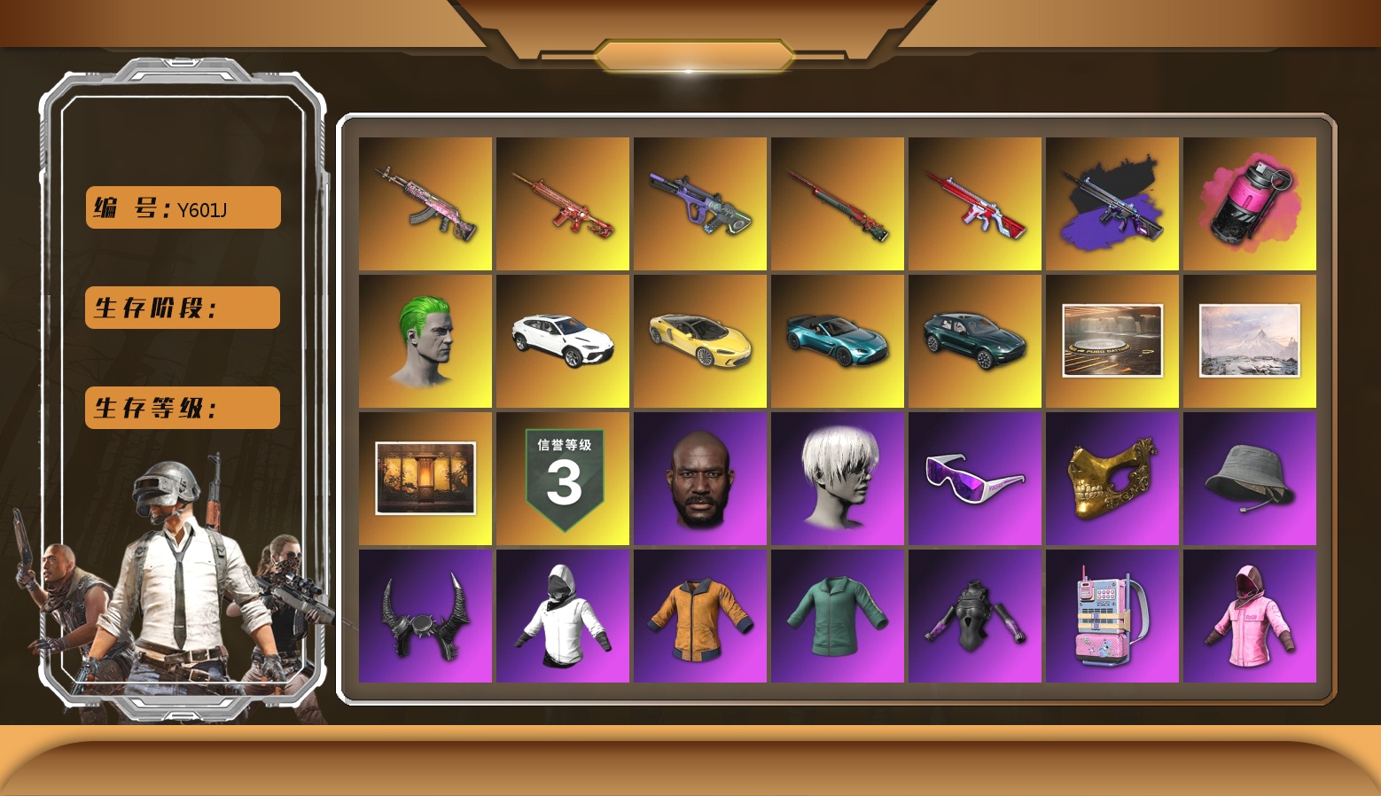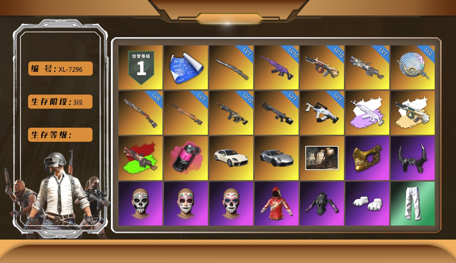 5阶段 信誉3 马丁 兰博 10级火麒麟 9级朱雀M4 6级霓虹AUG 小丑男 黑鬼 金面 渔夫帽 滑雪镜 小马尾 牛角 9s发型 绿东 电磁背包 白战神 黄东 粉战神 发光手臂 小兔学院 危险玩偶屋 拉风龙 悲喜 武器神龛 陈列室 冬季藏匿处