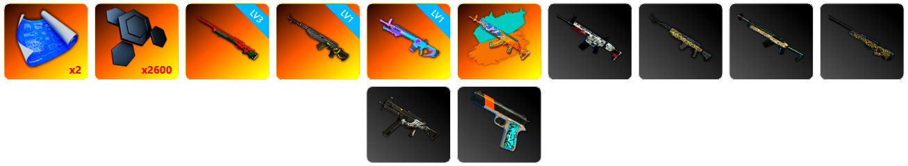 免费版 2张图纸 2600聚合物 3级孙悟空M24 1级玄武SKS 1级魔咒之力Mk12 青龙762(异色)