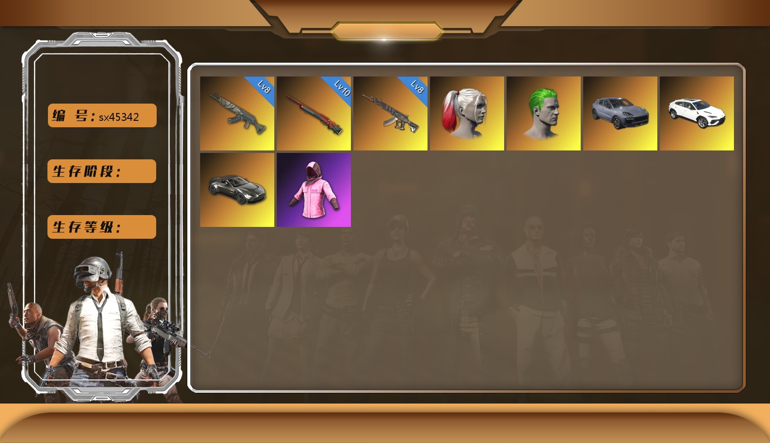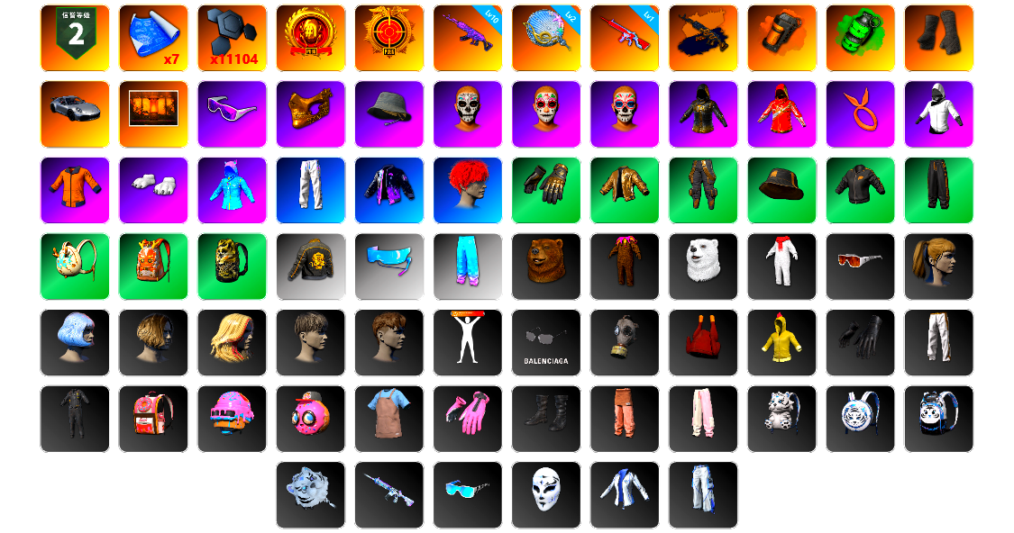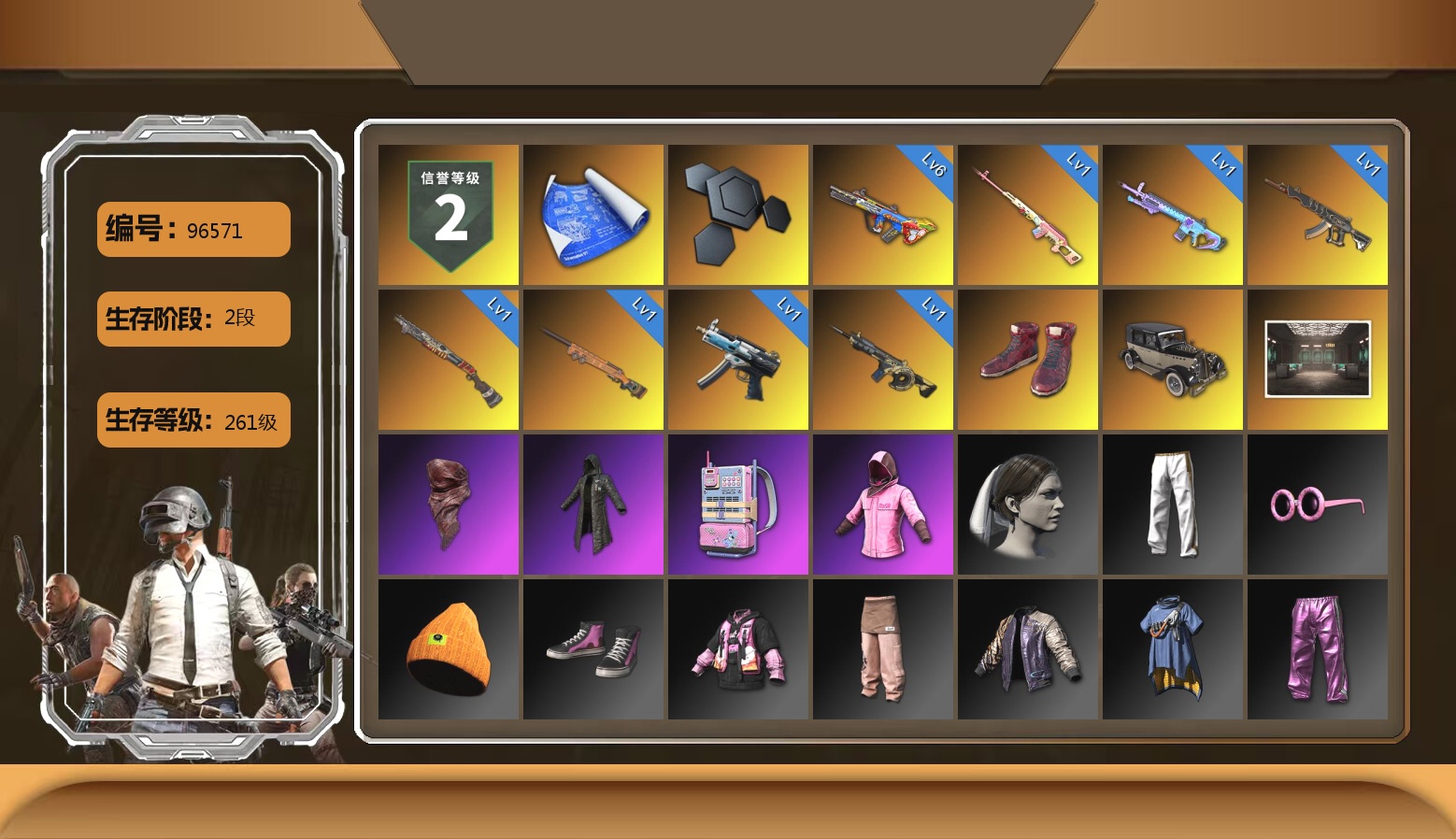 6级爆裂AUG 1级时空使者M4 1级妖魔之触ACE 1级寒蚀MP5K 1级烈日灼烧-S1897 1级魔咒之力Mk12 1级德拉贡 1级夜曲M24 2张图纸 6928聚合物 柏林鞋 交易所接待室 红面巾 黑大衣 电磁背包 粉战神 小兔学院 悲喜