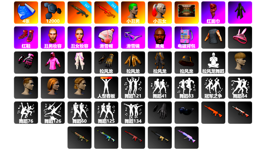 图纸 聚合物 7级青龙762 3级圣诞mini 小丑男 小丑女 交易所接待室 红面巾 黑大衣 柏林鞋 滑雪帽 滑雪镜 黑鬼 电磁背包 小兔学院 悲喜 粉战神 拉风龙