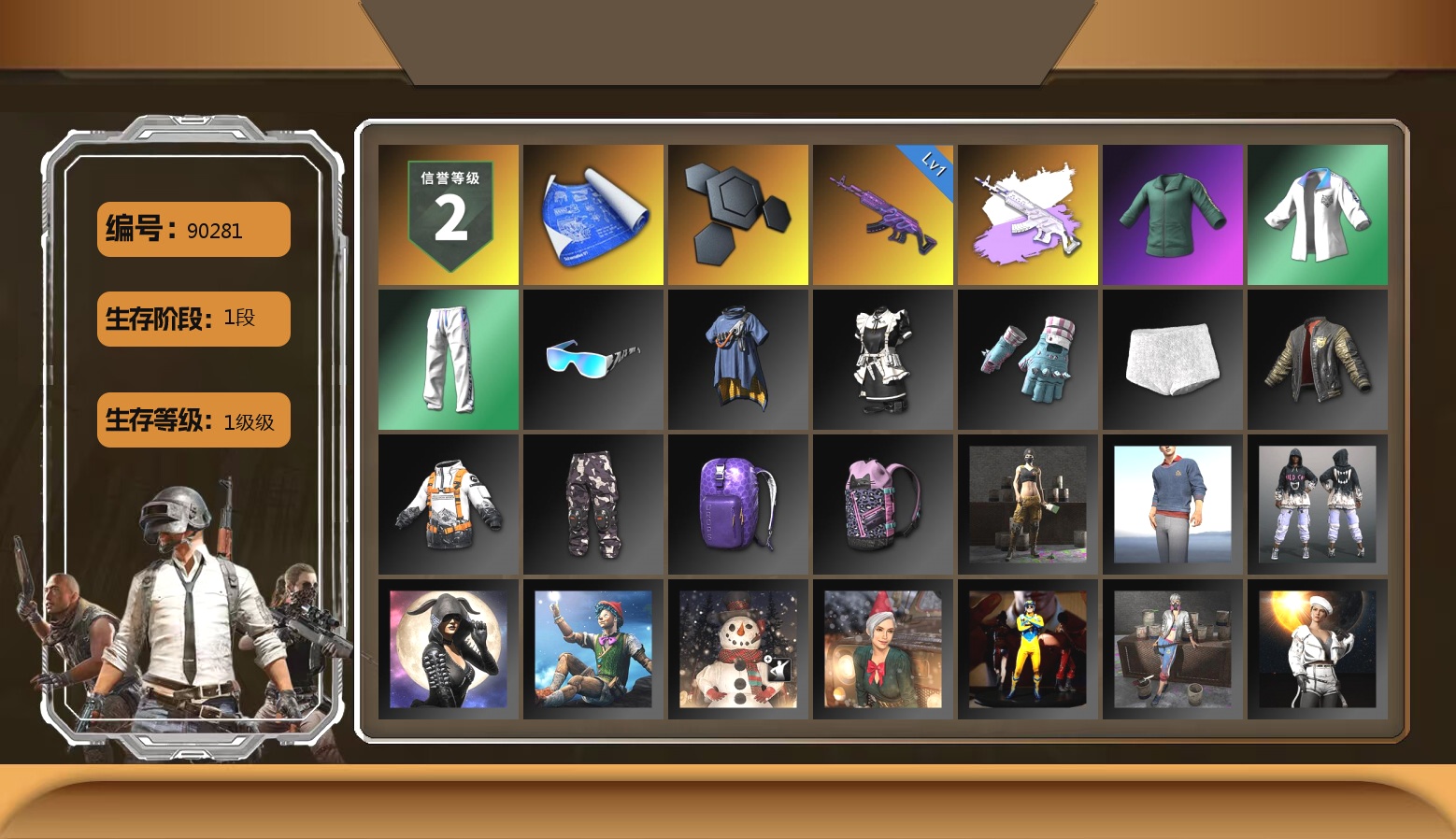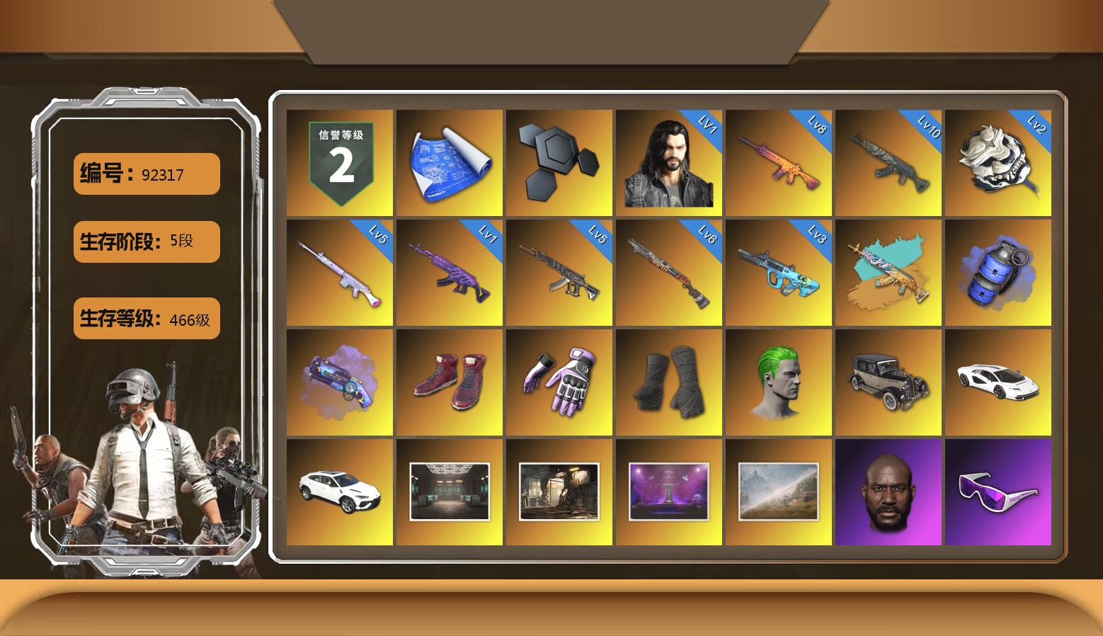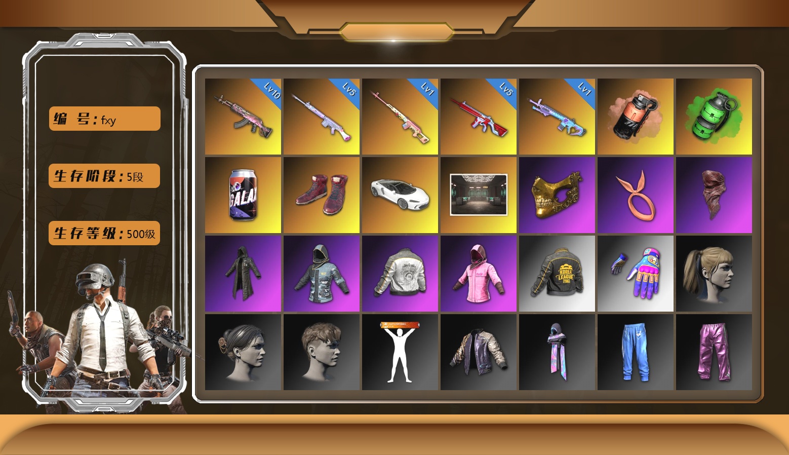小黑盒夹克 10级南瓜M4 10级青龙762 10级霓虹AUG 10级孙悟空M24 8级猛虎98k 6级DBS 6级圣诞AK 6级沙悟净MINI 3级白虎锅 3级烈日灼烧-S1897 2级德拉贡 1级多利安 1级爆裂AUG 1级寒蚀MP5K 青龙762(异色) 赛博MK12(异色) S1897(异色) 天蓝色烟雾弹 柏林鞋 黑绷带 小丑女 小丑男 保时捷卡宴 马丁跑车 马丁敞篷跑车 马丁SUV 武器神龛 4张图纸 2320聚合物 黑鬼 9s发型 金面 康萨斯 丑男妆容 红面巾 黑大衣 小战神 发光手臂 竞猜裤 萨芬裤 白熊鞋 粉战神 尼尔 拉风龙 小马尾 小绿头 粉头 丸子头 脏辫 小兔学院 街头霸王 悲喜 绷带AK 西游记 PGC 2021套装 胜利之舞39 嘉米-加农钉 隆-升龙拳 哎呀!抱歉 枪炮洗礼 春丽凤翼扇