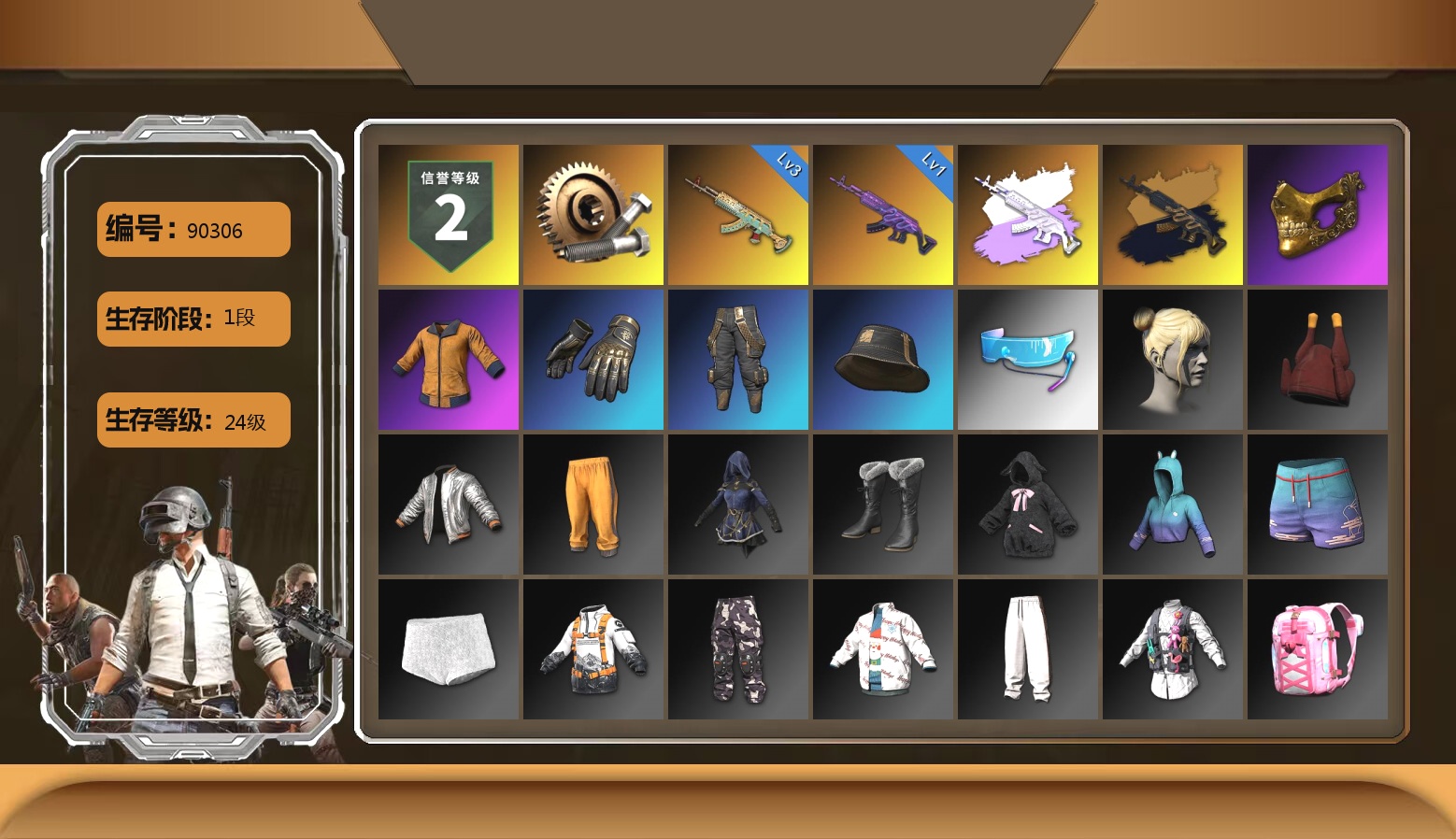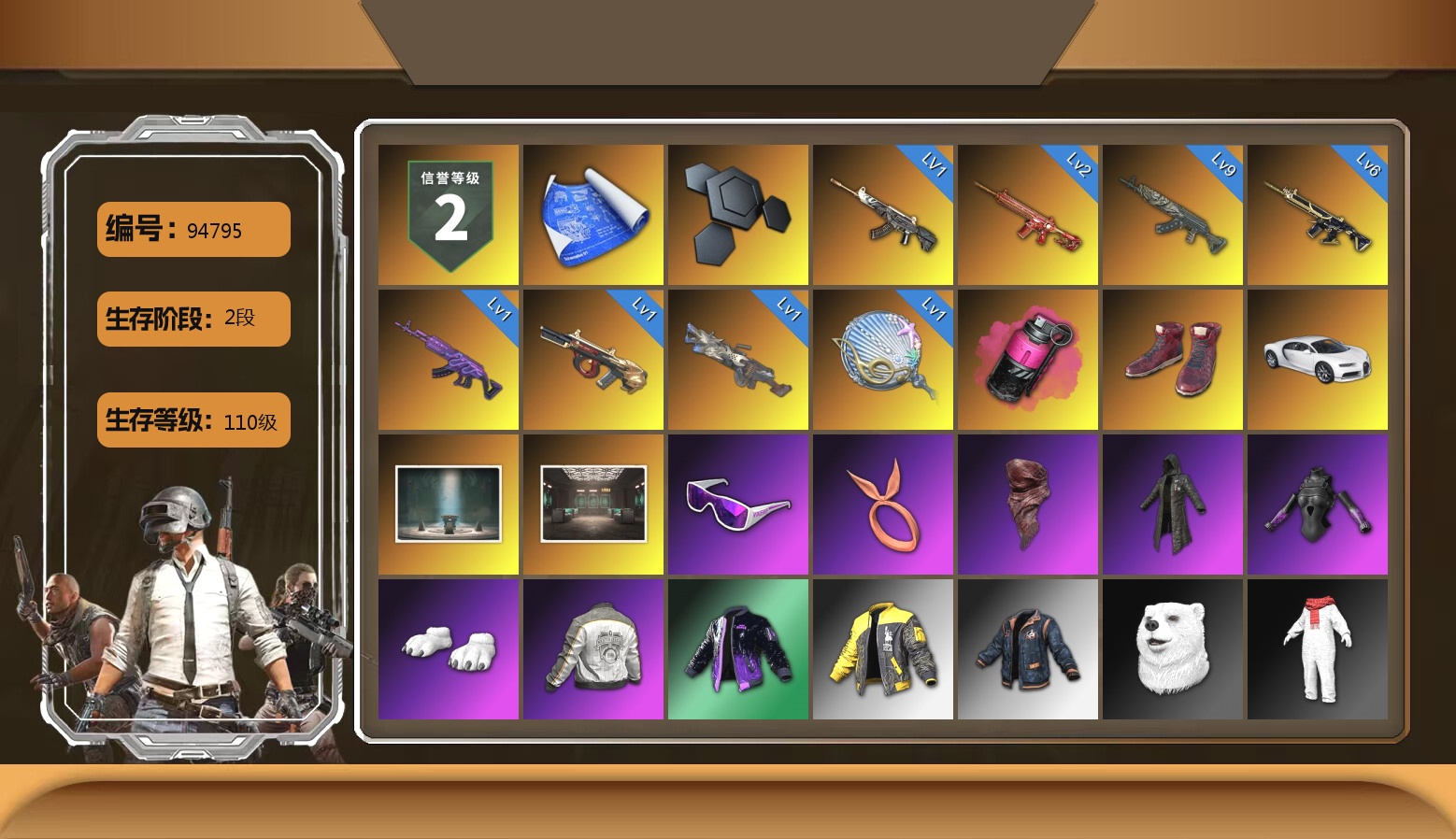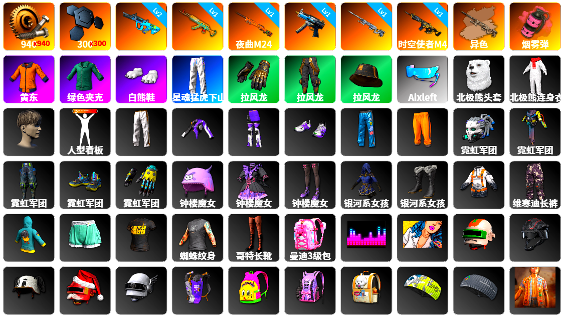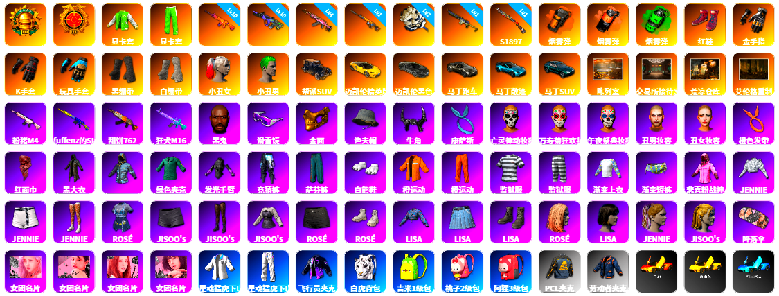 9级青龙762 6级猪八戒M4 2级朱雀M4 1级美杜莎762 1级弥诺陶洛斯AUG 1级恶魔ACE 1级刻耳柏洛斯M249 1级塞壬平底锅 品红色烟雾弹 3张图纸 6022聚合物 柏林鞋 布加迪跑车 胜利密室 交易所接待室 滑雪镜 橙色发带 红面巾 黑大衣 发光手臂 白熊鞋 鸡斯卡夹克 丸子头 车漆 绷带AK 西游记