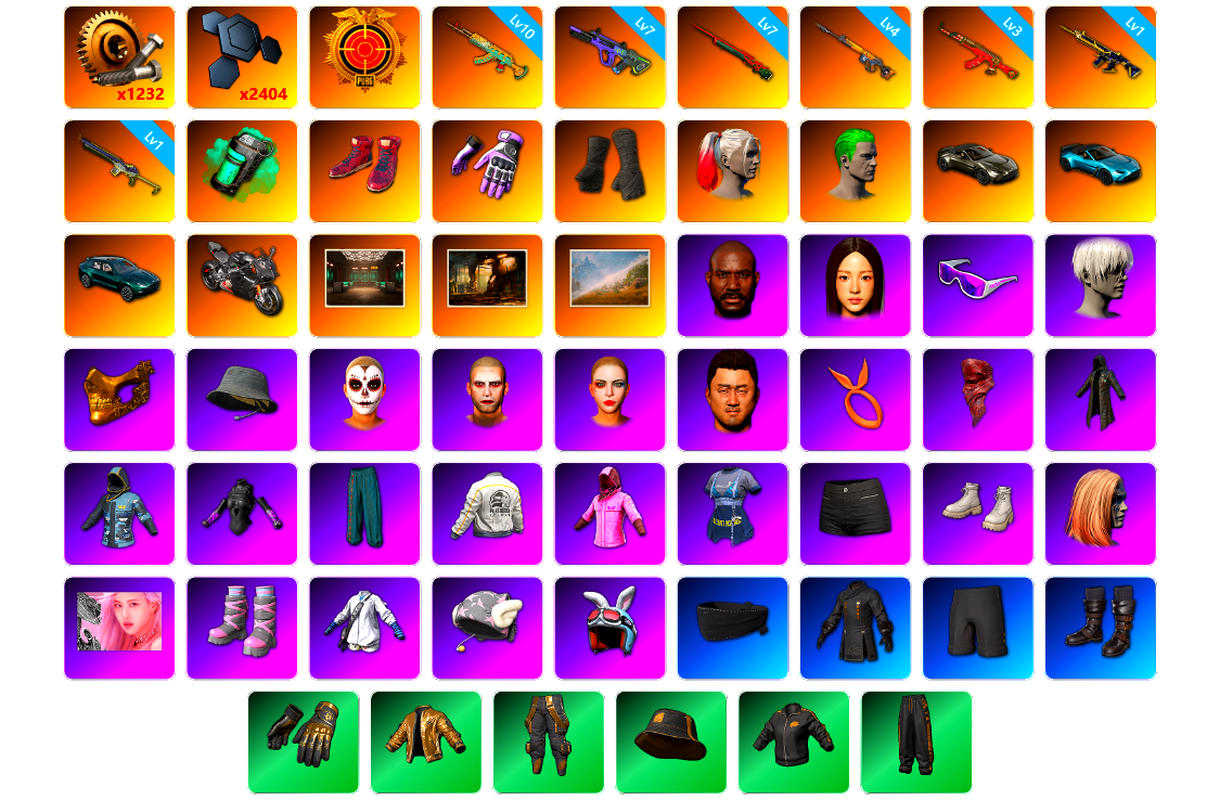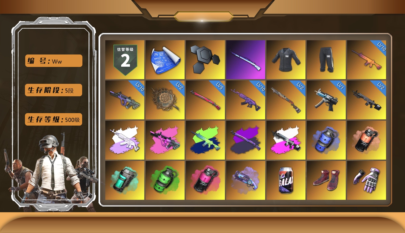 5级弥诺陶洛斯AUG 2级猛虎98k 1级妖魔之触ACE 1级烈日灼烧-S1897 蓝色魔法迷雾-M79 4张图纸 9280聚合物 柏林鞋 交易所接待室 黑鬼 金面 红面巾 黑大衣 粉战神 丸子头 小兔学院 悲喜