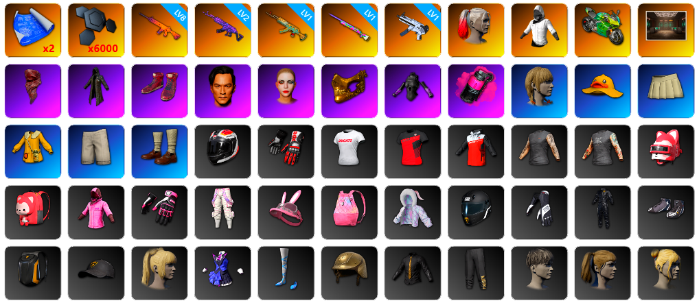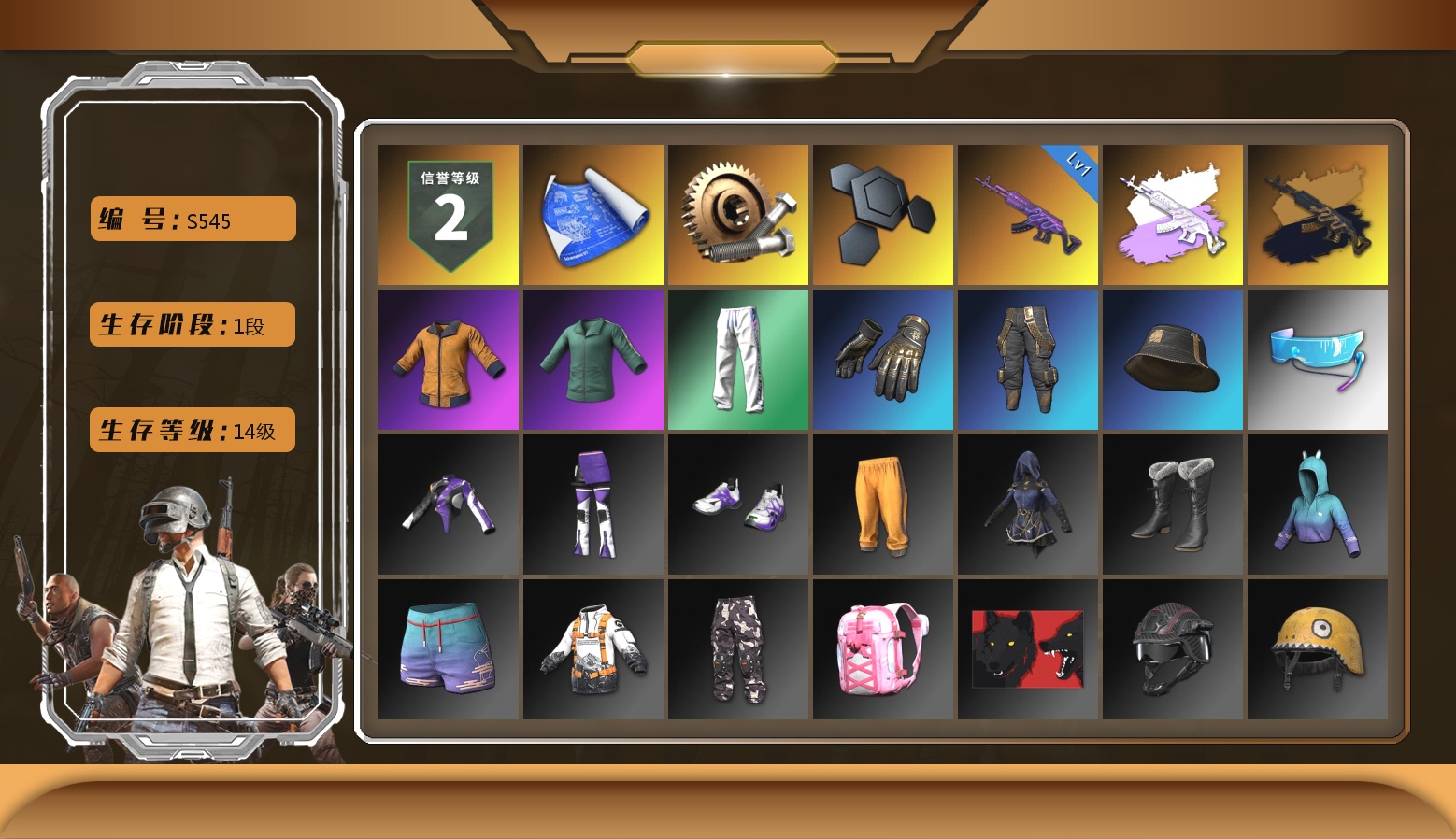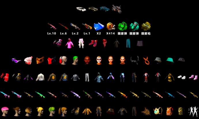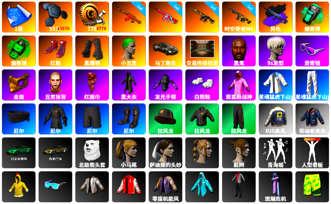 1张图纸 5576聚合物 蜗牛币 6级圣诞AK 5级无信号M4 2级猪八戒M4 1级时空使者M4 无信号M4(异色) 青色烟雾弹 翡翠色烟雾弹 柏林鞋 黑绷带 小丑男 马丁跑车 交易所接待室 黑鬼 9s发型 滑雪镜 金面 丑男妆容 红面巾 黑大衣 发光手臂 白熊鞋 粉战神 尼尔 拉风龙 车漆 小马尾 脏辫 青海摇 小兔学院 悲喜