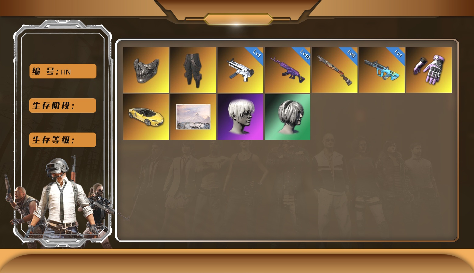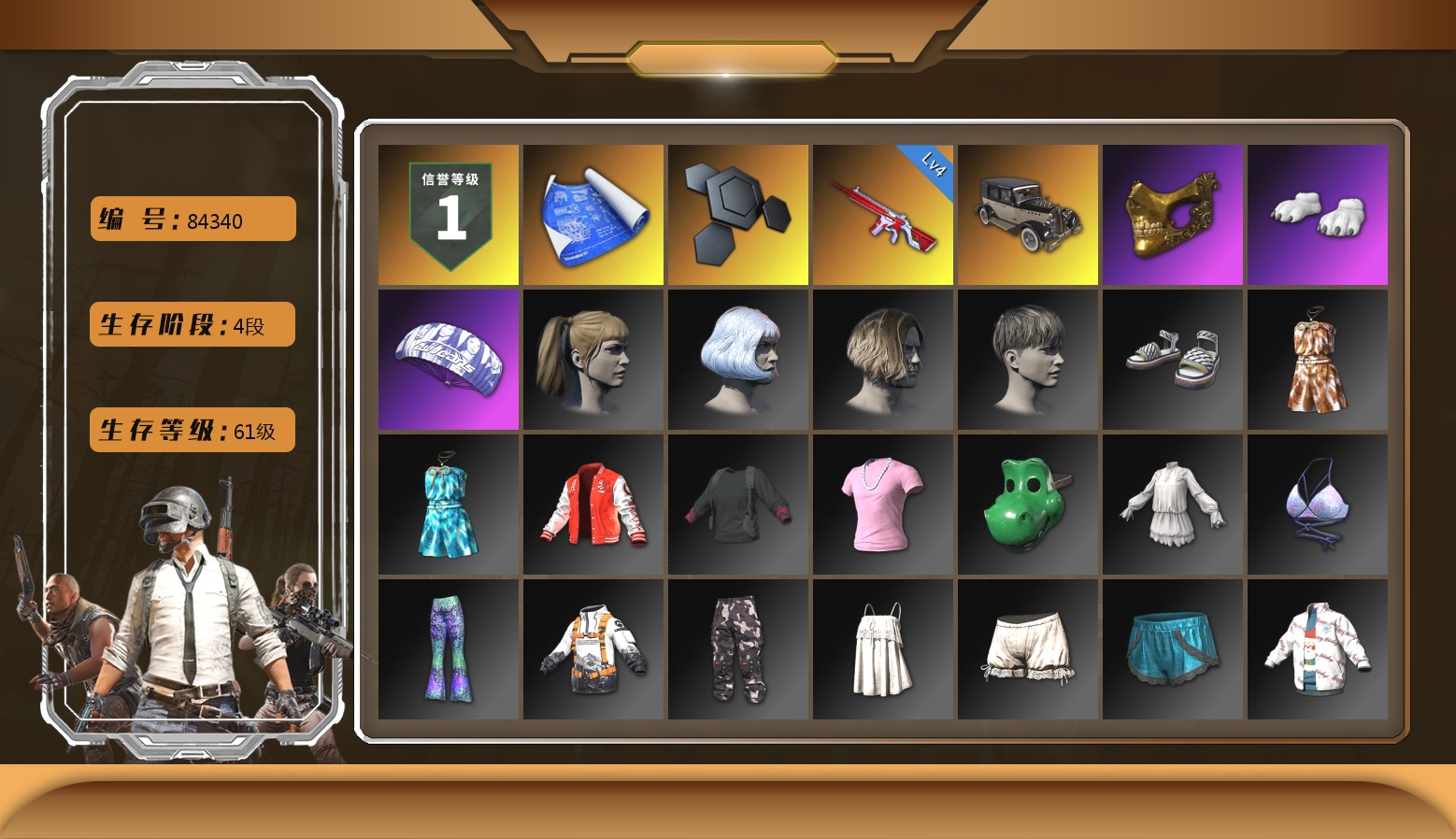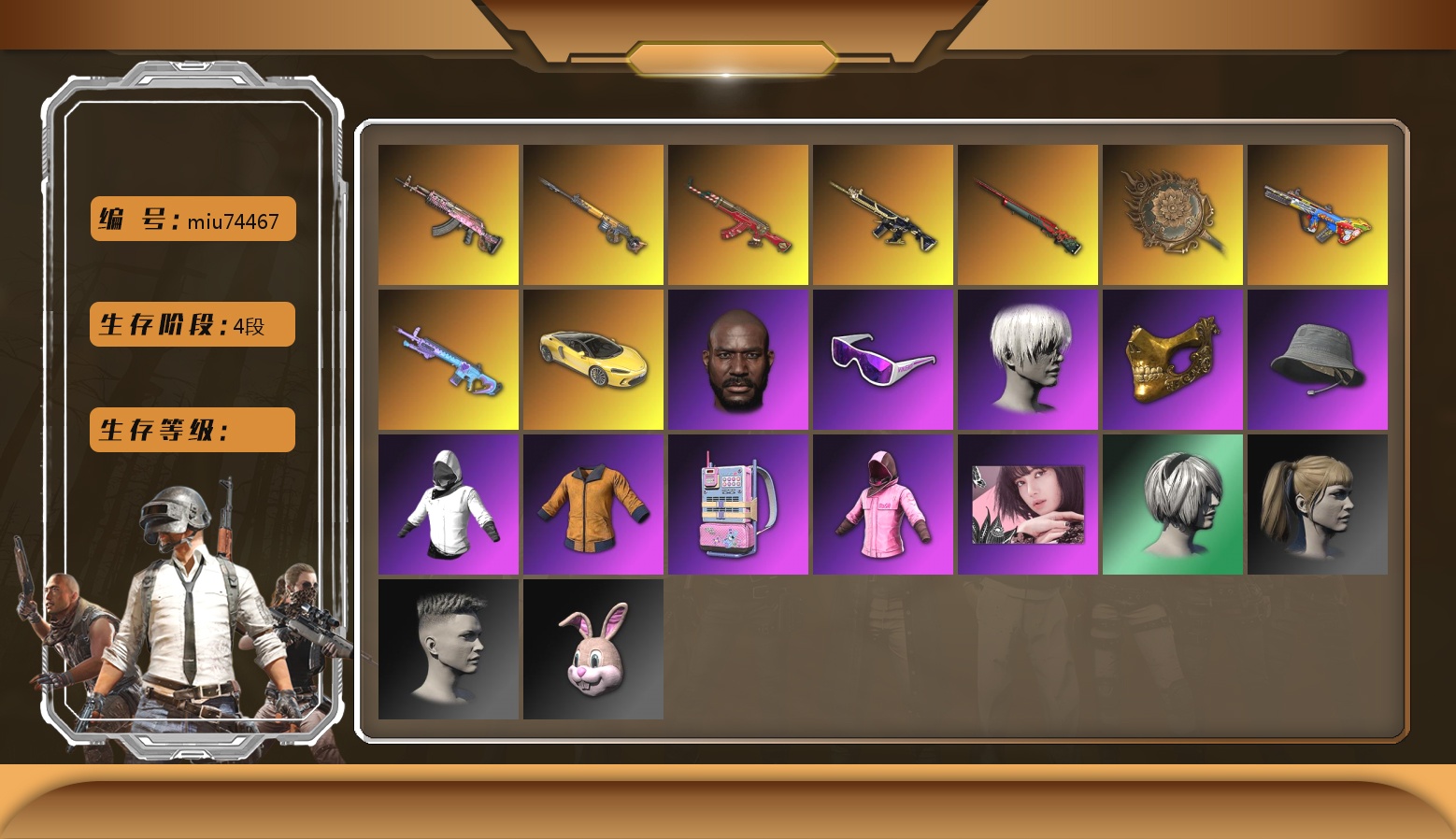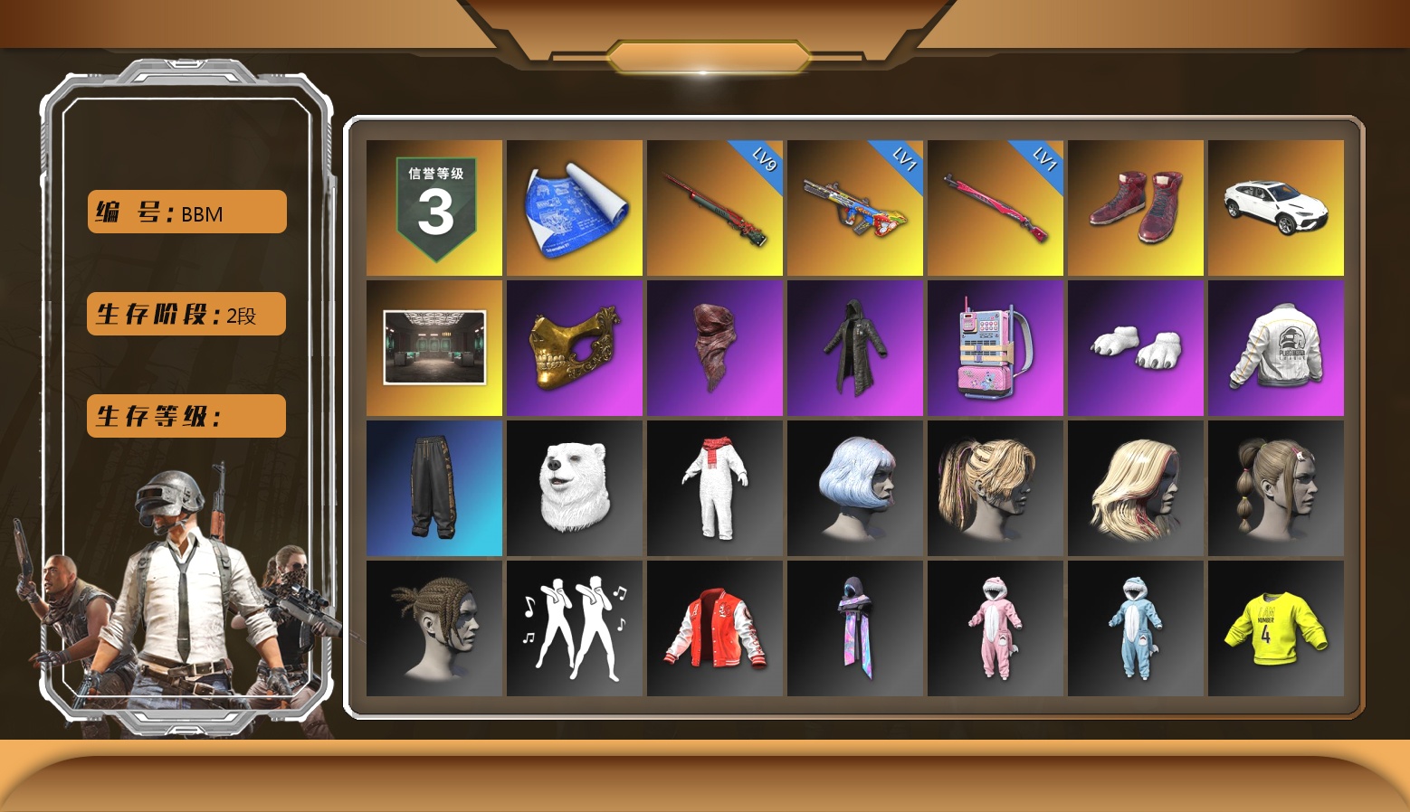 9级孙悟空M24 1级爆裂AUG 1级午夜惊魂98K 柏林鞋 兰博基尼SUV 交易所接待室 4张图纸 金面 红面巾 黑大衣 电磁背包 白熊鞋 拉风龙 西游记 脏辫 青海摇 小兔学院 绷带AK