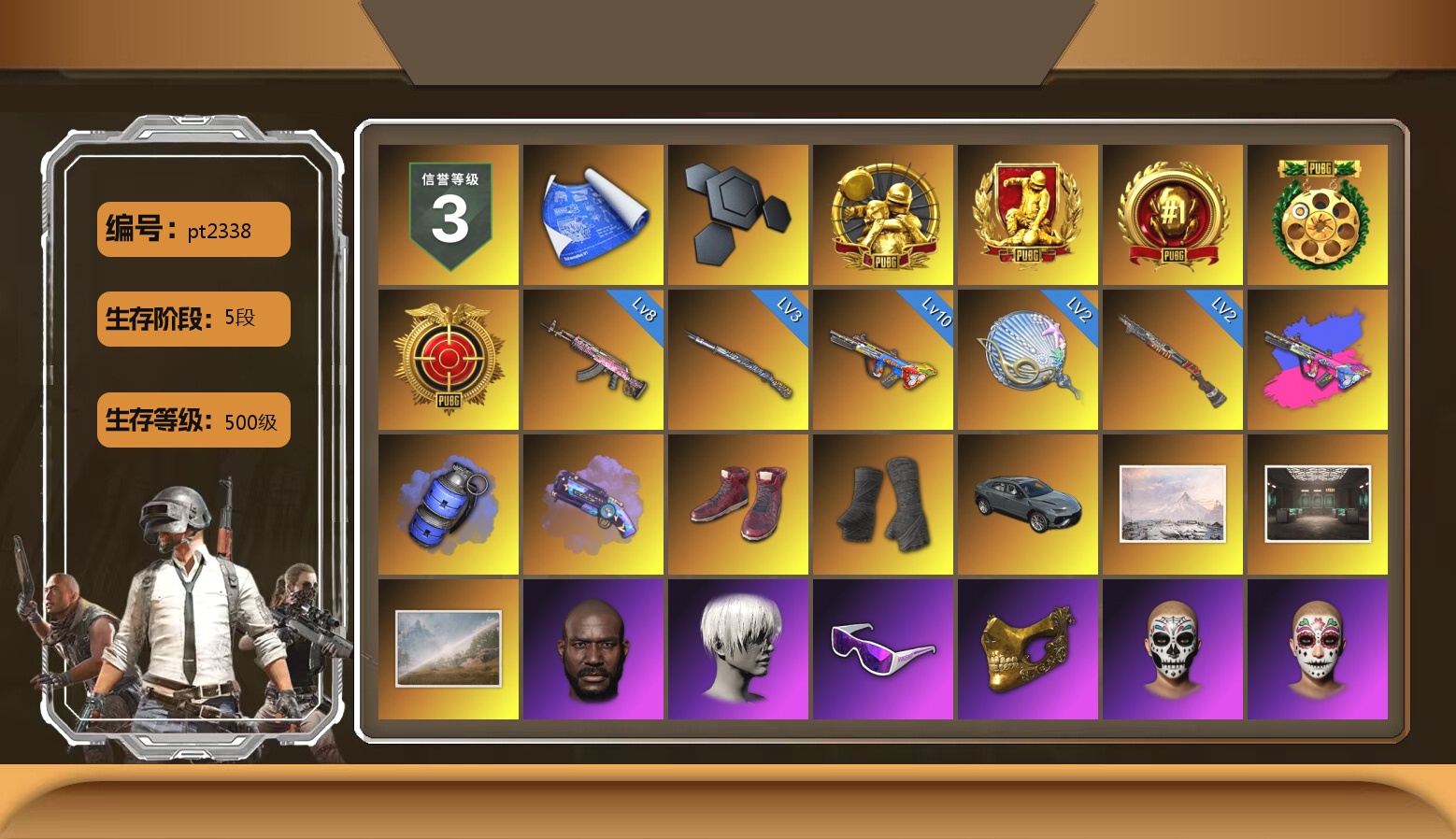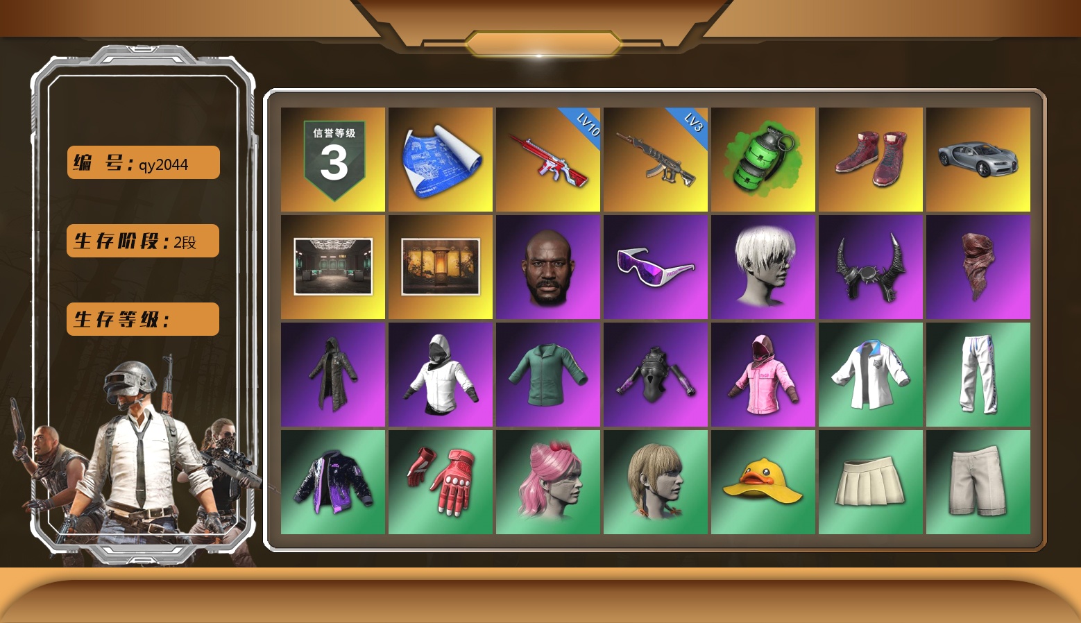10级无信号M4 3级妖魔之触ACE 翡翠色烟雾弹 柏林鞋 布加迪奢华版跑车 交易所接待室 武器神龛 9张图纸 黑鬼 滑雪镜 9s发型 牛角 红面巾 黑大衣 白战神 活动绿东 发光手臂 粉战神 阿狸 小黄鸭 尼尔 拉风龙 丸子头 青海摇 悲喜 枪炮洗礼