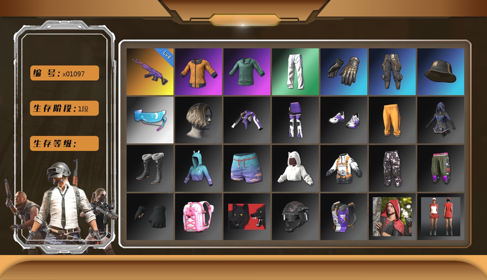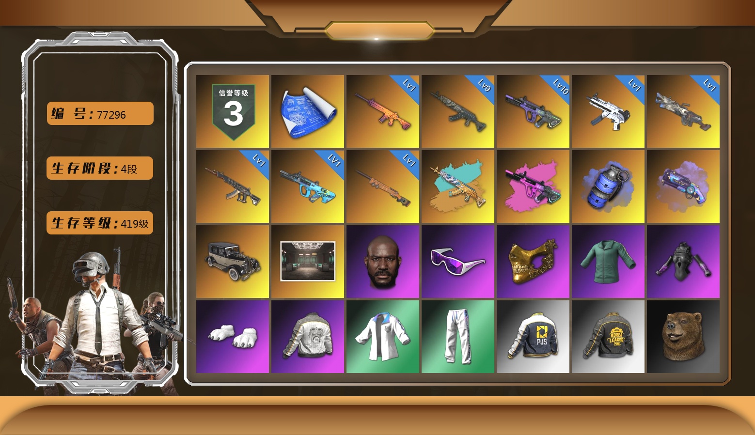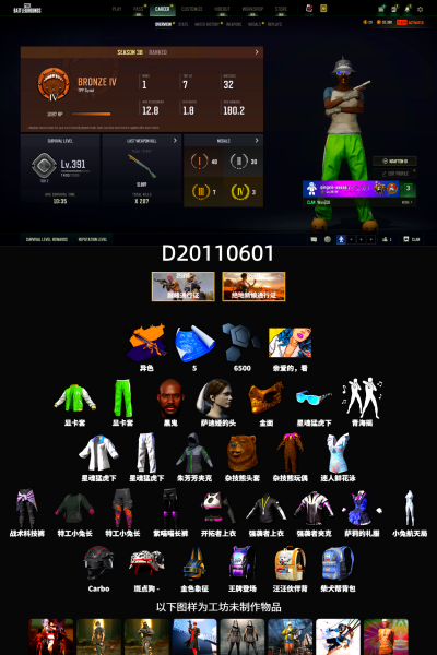 10级霓虹AUG 9级青龙762 1级南瓜M4 1级GD-AUG 1级妖魔之触ACE 1级无重力MP5K 1级刻耳柏洛斯M249 1级夜曲M24 青龙762(异色) 霓虹AUG(异色) 蓝色烟雾弹 紫色魔法迷雾-M79 4张图纸 交易所接待室 黑鬼 滑雪镜 金面 活动绿东 发光手臂 白熊鞋 小马尾 丸子头 青海摇 小兔学院 绷带AK 滑雪帽 PGC 2021套装 胜利之舞39