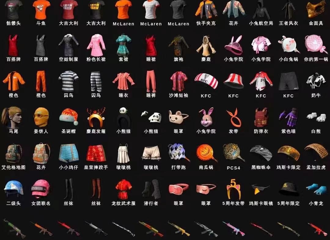 绿头尼尔新女团大厅斗鱼夹克 10级朱雀M4 10级青龙762 10级霓虹AUG 10级孙悟空M24 8级齿轮炮 6级圣诞AK 5级DBS 2级唐三藏平底锅 1级水麒麟 1级恶魔ACE 青龙762(异色) 圣诞AK(异色)