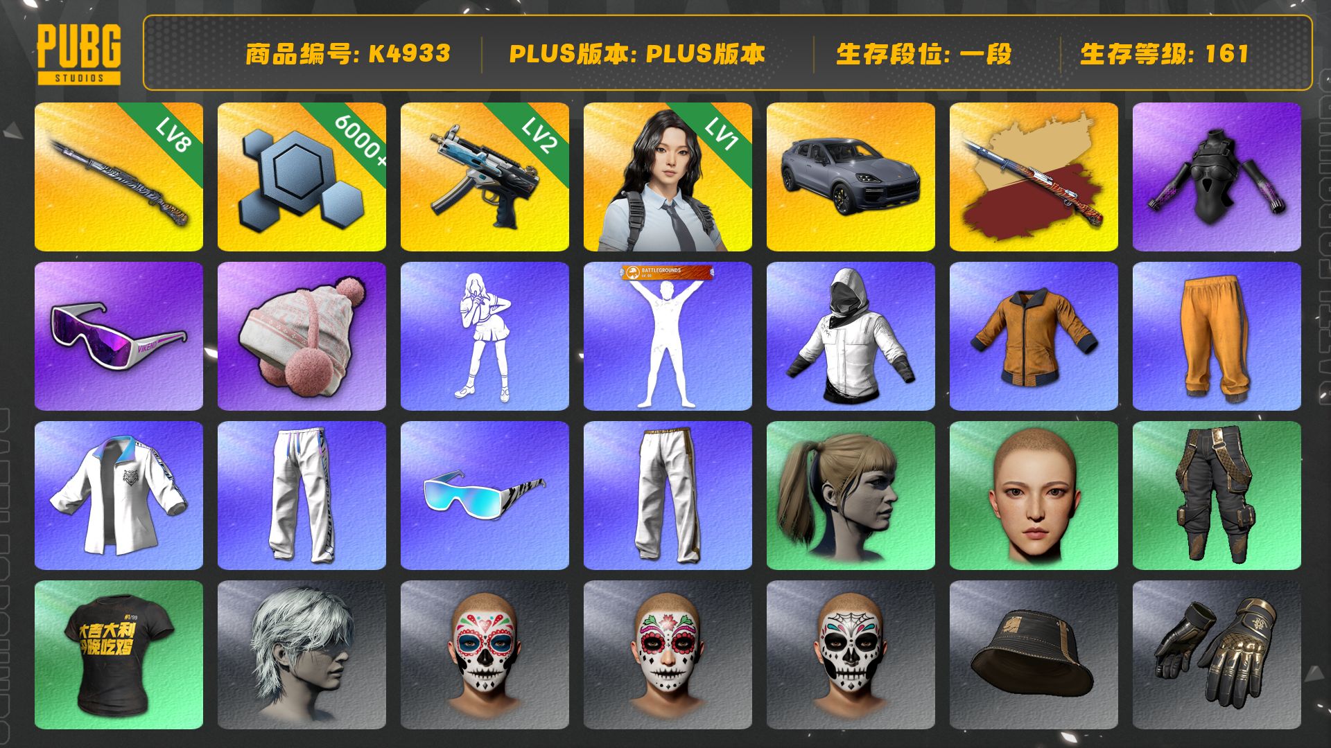[K4933]1段161级 信誉2 8级猛虎+异色 2级寒蚀 瀚娜 卡宴 白战神 黄东 小马尾 滑雪镜