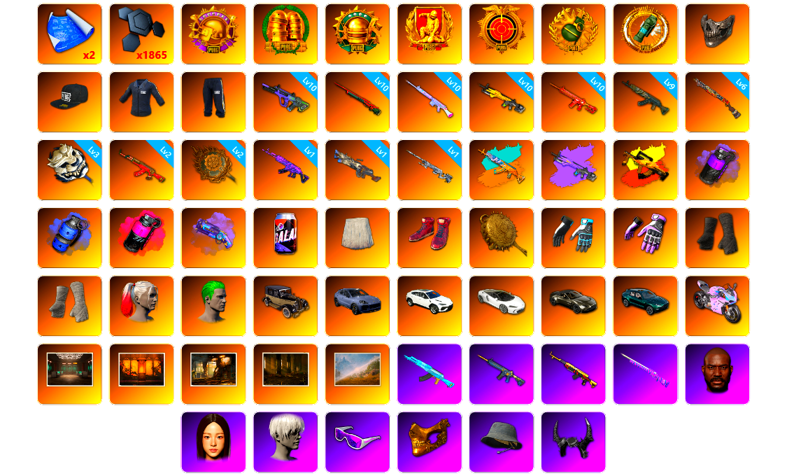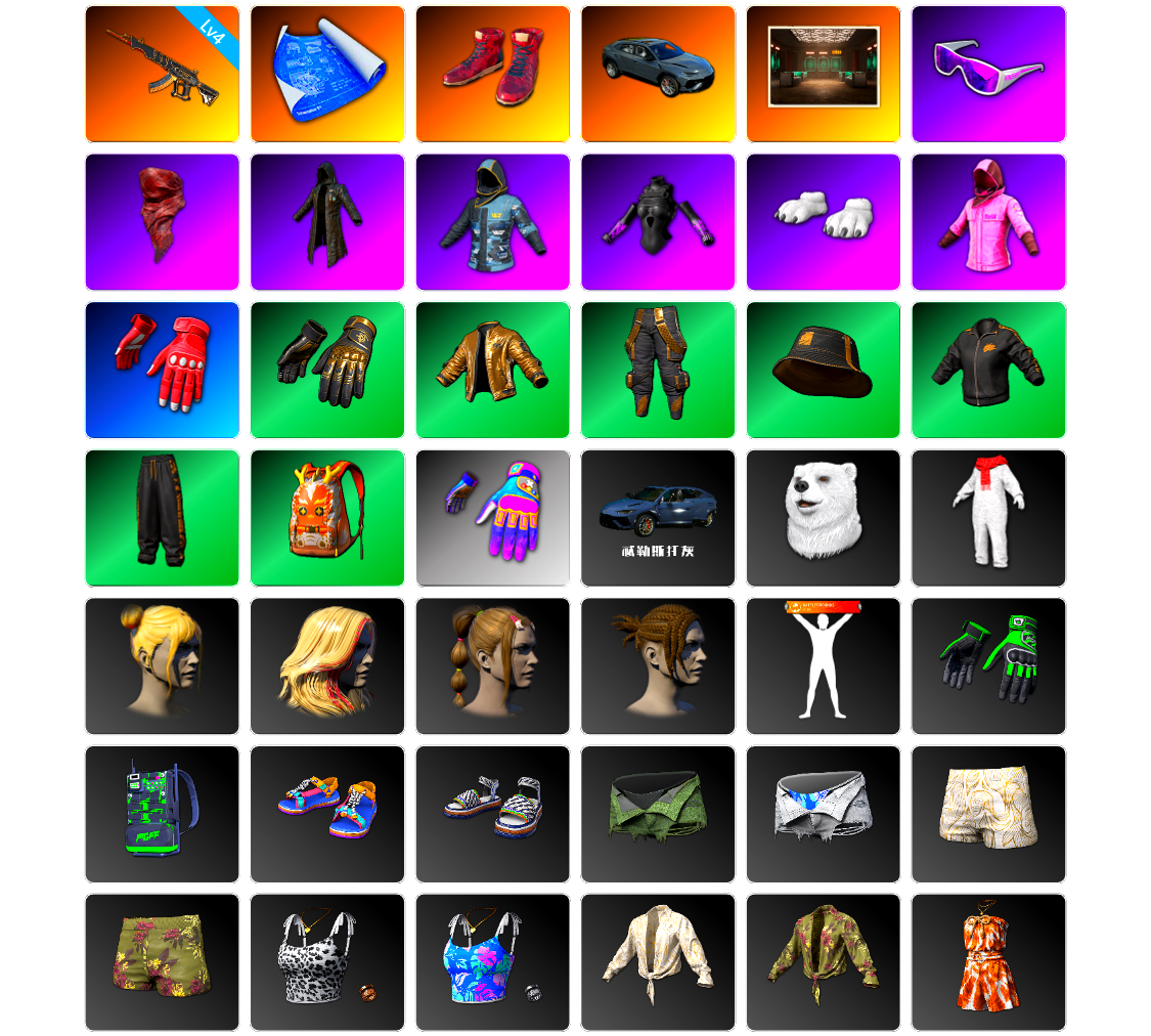 2张图纸 1865聚合物 收割者金标 捕食者金标 柏林面具 黑东 10级霓虹AUG 10级孙悟空M24 10级玩偶炮 10级小兔MK12 10级朱雀M4 9级青龙762 6级烈日灼烧-S1897 3级白虎锅 2级圣诞AK 2级唐三藏平底锅 1级美杜莎762 1级刻耳柏洛斯M249 1级幽影残魂AWM 青龙762(异色) 小兔MK12(异色) 冰域Groza(异色) 紫色烟雾弹 蓝色烟雾弹 品红色烟雾弹 紫色魔法迷雾-M79 小白裙 柏林鞋 柏林锅 大魔王 小黑盒 黑绷带 白绷带 小丑女 小丑男 保时捷卡宴 兰博基尼SUV 迈凯伦硅质白版 马丁跑车 马丁SUV 杜卡迪暮光粉 交易所接待室 武器神龛 玩具AK 黑鬼 MINJI 9s发型 滑雪镜 金面 渔夫帽 牛角 卡崔娜 丑男妆容 马东锡 橙色发带 红面巾 黑大衣 白战神 小战神 黄东 活动绿东 发光手臂 竞猜裤 电磁背包 白熊鞋 橙运动 监狱服 渐变装 小叮当 粉战神 阿狸 尼尔 布朗熊 拉风龙 鸡斯卡夹克 车漆 小马尾 小绿头 粉头 丸子头 西游记 脏辫 爱的主打歌 青海摇 小兔学院 悲喜 滑雪帽 胜利之舞39