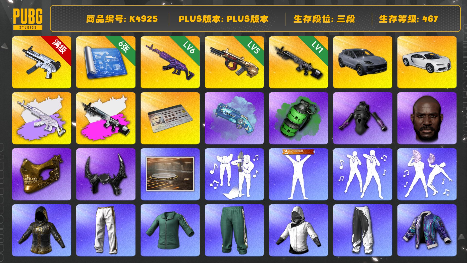 [K4925]3段467级 信誉4 6级无重力 6级美杜莎+白异色 5级牛头 1级暗影+异色 烟弹烟枪 改名卡 6图纸 保时捷卡宴 布加迪 金面 牛角 绿东