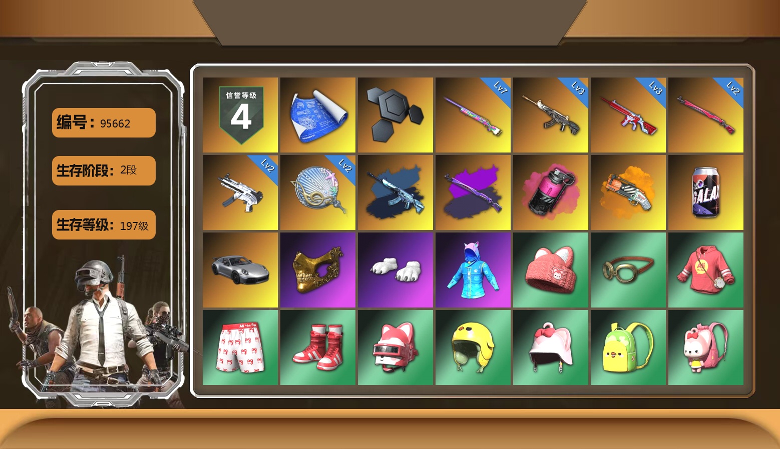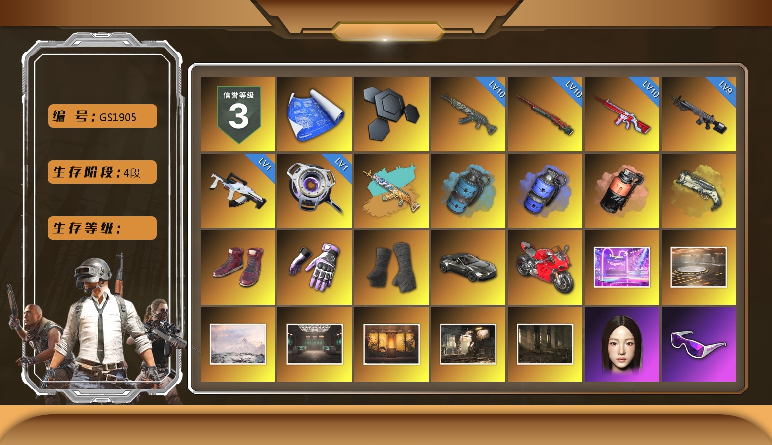 10级青龙762 10级孙悟空M24 10级无信号M4 9级暗影之主Mk12 1级冰域Groza 1级虚空使者 青龙762(异色) 天蓝色烟雾弹 珊瑚色烟雾弹 乳白狂怒之雾-M79 柏林鞋 小黑盒 黑绷带 马丁跑车 杜卡迪红 女团大厅 陈列室 冬季藏匿处 交易所接待室 武器神龛 5张图纸 5112聚合物 MINJI 滑雪镜 金面 牛角 红面巾 黑大衣 小战神 电磁背包 粉战神 2024女团 阿狸 布朗熊 拉风龙 小马尾 丸子头 西游记 小兔学院 悲喜 绷带AK PGC 2021套装