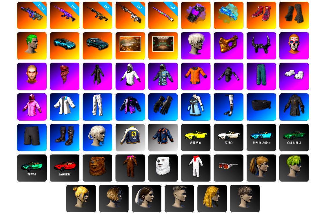 7级彩虹M24 3级无信号M4 3级恶魔ACE 2级无重力MP5K 2级塞壬平底锅 2级午夜惊魂98K 恶魔ACE(异色) 午夜惊魂98K(异色) 品红色烟雾弹 橙色狂怒之雾-M79 2张图纸 22178聚合物 保时捷911 金面 白熊鞋 小叮当 阿狸 小黄鸭 尼尔 拉风龙 脏辫 小兔学院 西游记