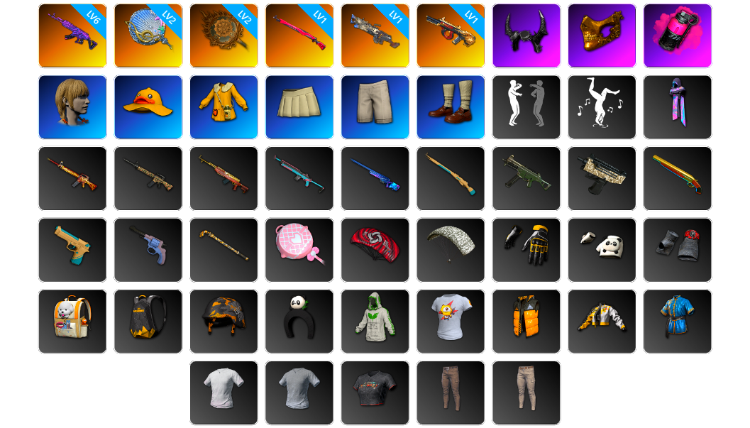 6级美杜莎762 2级塞壬平底锅 2级唐三藏平底锅 1级午夜惊魂98k 1级刻耳柏洛斯M249 1级弥诺陶洛斯AUG 牛角 金面 品红色烟雾弹 小黄鸭