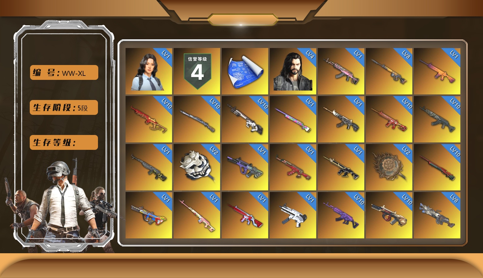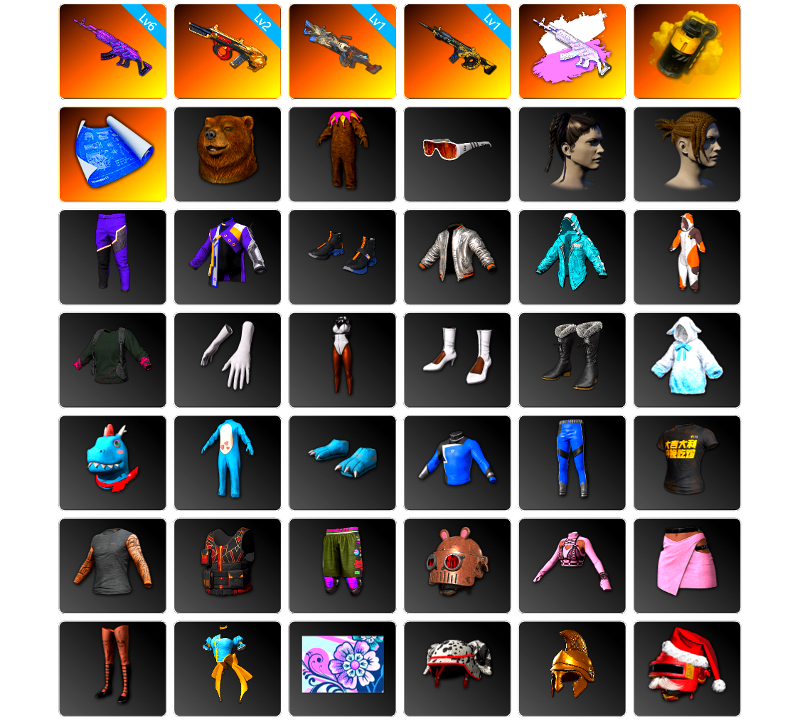 10级圣诞mini 10级猛虎98k 10级赛博MK12 10级朱雀M4 10级青龙762 10级孙悟空M24 10级美杜莎762 10级弥诺陶洛斯AUG 10级妖魔之触ACE 8级齿轮炮 6级刻耳柏洛斯M249 6级烈日灼烧-S1897 6级寒蚀MP5K 4级多利安 2级白虎锅 2级唐三藏平底锅 2级塞壬平底锅 1级瀚娜 1级火麒麟 1级南瓜M4 1级彩虹M24 1级恶魔ACE 1级玄武SKS 1级霓虹AUG 1级圣诞AK 1级猪八戒M4 1级爆裂AUG 1级德拉贡 1级无信号M4 1级无重力MP5K 1级魔咒之力Mk12 1级GD-AUG 青龙762(异色) 美杜莎(异色) 弥诺陶洛斯AUG(异色) 孙悟空M24(异色) M249(异色) 唐三藏(异色) 塞壬 - 平底锅(异色) S1897(异色) 寒蚀MP5K(异色) 青色烟雾弹 黄色狂怒之雾-M79 蓝色魔法迷雾-M79 柏林鞋 黑绷带 小丑女 小丑男 帕拉梅拉 保时捷911 保时捷卡宴 布加迪奢华版跑车 兰博基尼跑车 兰博基尼奢华版 迈凯伦硅质白版 杜卡迪红 女团大厅 交易所接待室 武器神龛 37张图纸 黑鬼 MINJI 9s发型 滑雪镜 金面 渔夫帽 牛角 丑男妆容 马东锡 橙色发带 红面巾 黑大衣 白战神 黄东 活动绿东 发光手臂 白熊鞋 小叮当 粉战神 2024女团 滑雪帽 阿狸 小黄鸭 可可 尼尔 拉风龙 小马尾 丸子头 西游记 脏辫 爱的主打歌 青海摇 小兔学院 悲喜 绷带AK