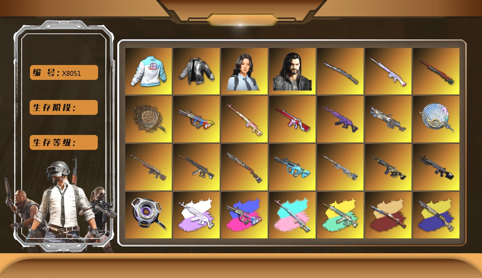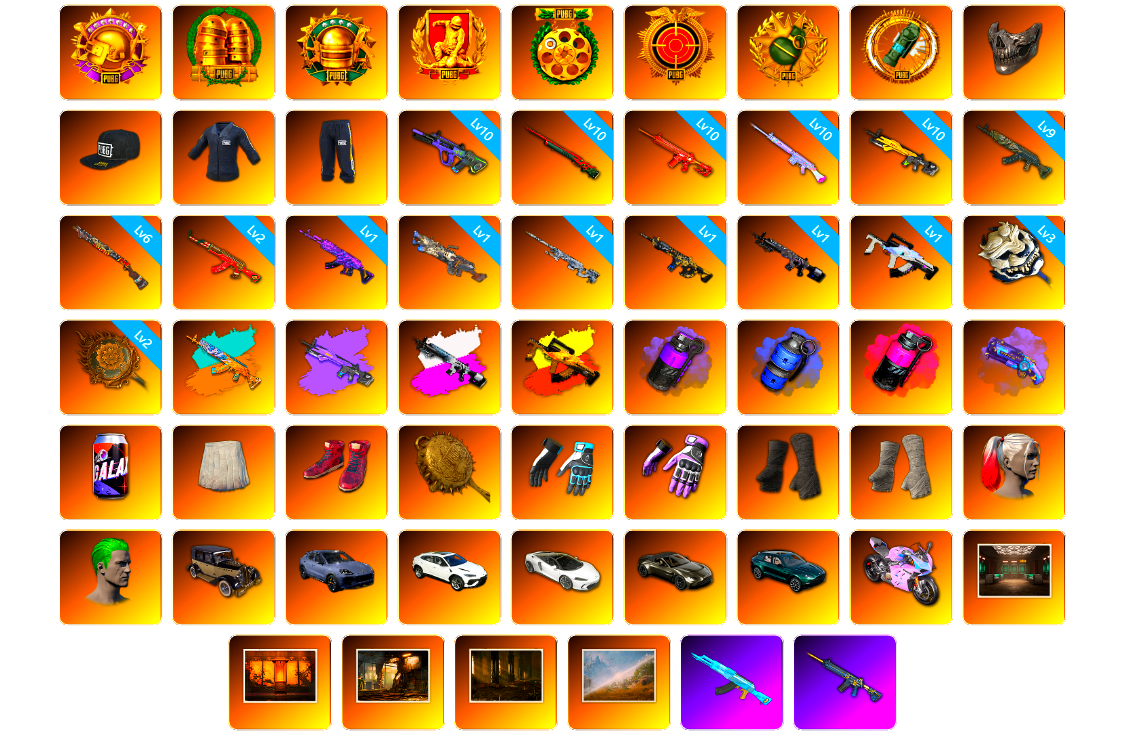 收割者金标 捕食者金标 柏林面具 黑东 10级霓虹AUG 10级孙悟空M24 10级朱雀M4 10级玩偶炮 10级小兔MK12 9级青龙762 6级烈日灼烧-S1897 2级圣诞AK 1级美杜莎762 1级刻耳柏洛斯M249 1级幽影残魂AWM 1级时空使者M4 1级暗影之主Mk12 1级冰域Groza 3级白虎锅 2级唐三藏平底锅 青龙762(异色) 小兔MK12(异色) 暗影之主Mk12(异色) 冰域Groza(异色) 紫色烟雾弹 蓝色烟雾弹 品红色烟雾弹 紫色魔法迷雾-M79 小白裙 柏林鞋 柏林锅 大魔王 小黑盒 黑绷带 白绷带 小丑女 小丑男 保时捷卡宴 兰博基尼SUV 迈凯伦硅质白版 马丁跑车 马丁SUV 杜卡迪暮光粉 交易所接待室 武器神龛 玩具AK 黑鬼 MINJI 9s发型 滑雪镜 金面 渔夫帽 牛角 卡崔娜 丑男妆容 马东锡 橙色发带 红面巾 黑大衣 白战神 小战神 黄东 活动绿东 发光手臂 竞猜裤 电磁背包 白熊鞋 橙运动 监狱服 渐变装 小叮当 粉战神 阿狸 尼尔 布朗熊 拉风龙 鸡斯卡夹克 车漆 小马尾 小绿头 粉头 丸子头 西游记 脏辫 爱的主打歌 青海摇 小兔学院 悲喜 滑雪帽 胜利之舞39