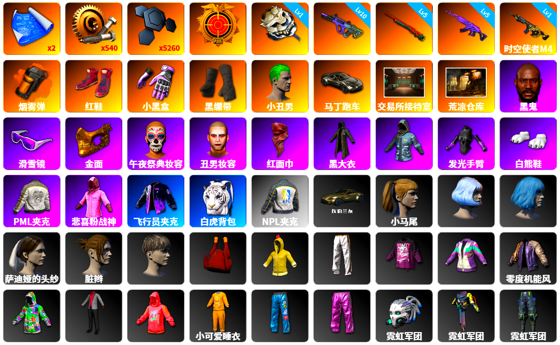 2张图纸 蜗牛币 5260聚合物 1级白虎锅 10级霓虹AUG 5级孙悟空M24 5级美杜莎762 1级时空使者M4 橘色烟雾弹 柏林鞋 小黑盒 黑绷带 小丑男 马丁跑车 交易所接待室 黑鬼 滑雪镜 金面 丑男妆容 红面巾 黑大衣 小战神 发光手臂 白熊鞋 粉战神 小马尾 脏辫 悲喜 西游记