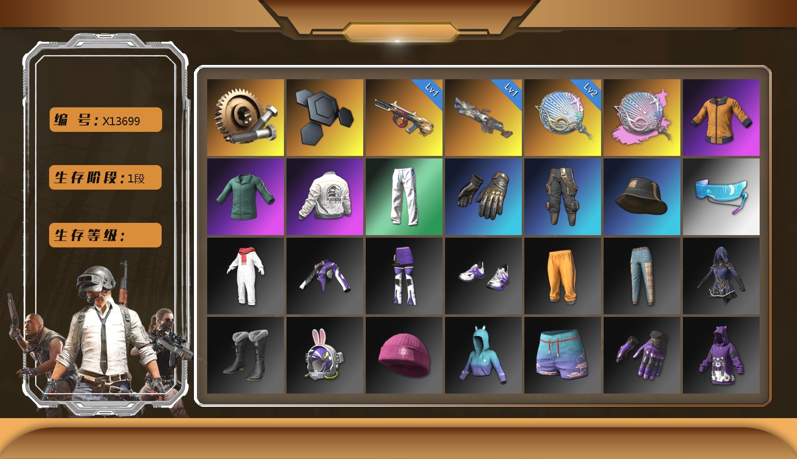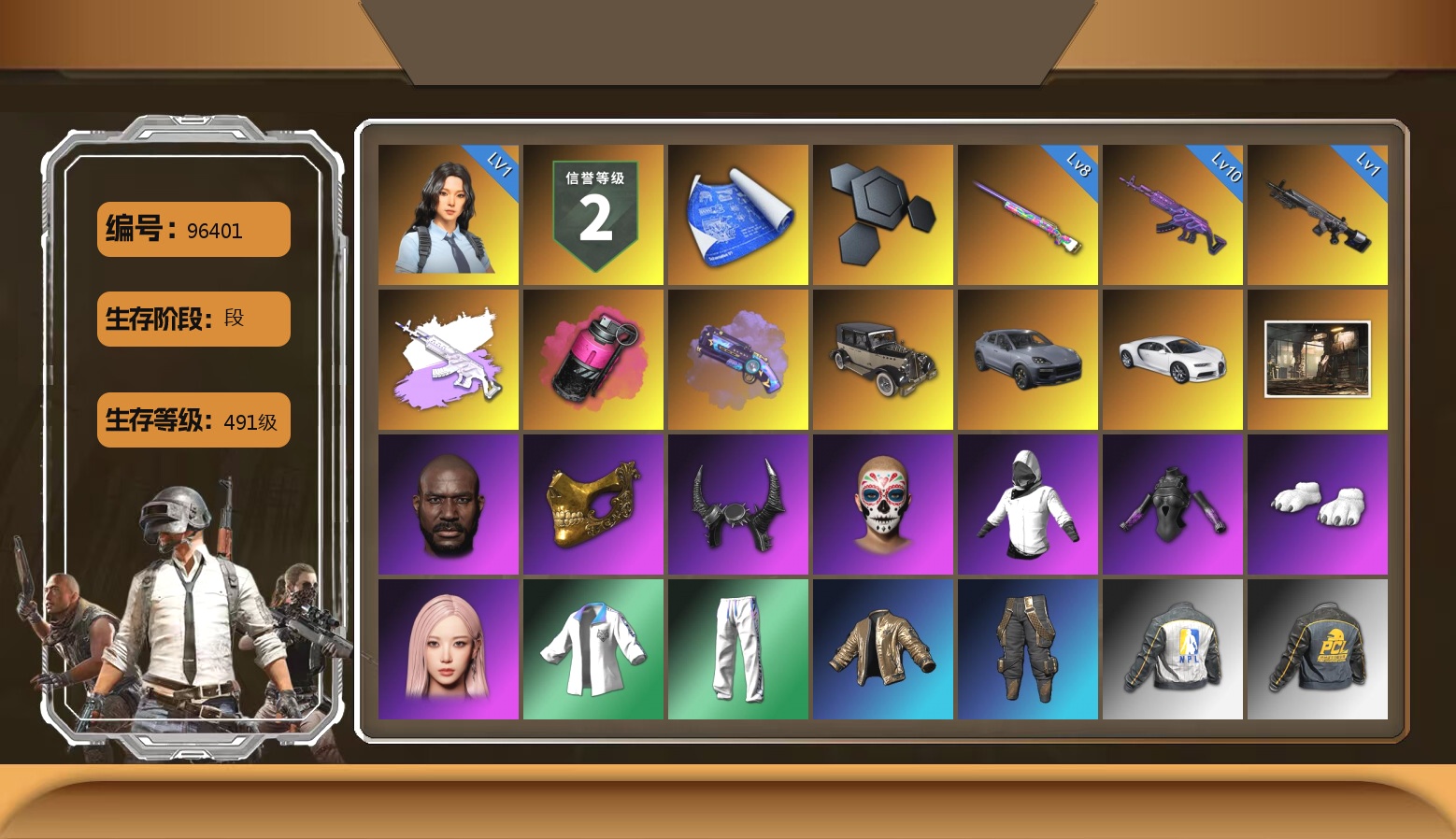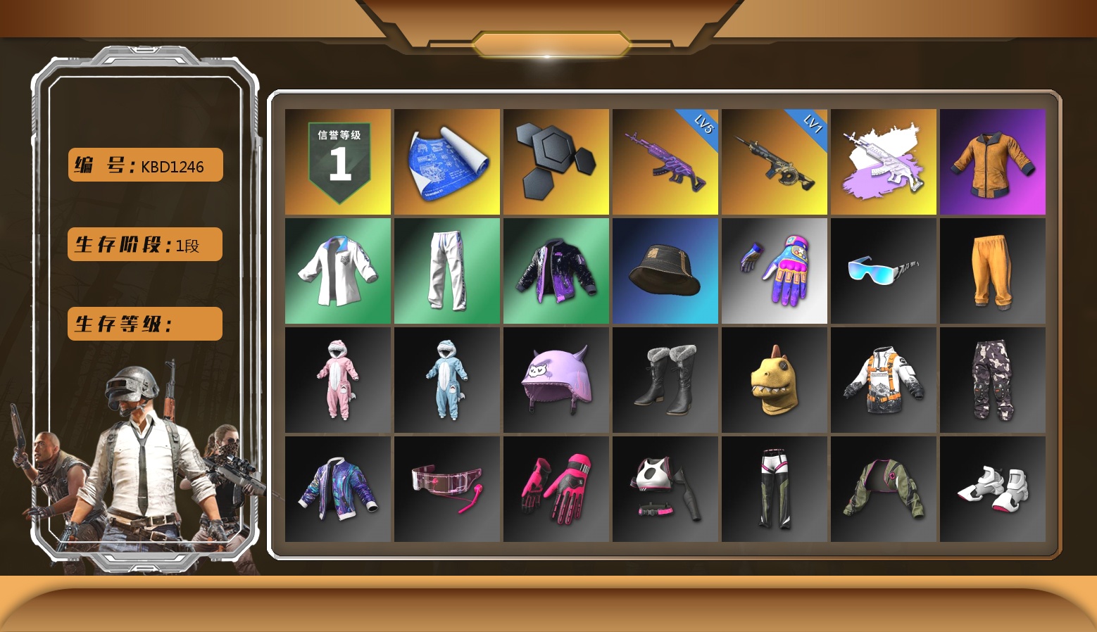 3张图纸 蜗牛币 2370聚合物 收割者金标 9级青龙762 6级朱雀M4 1级时空使者M4 1级猛虎98k 时空使者M4(异色) 保时捷卡宴 黑鬼 滑雪镜 橙色发带 发光手臂 竞猜裤 白熊鞋 粉头 绷带AK 西游记 滑雪帽