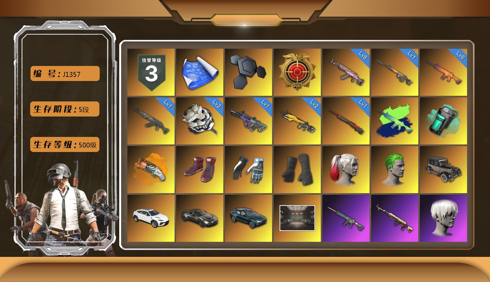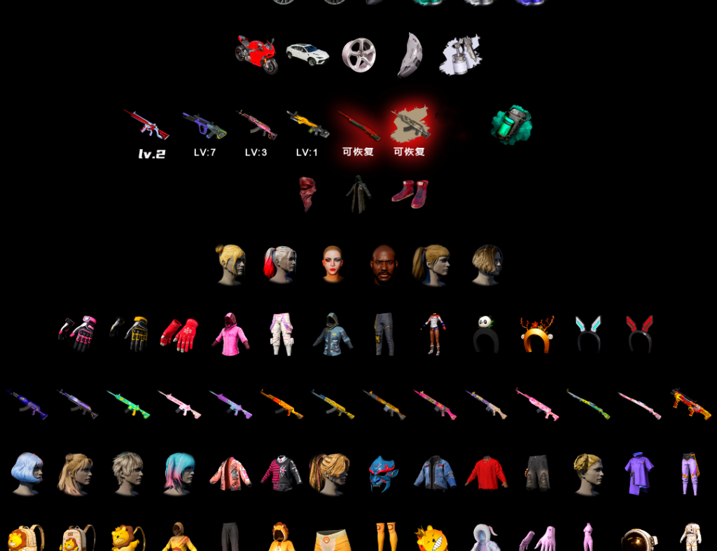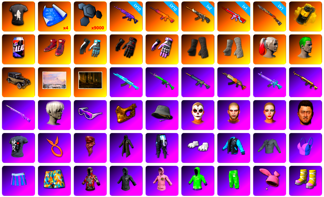 7张图纸 5836聚合物 8级火麒麟 6级南瓜M4 2级白虎锅 2级小兔MK12 1级齿轮炮 1级青龙762 1级霓虹AUG 1级孙悟空M24 南瓜M4(异色) 青色烟雾弹 橙色狂怒之雾-M79 柏林鞋 大魔王 黑绷带 小丑女 小丑男 兰博基尼SUV 马丁跑车 马丁SUV 交易所接待室 9s发型 丑男妆容 黑鬼 牛角 金面 渔夫帽 橙色发带 红面巾 黑大衣 白战神 发光手臂 电磁背包 白熊鞋 青蛙套 粉战神 尼尔 车漆 小马尾 丸子头 西游记 脏辫 小兔学院 悲喜